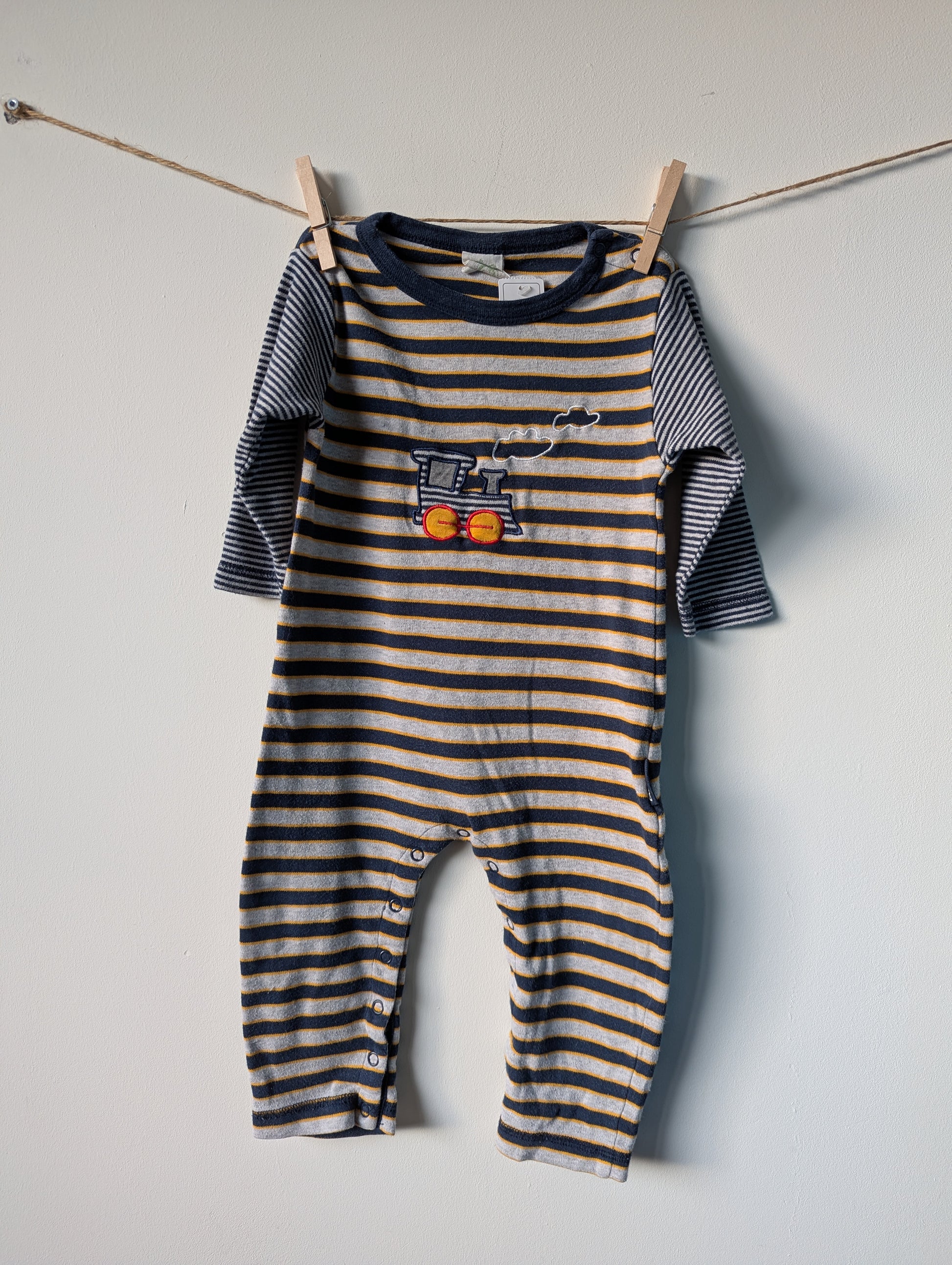 Gestreept boxpakje met trein. Met grijs, geel en donkerblauw. knoopjes bij benen voor t verschonen, in mooie staat.