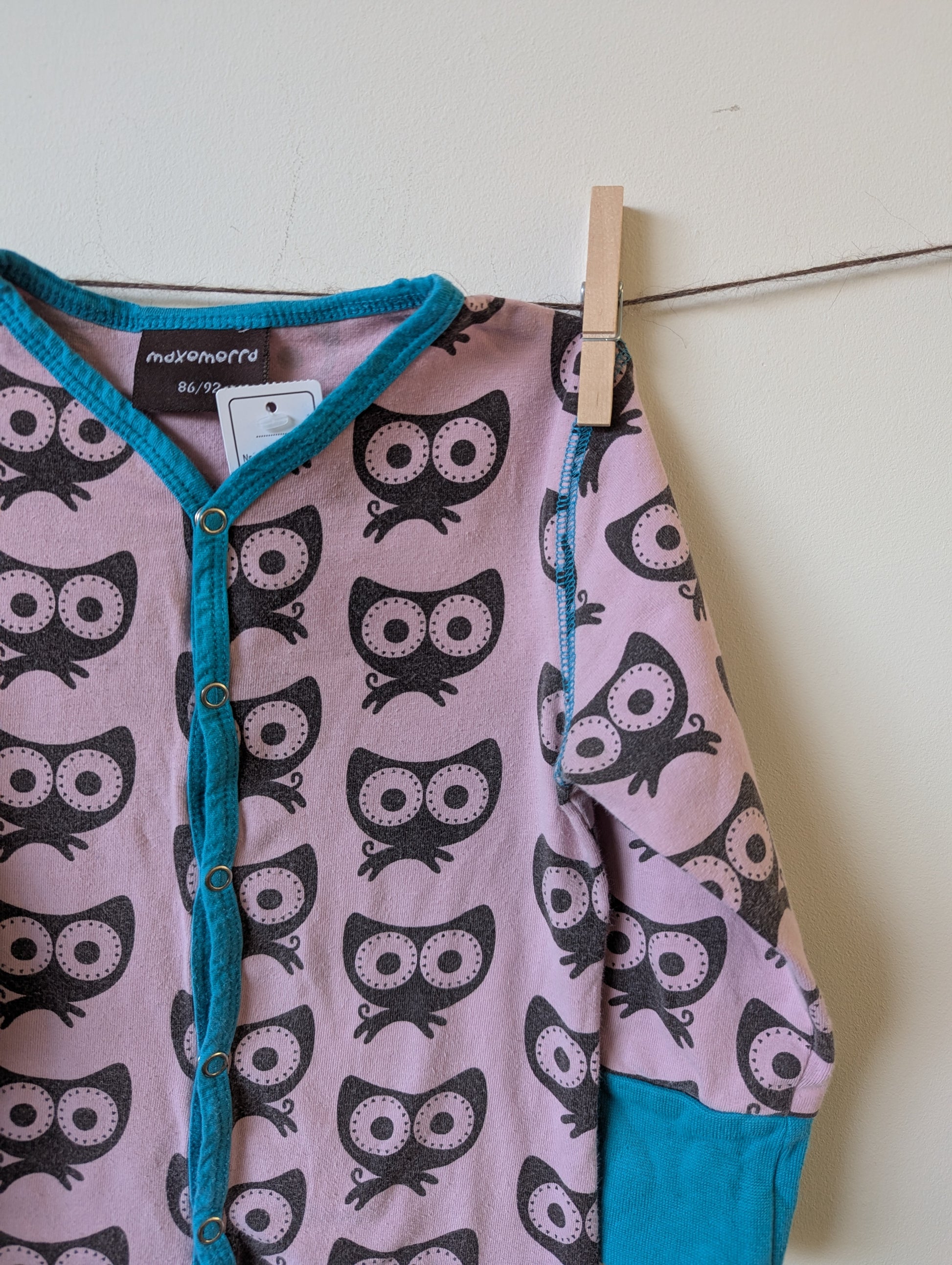Lichtroze boxpakje met blauw/turquoise boordjes. Met katten.