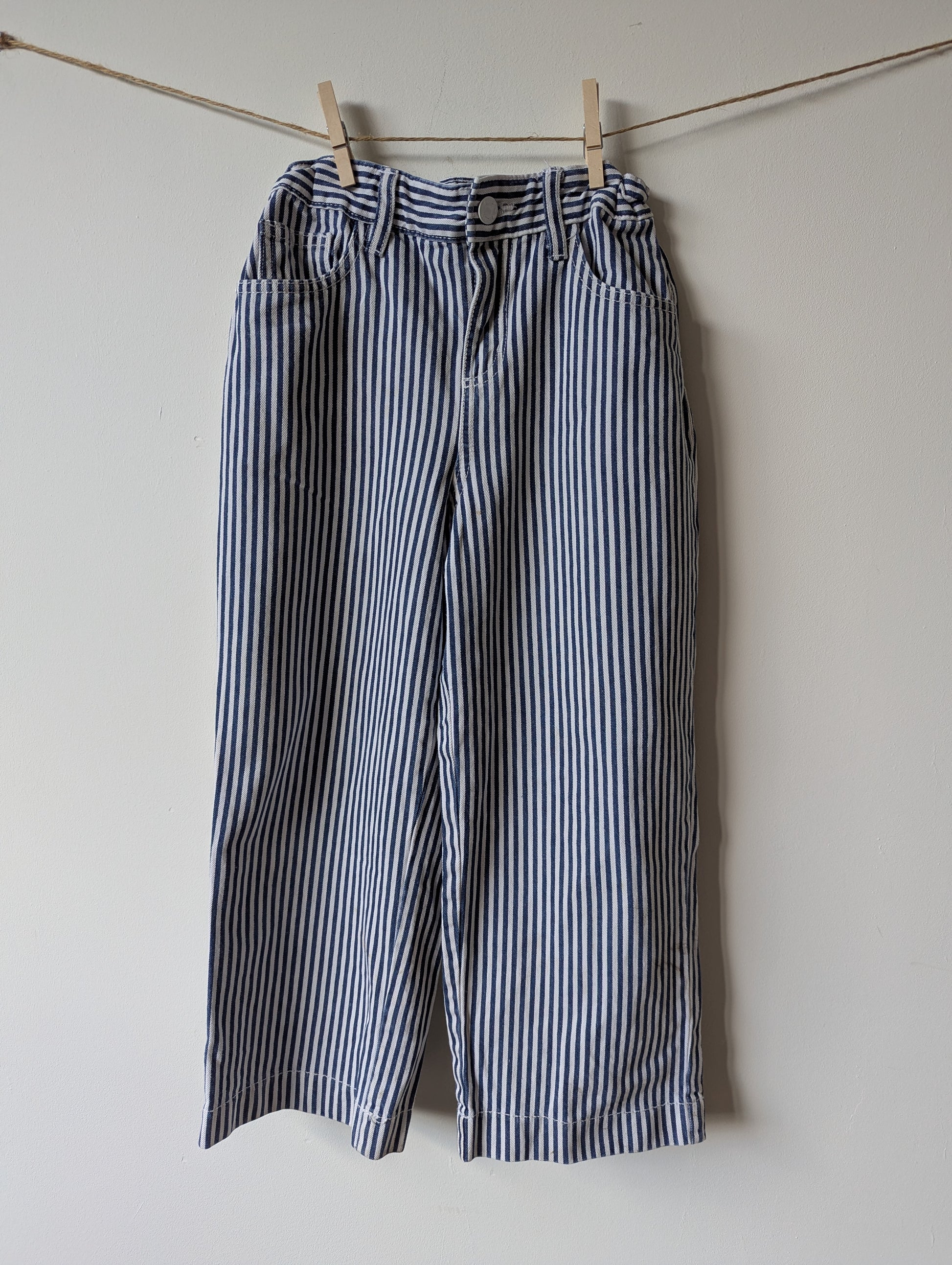 Stevige broek met blauw witte streep. Zitten elastieken in zodat hij strakker gezet kan worden.