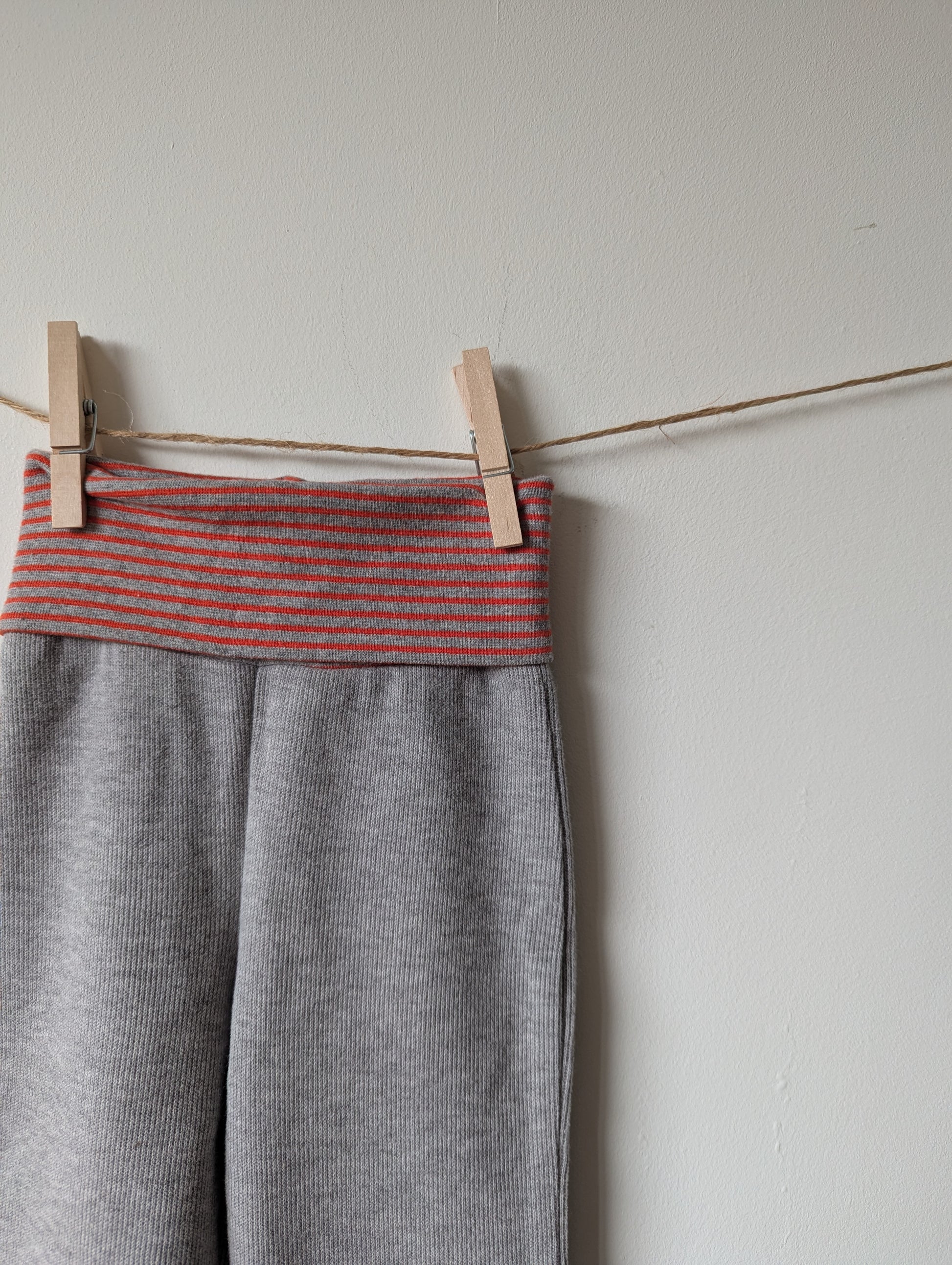 Broek waarbij je de heupband en enkelbandjes om kan slaan. Lang te dragen dus. In heel mooie staat. Grijs met rode streepjes.
