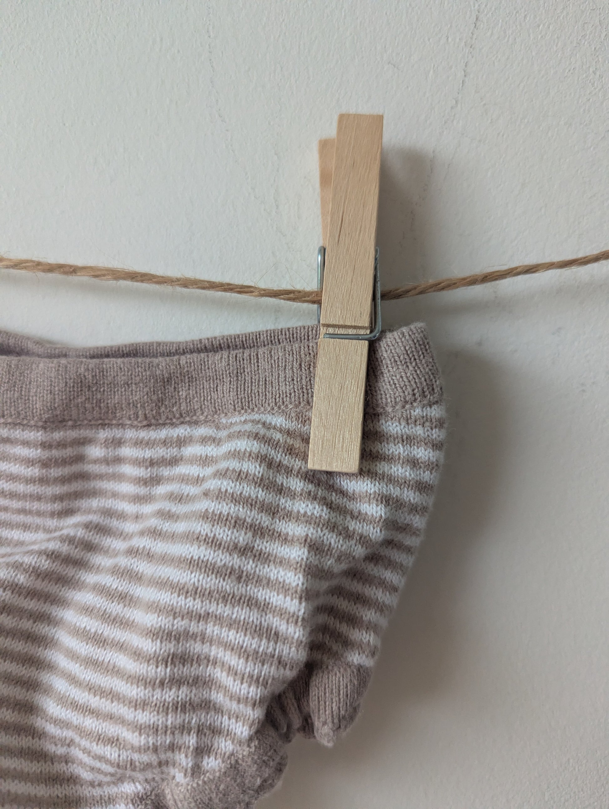 Schattig broekje, leuk voor over een maillot ofzo. Of in de zomer natuurlijk heerlijk om alleen aan te hebben, wit met taupe kleur gestreept.