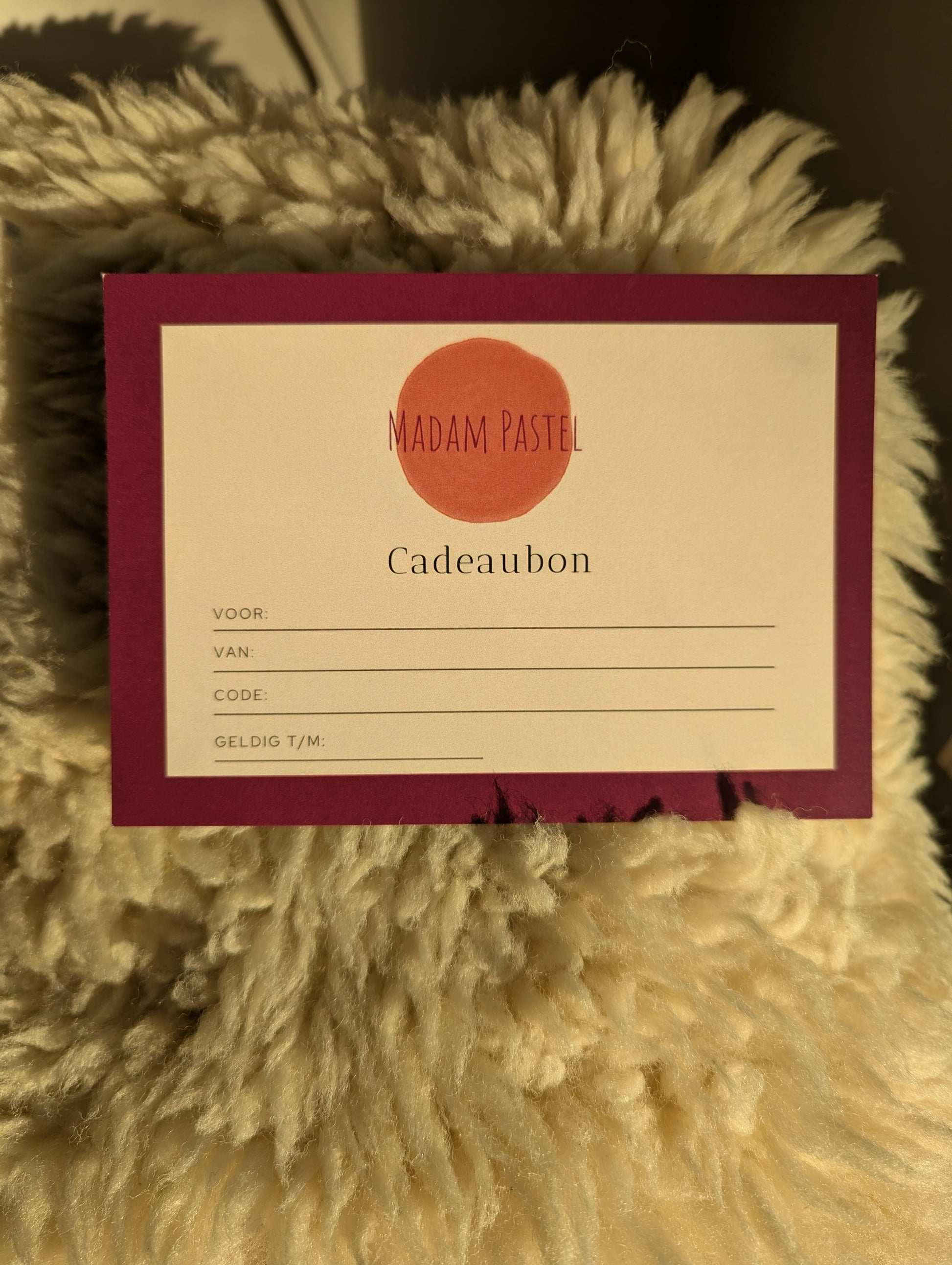 Een mooie luxe cadeaubon van Madam Pastel. Dit is een fysieke bon en stuur ik dus op in een envelop. Naar jou huis of naar het huis van de ontvanger. Voor de feestdagen komt er een mooie gouden envelop omheen. Je kunt het adres + eventueel bericht zetten als je het hokje aanvinkt ik wil dit als cadeau versturen.