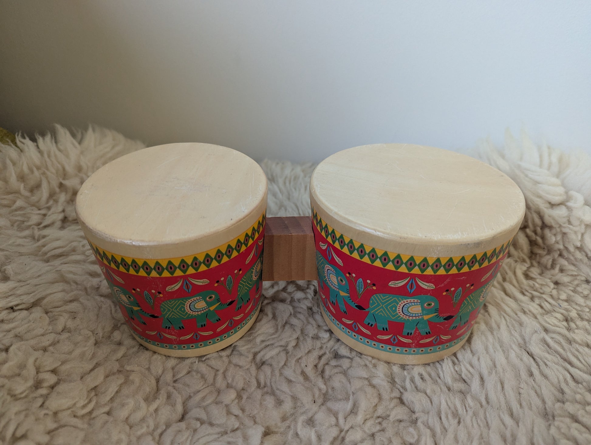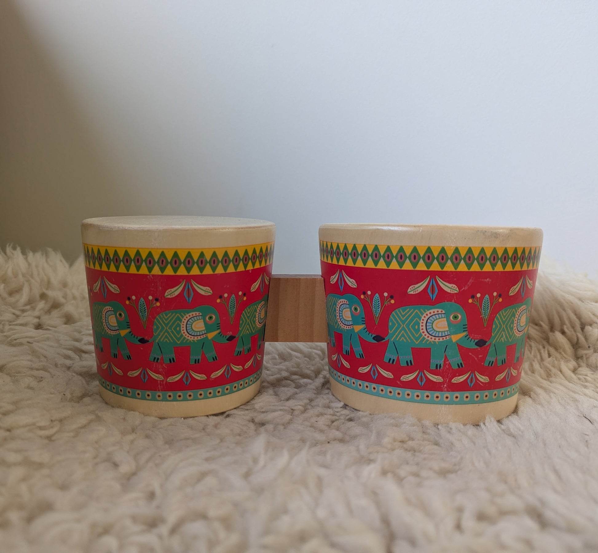 Bongo's met olifanten. Rood en groen. Gebruikssporen!