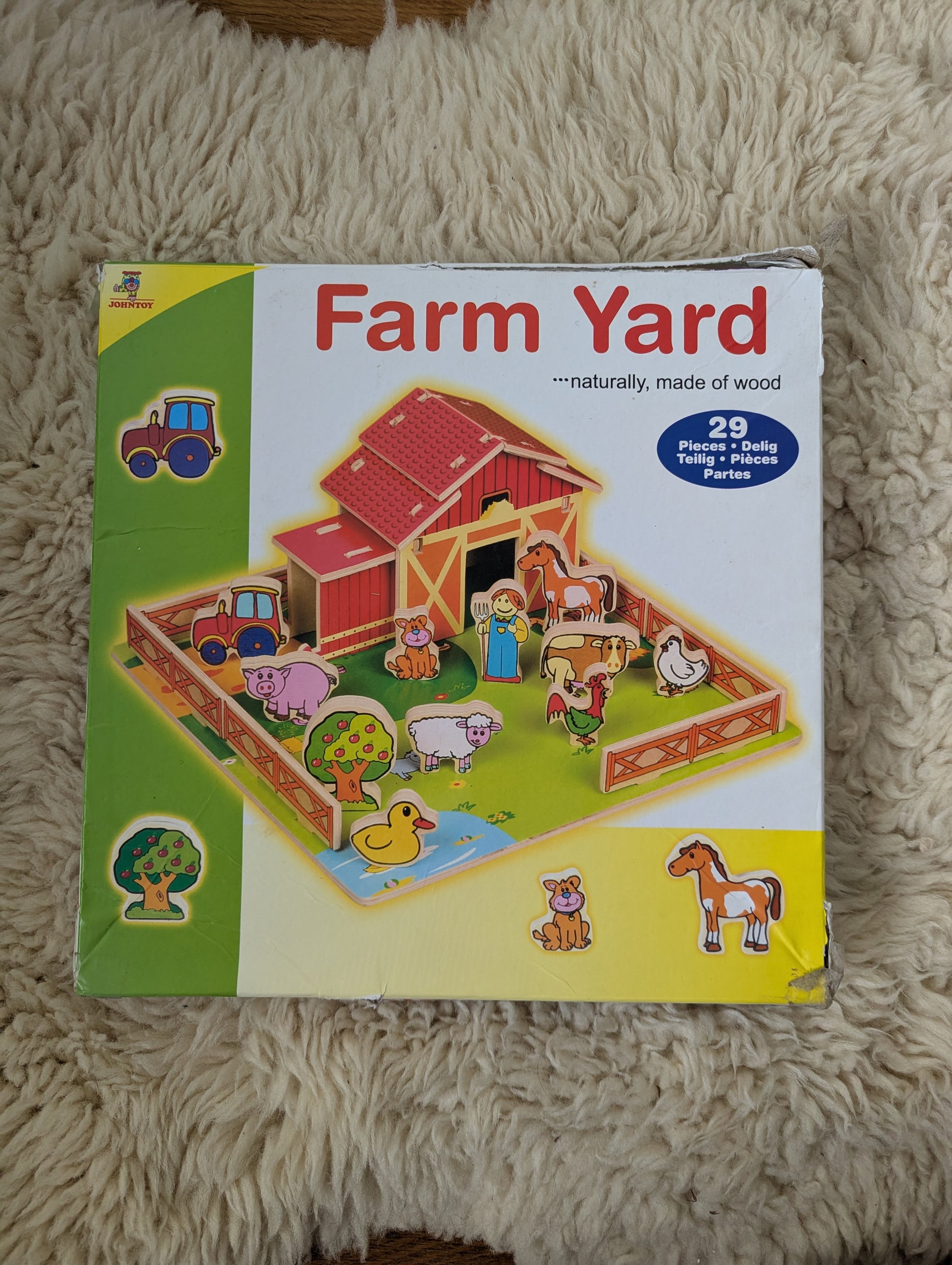 29 delige houten boerderij set. Dit kun je in elkaar zetten. Soort puzzel maar dan 3d. Echt om lekker mee te spelen. De doos ziet er verschrikkelijk uit, maar de boerderij zelf is nog in goede staat.