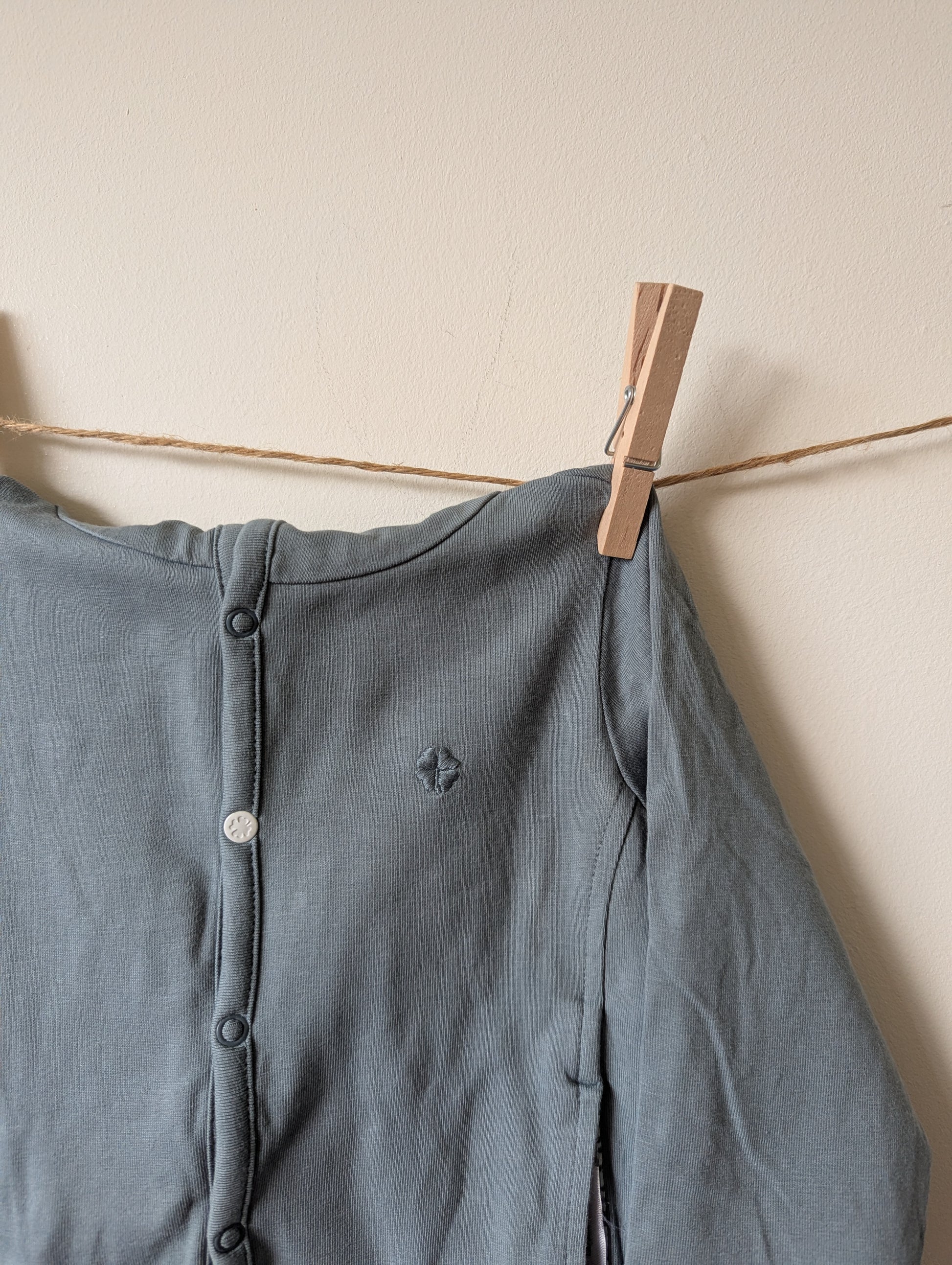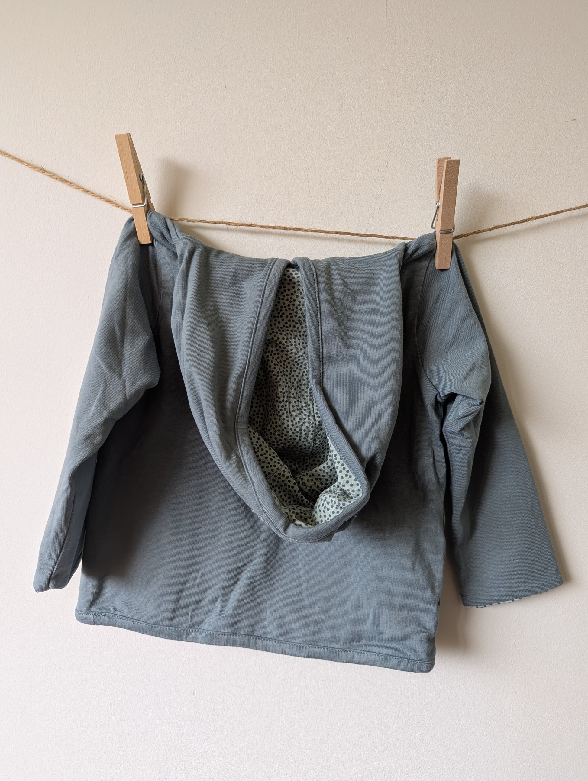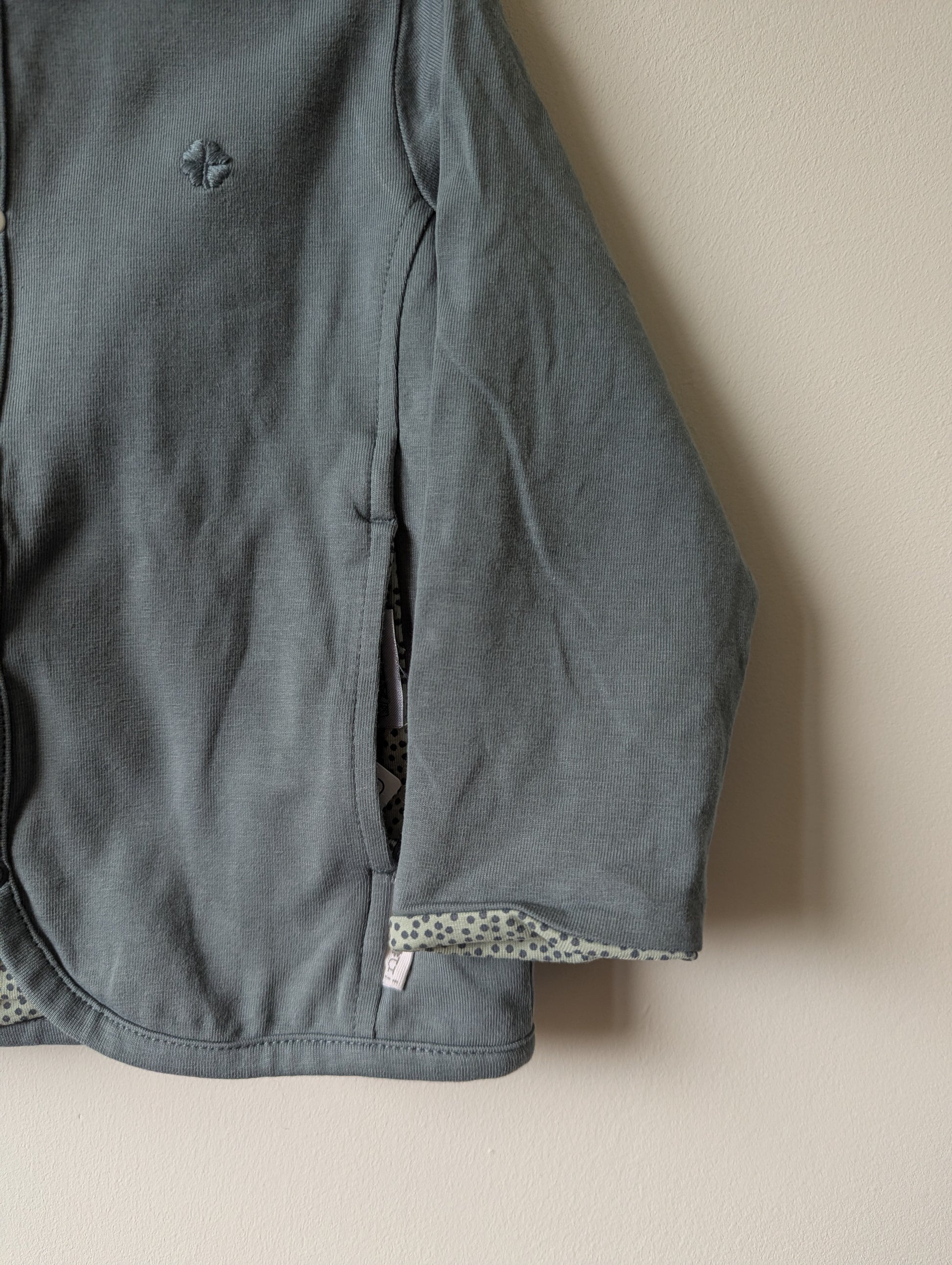 Kleur is grijsblauw en binnenkant mint met grijze stippen. Het leuke van deze jasjes is dat je ze ook binnenstebuiten kunt dragen.
