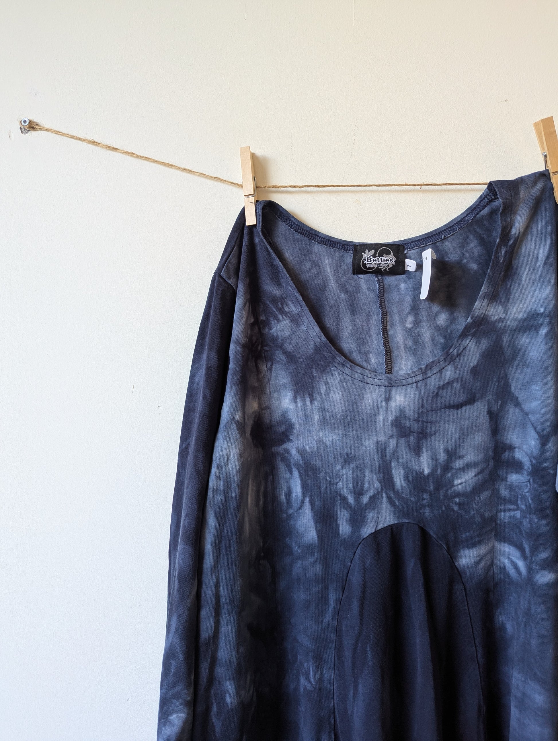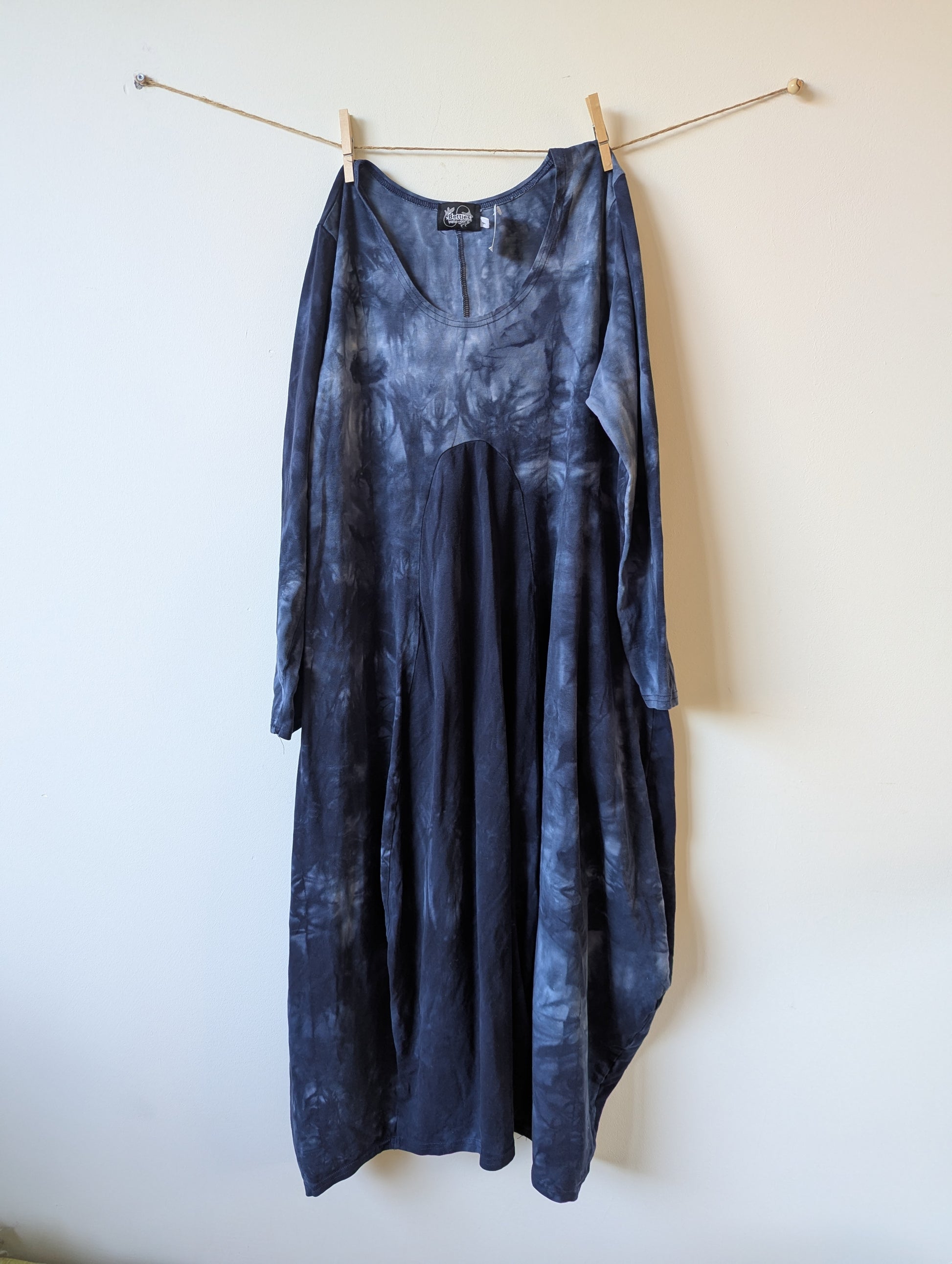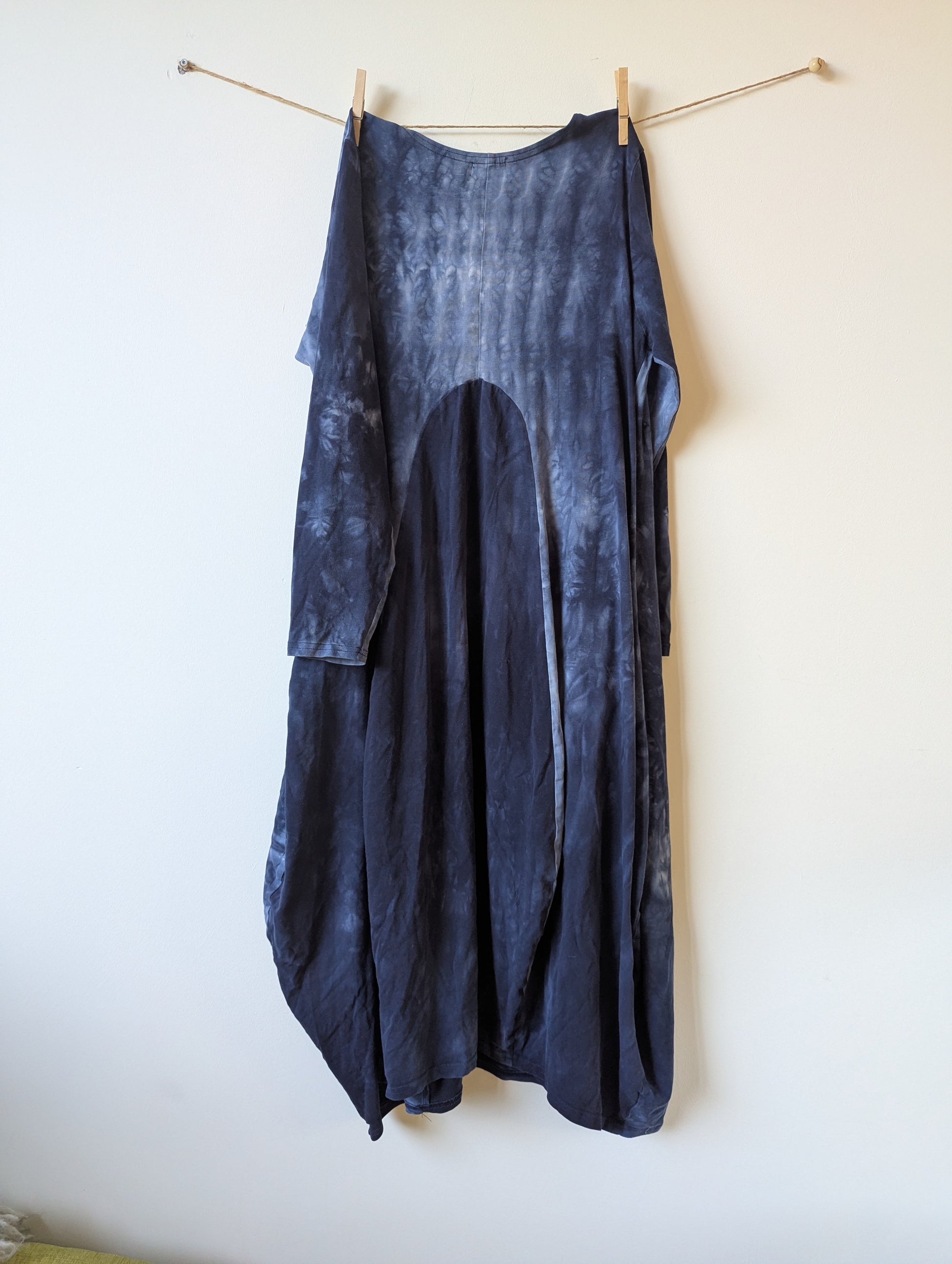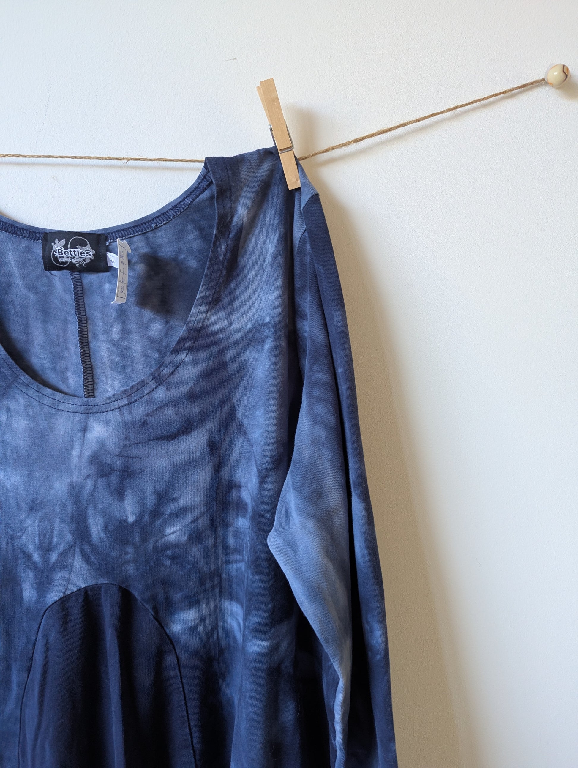 Lange jurk met donkerblauw en lichtblauw batic. Ronde hals en heeft zakken!