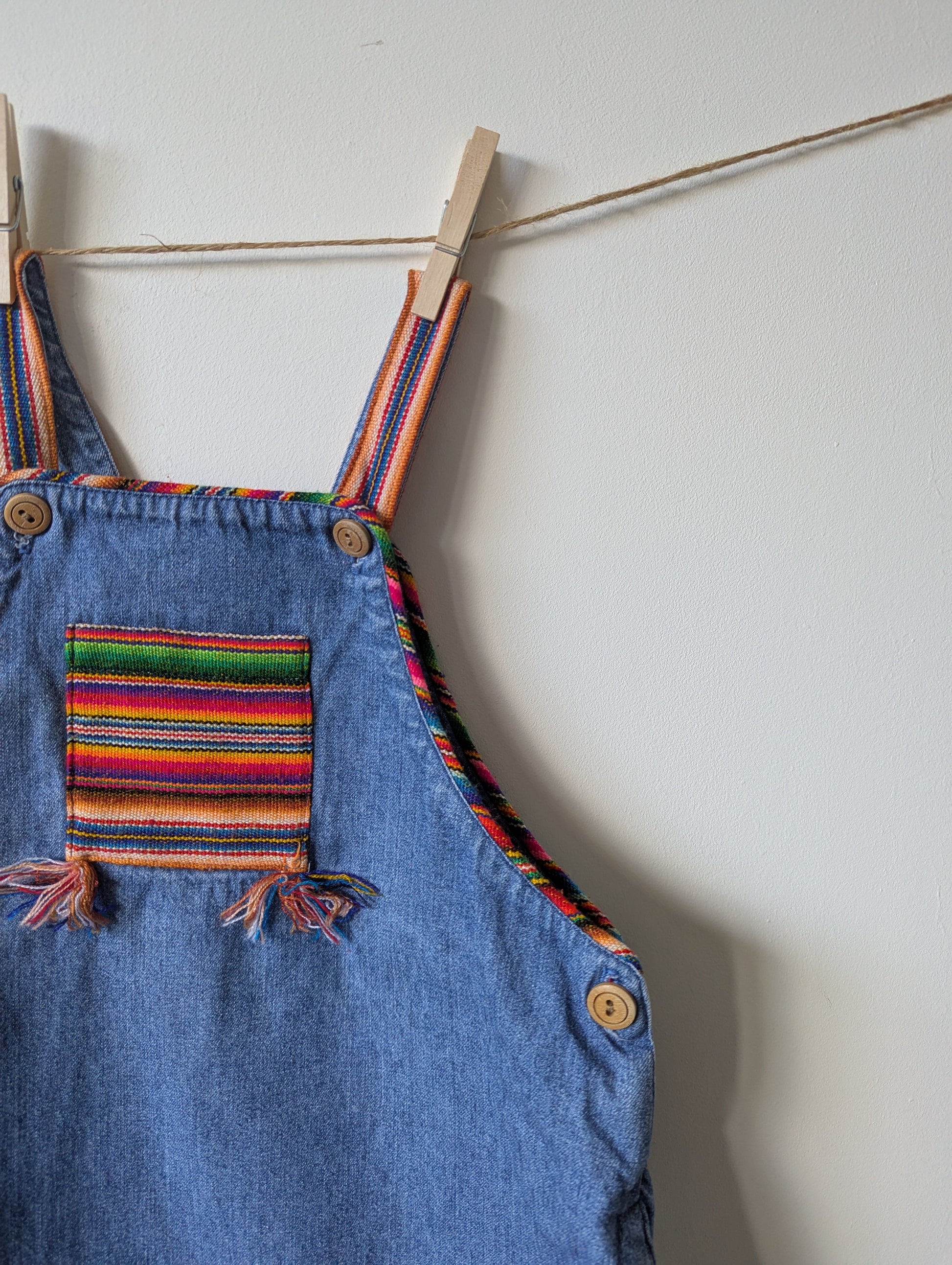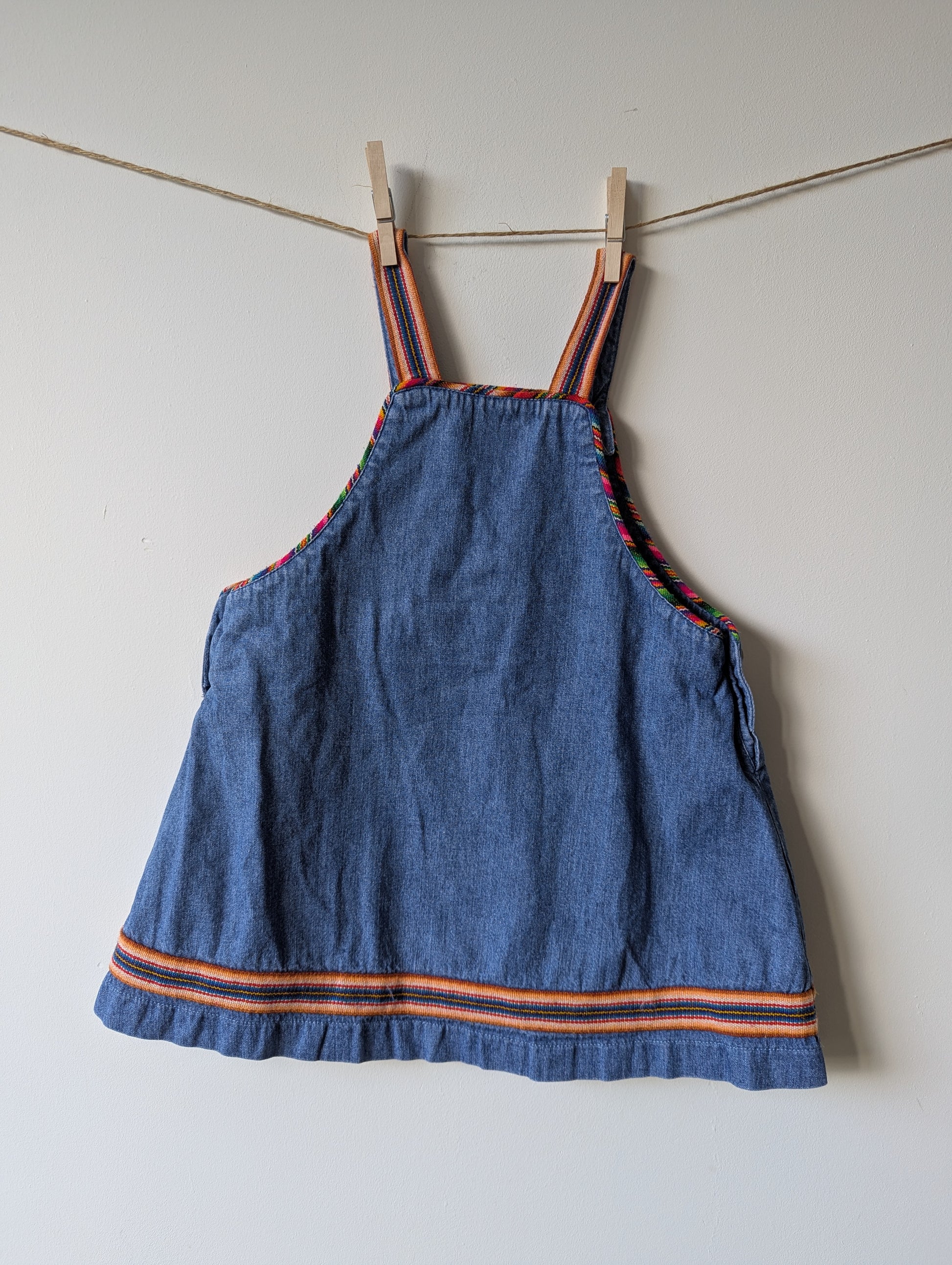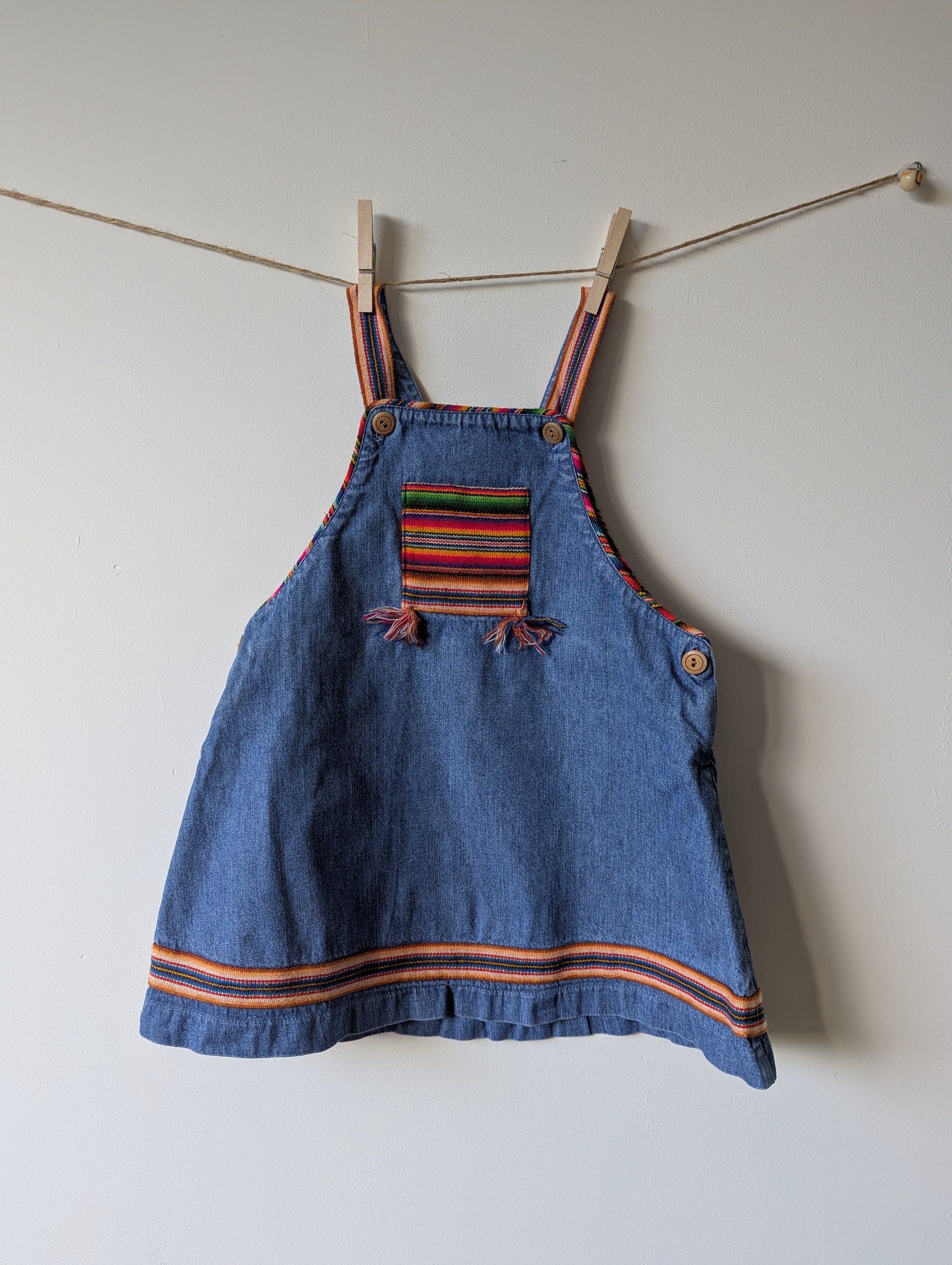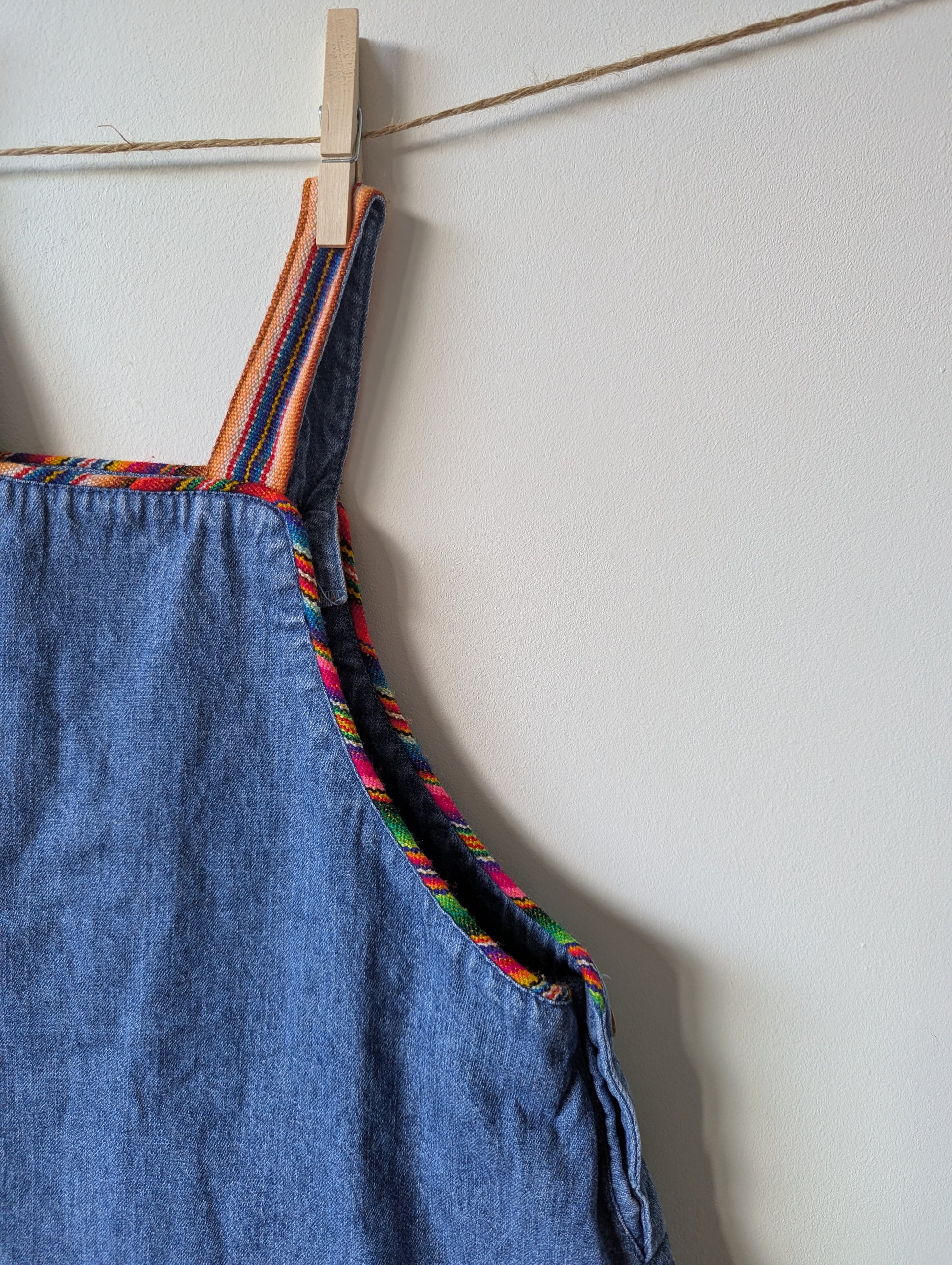 Mooie spijkerjurk met leuk stofje op het zakje en als bies.