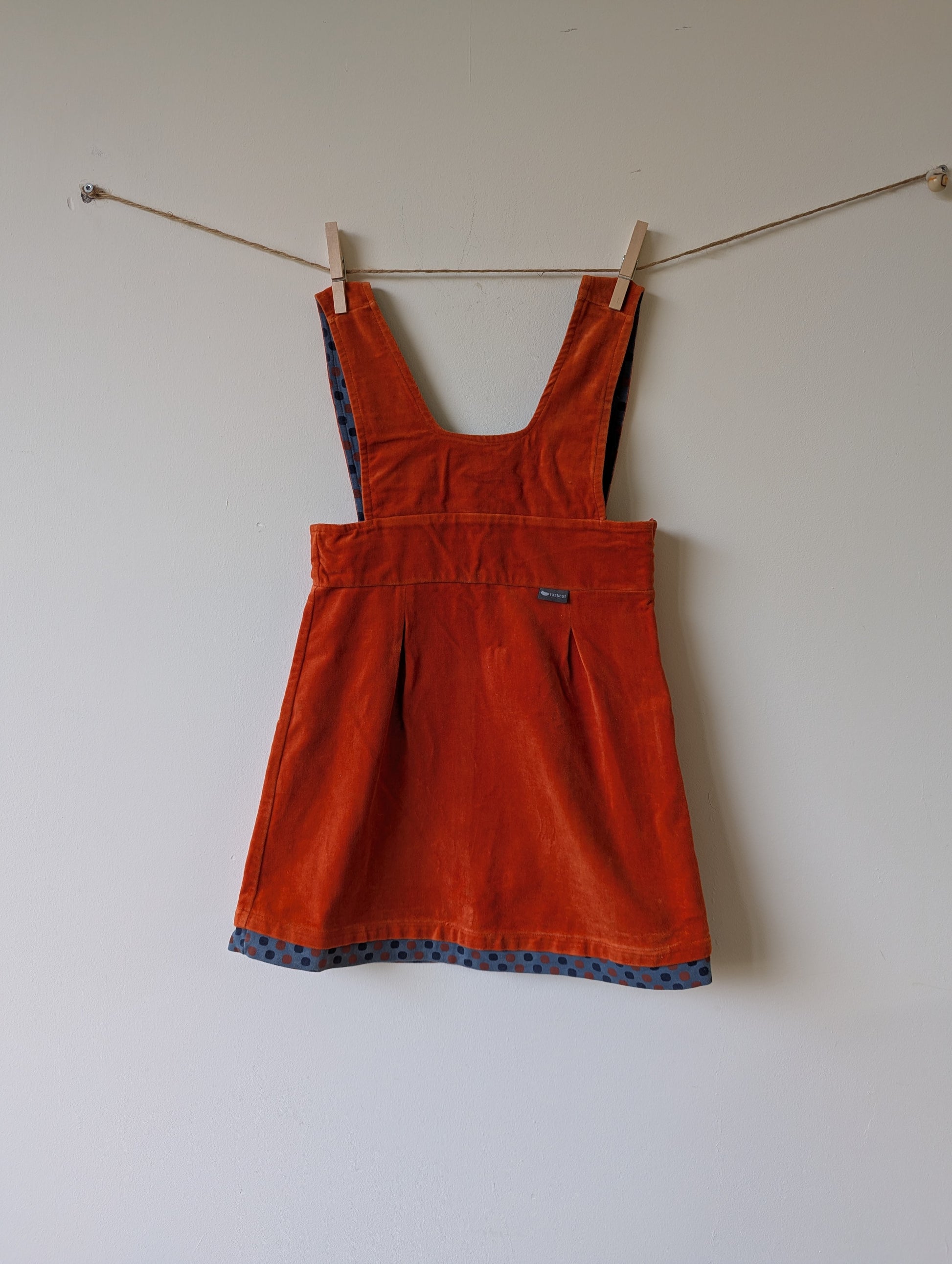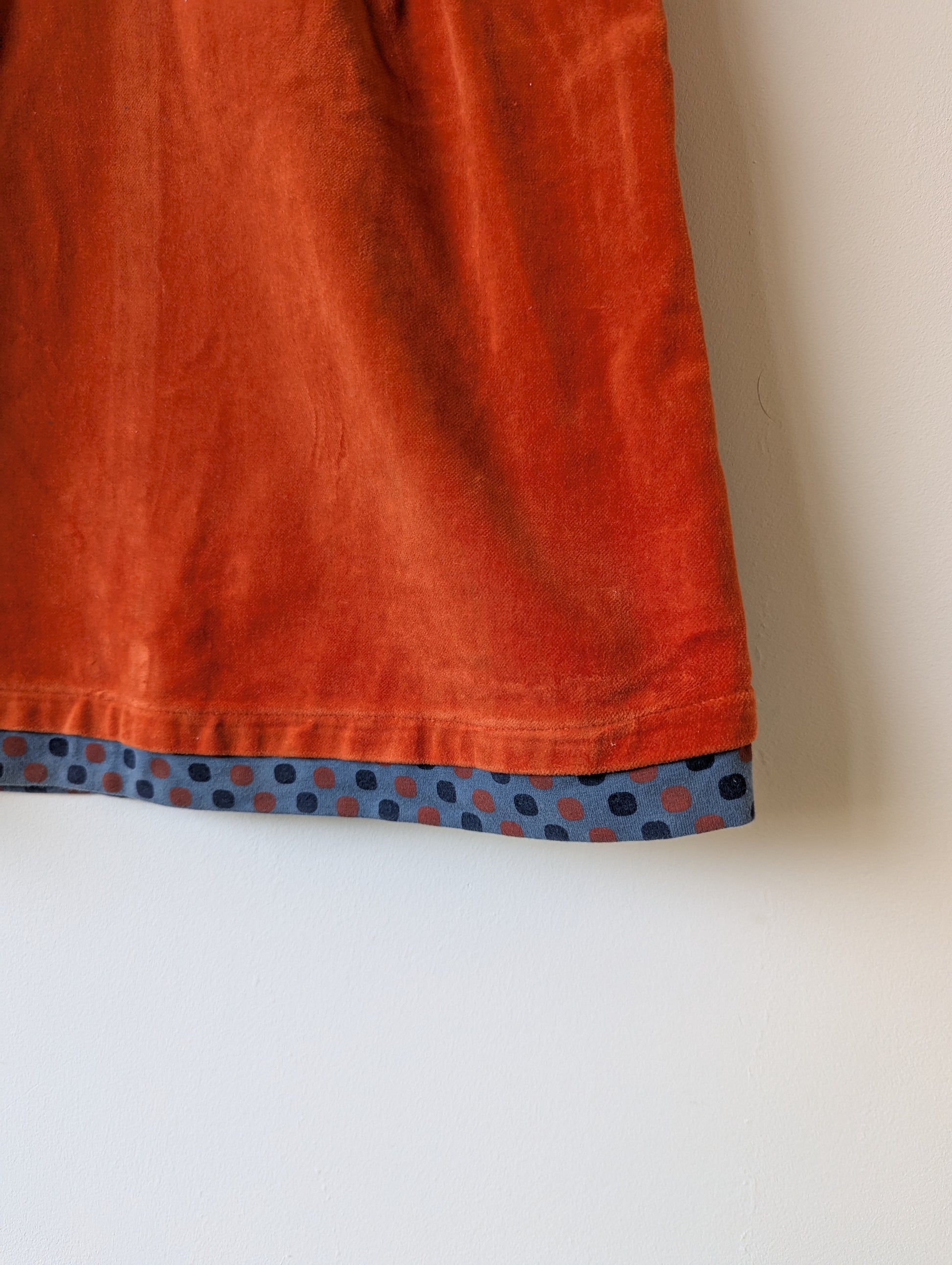 Oranje fluwelen jurkje met houten knopen op de achterkant. Binnenkant met gekleurde stippen, zie je ook aan de onderkant van het jurkje. Heel leuk jurkje!