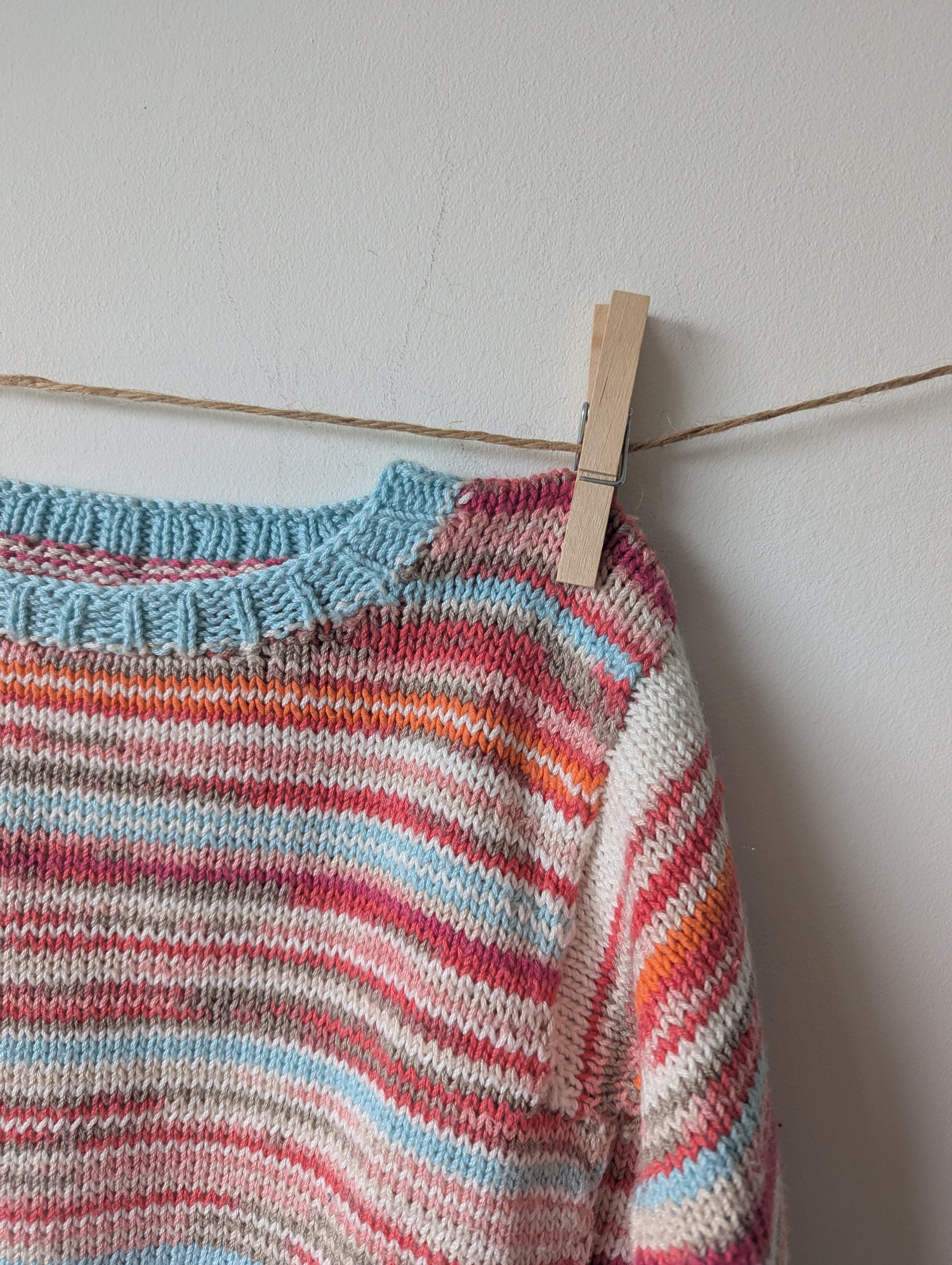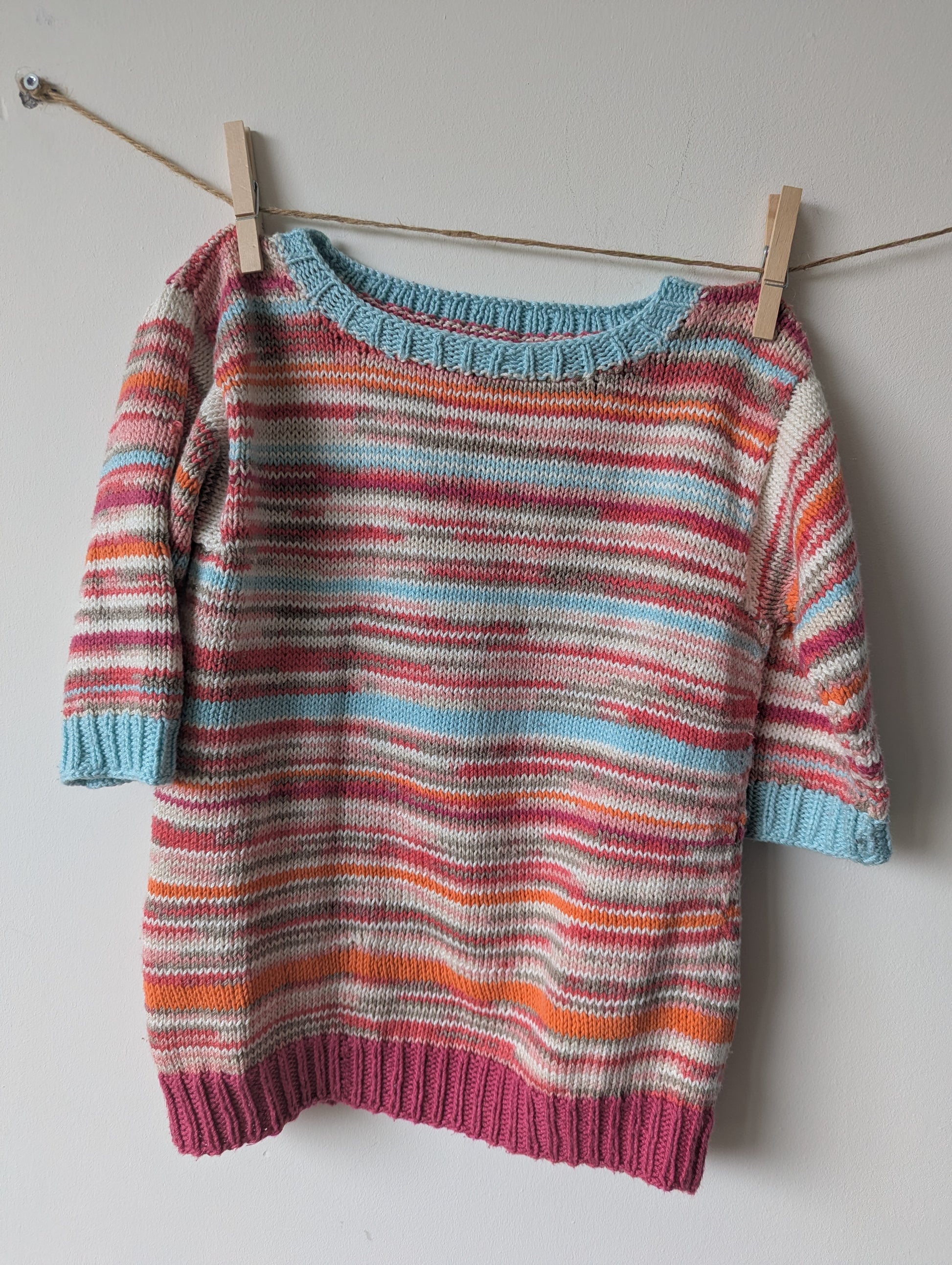 Handgebreide trui jurk. Ik schat zo in dat dit een maat 80 - 86 is aan de hand van de mouwen.