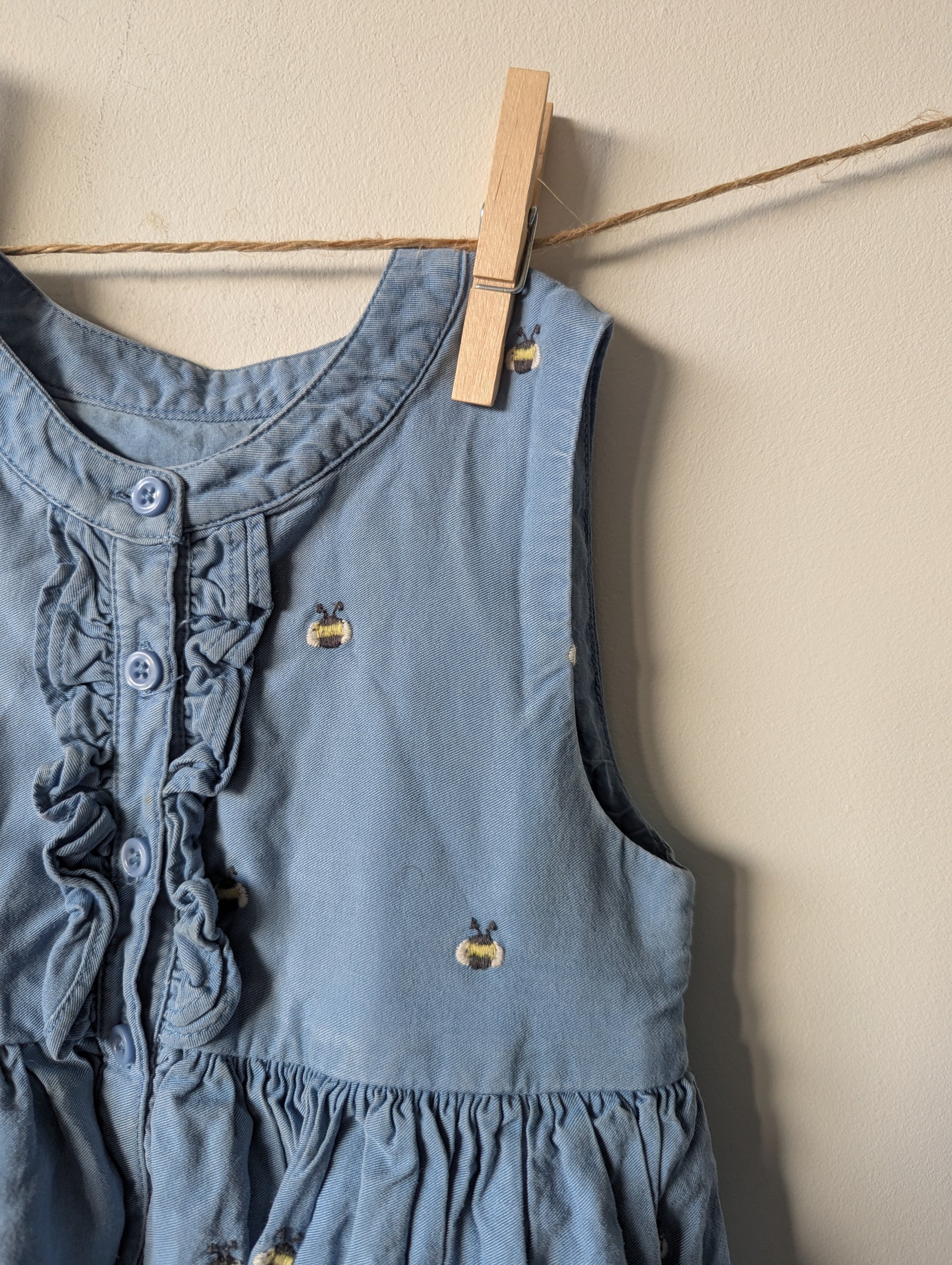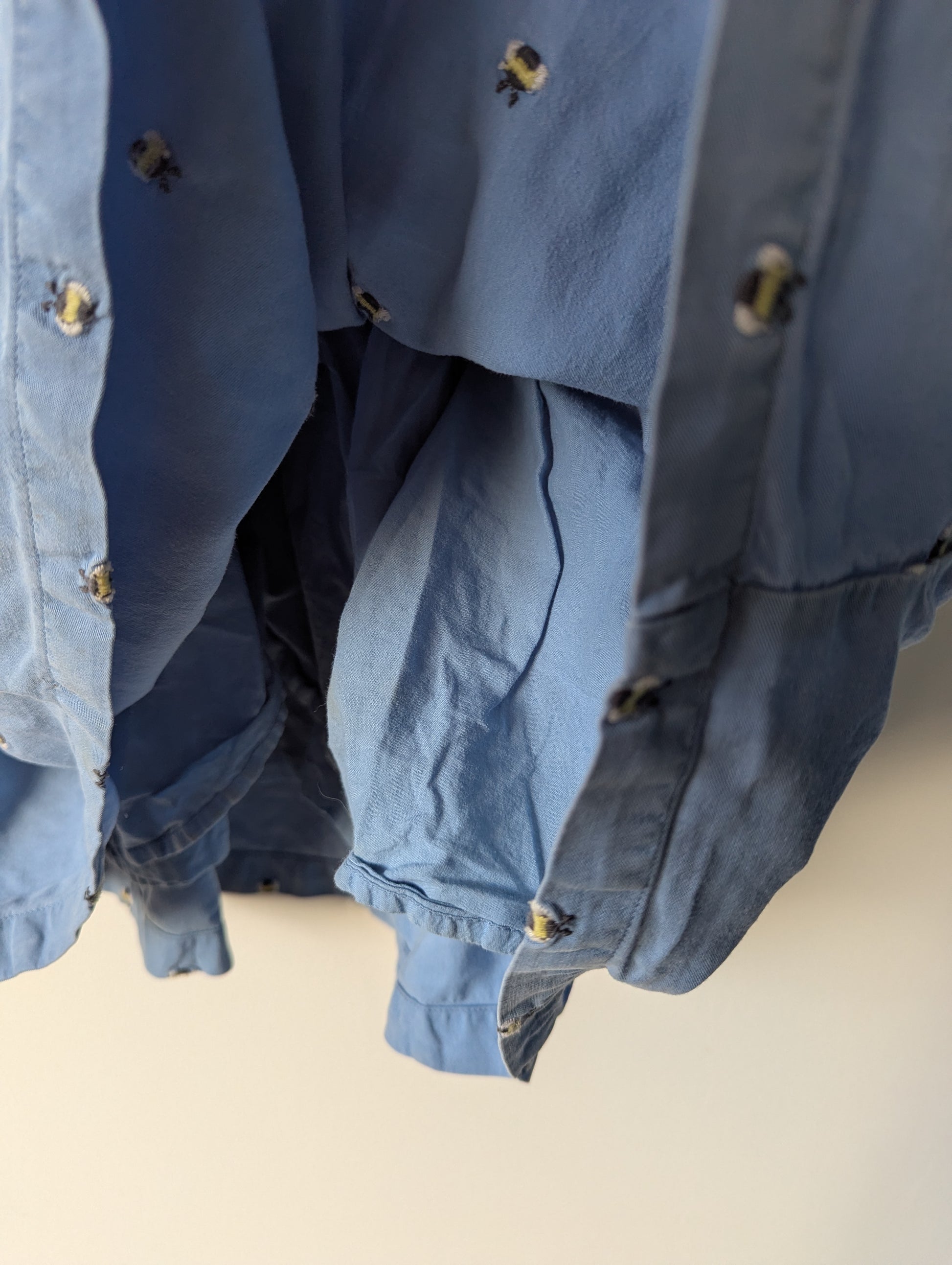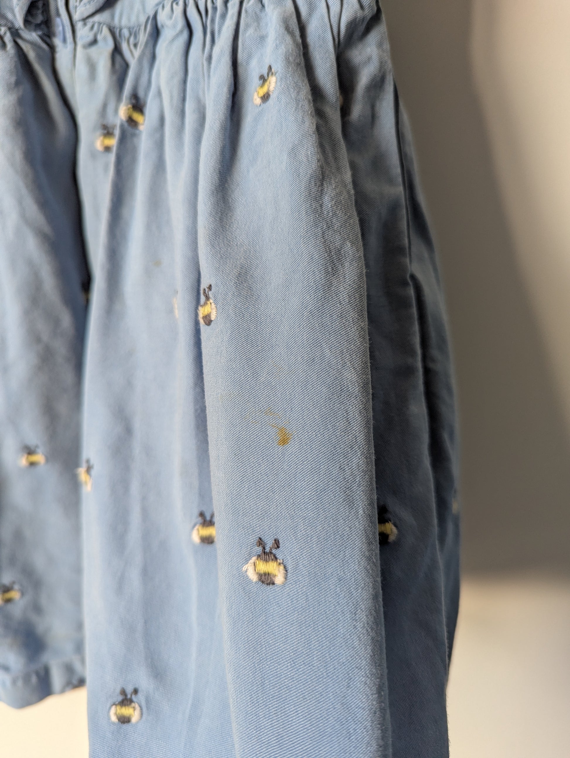 Lichtblauw jurkje met bijtjes. Heel leuk maar er zitten een paar vlekjes in vandaar een laag prijsje
