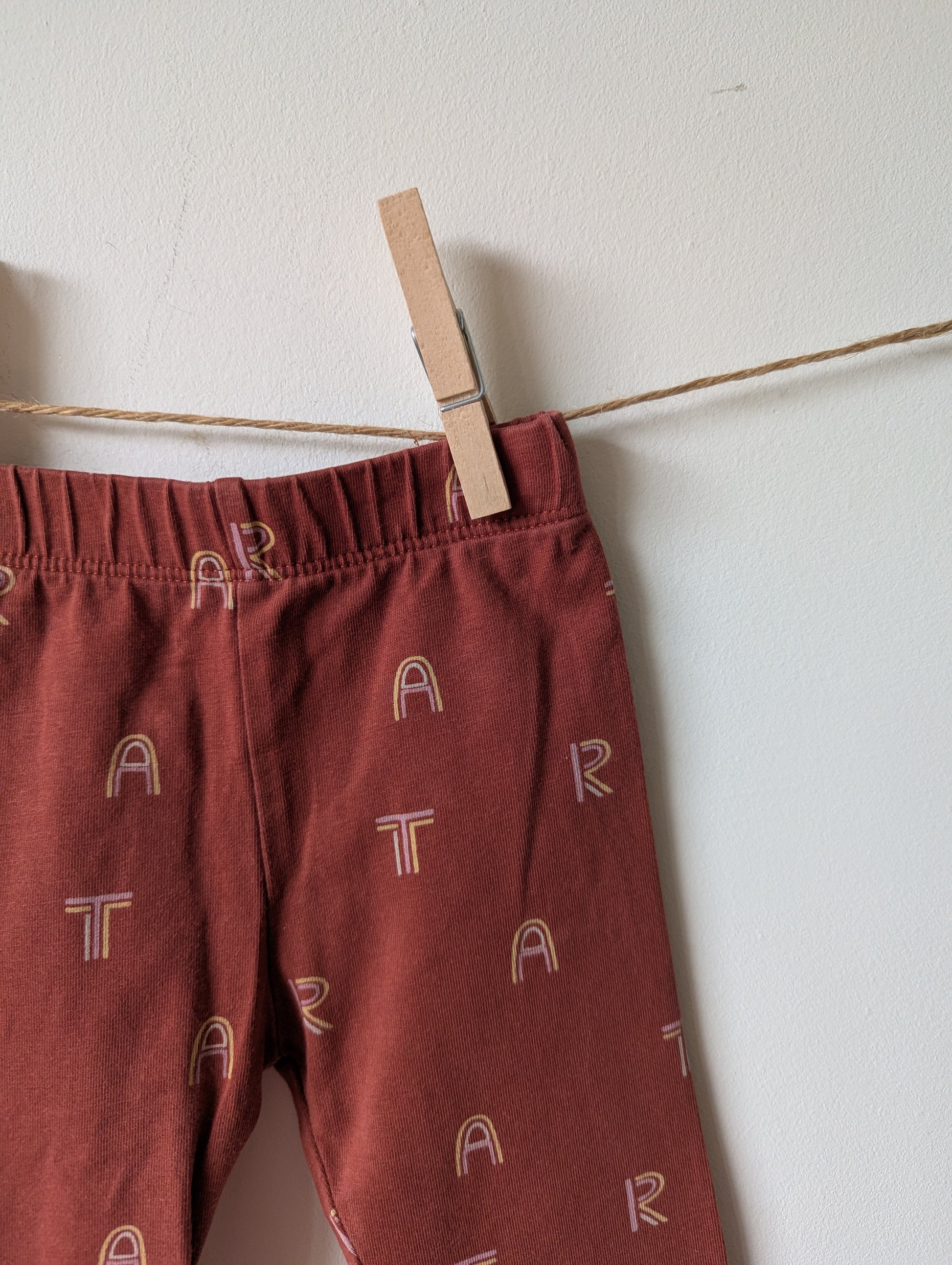 Oranjerood kleurige legging met letters erop de letter a r en t.