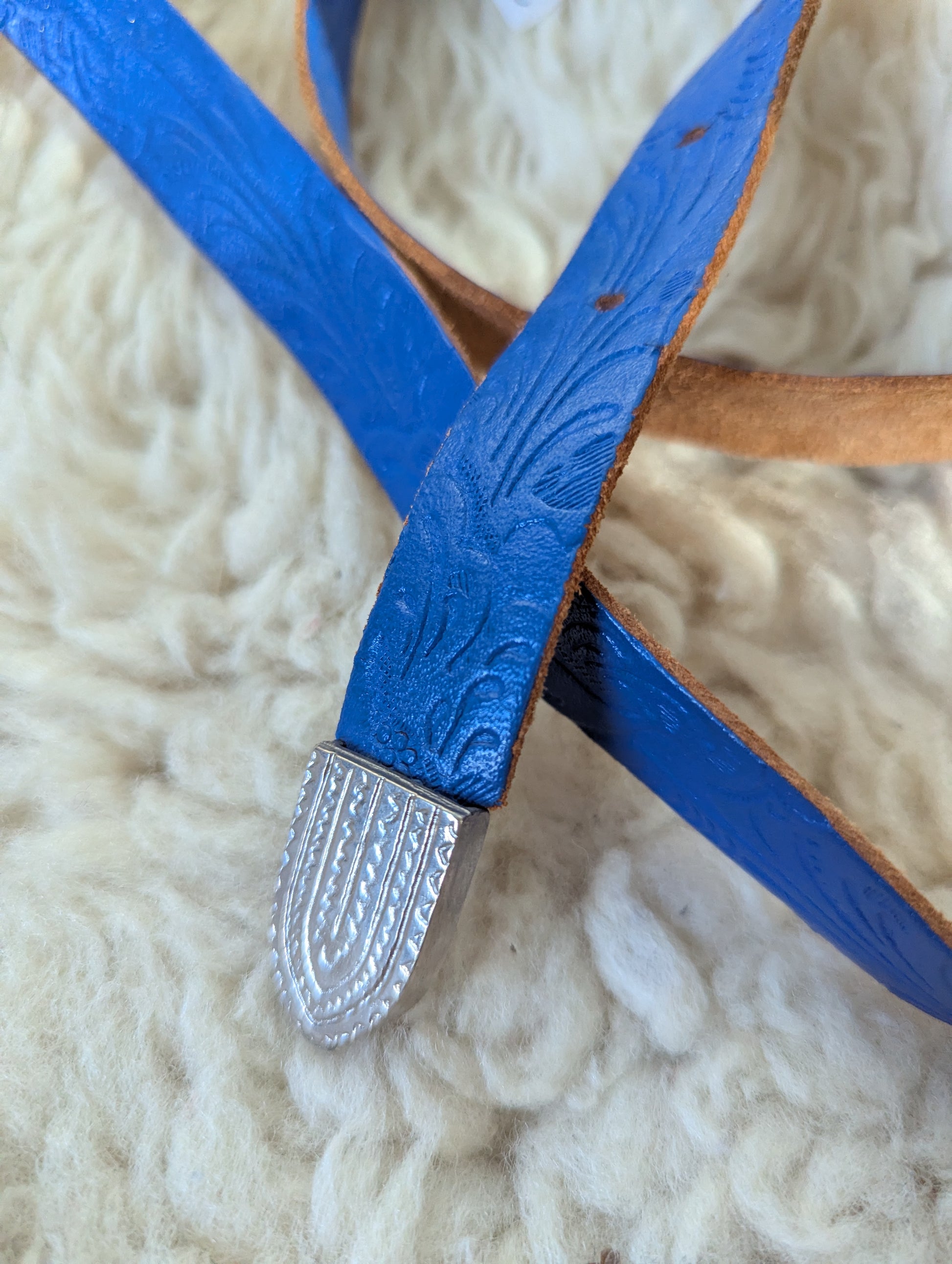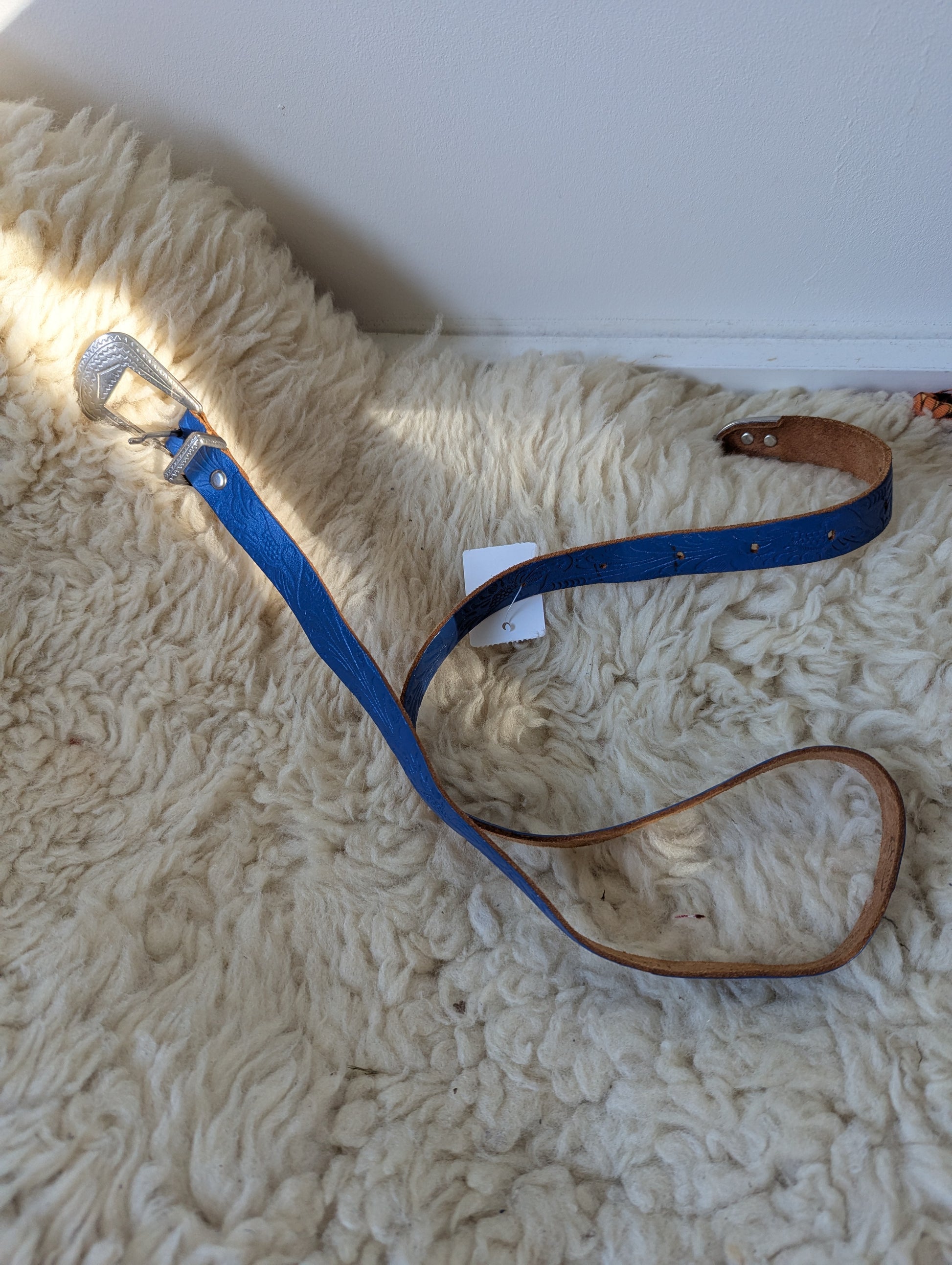 Heel leuk riempje voor rond je middel. Leer in helder blauw met een leuke 'tekening' in het leer. Zie foto's. Ook een chique sluiting.