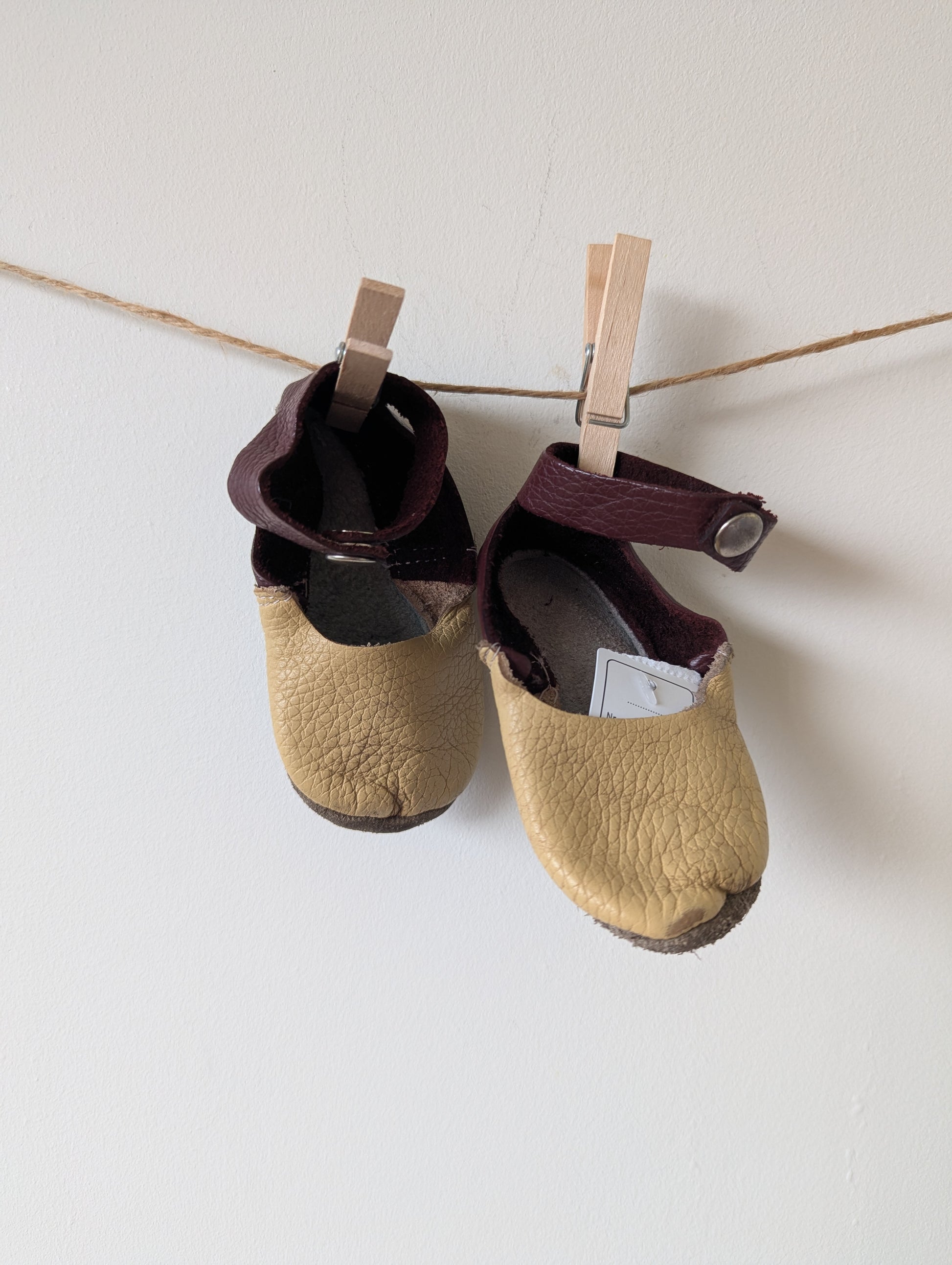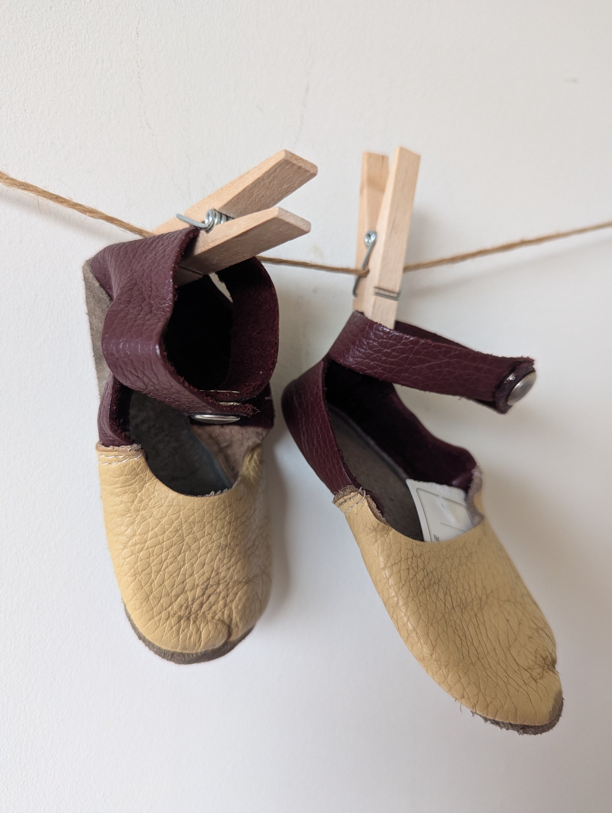 Leren sloffen in lichtgeel en wijnrood, wel wat gebruikssporen maar nog steeds zo leuk!