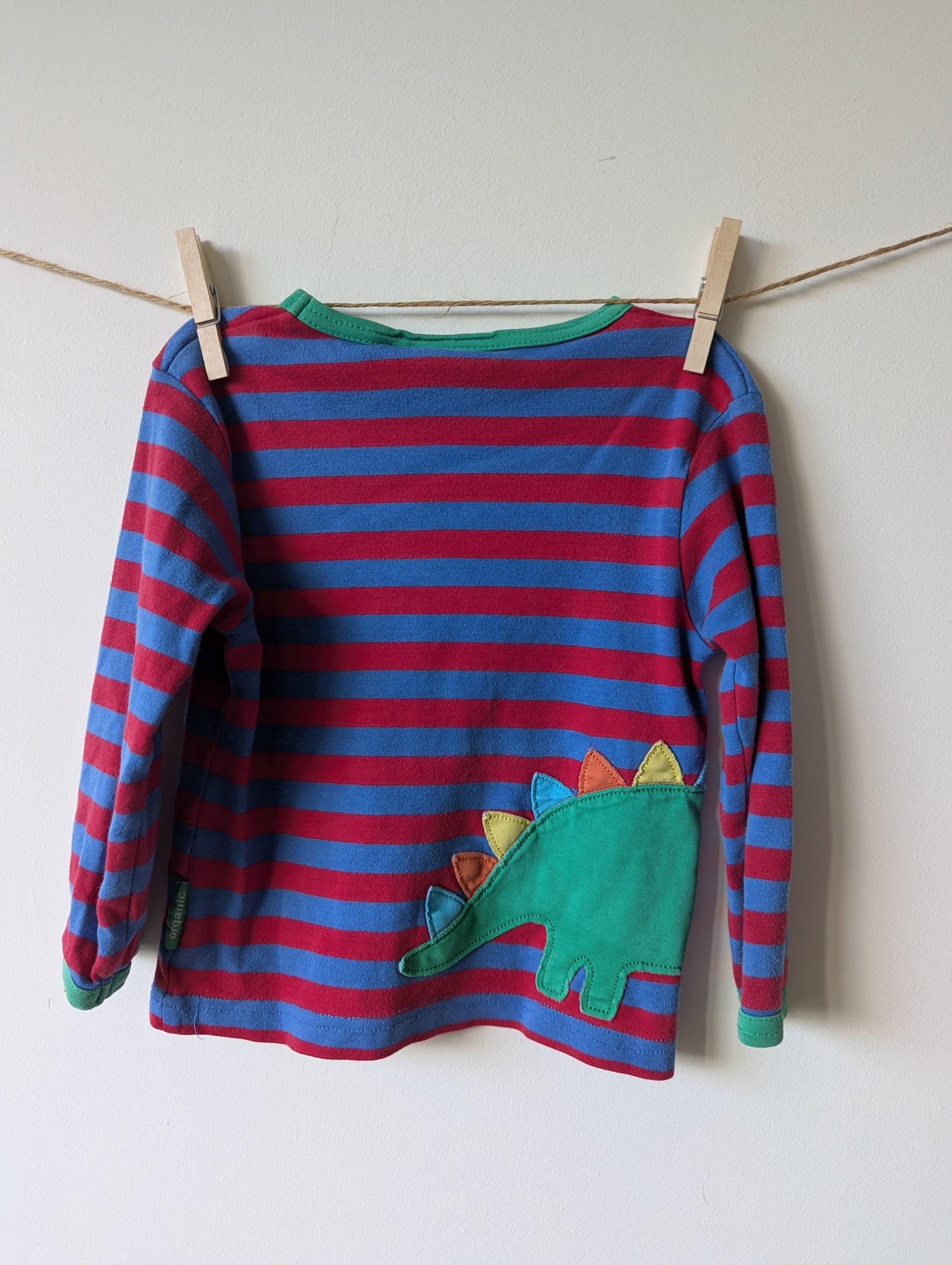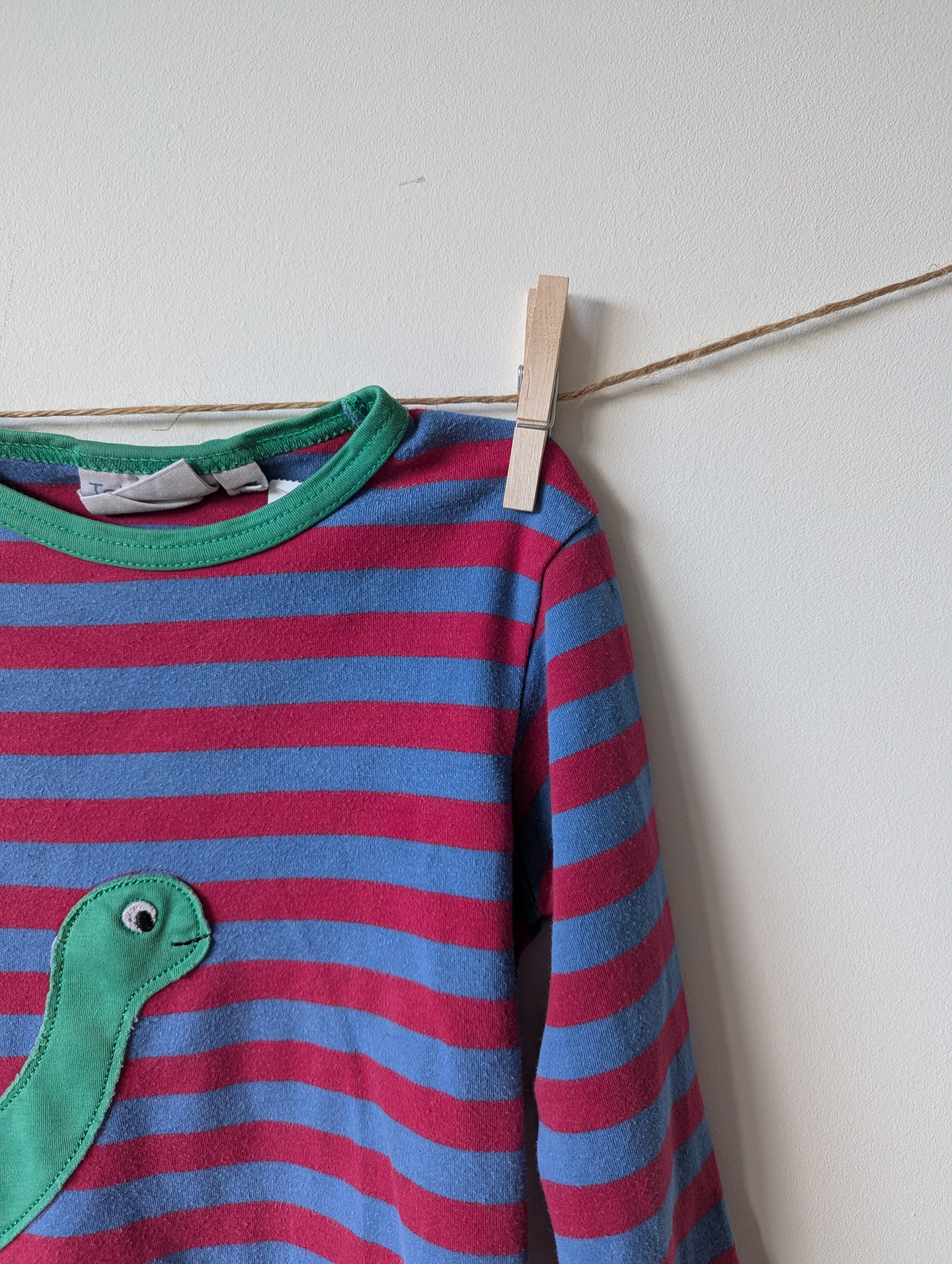 Longsleeve met dino die doorgaat op de achterkant. Fleurig shirt, beetje pillig.