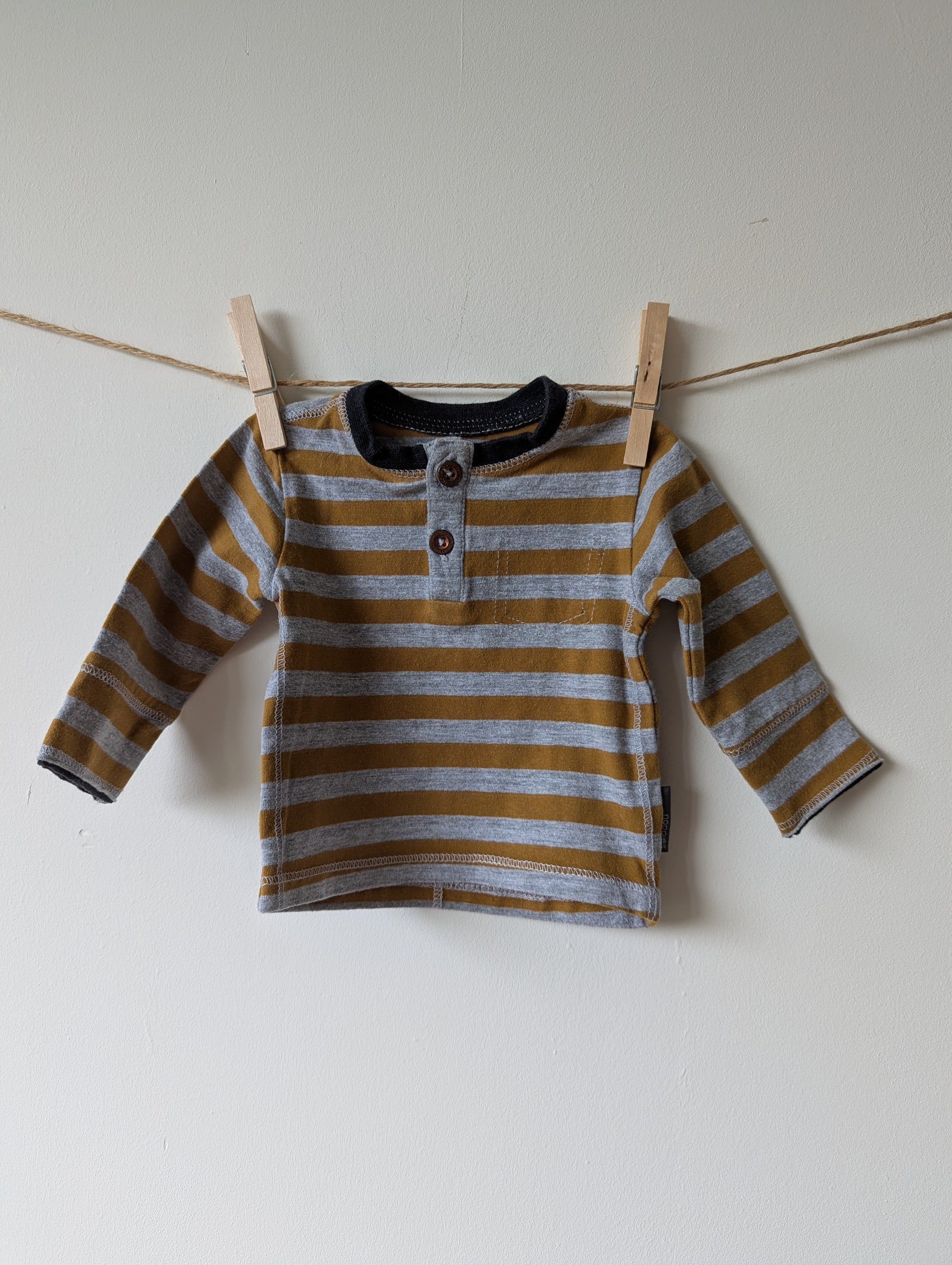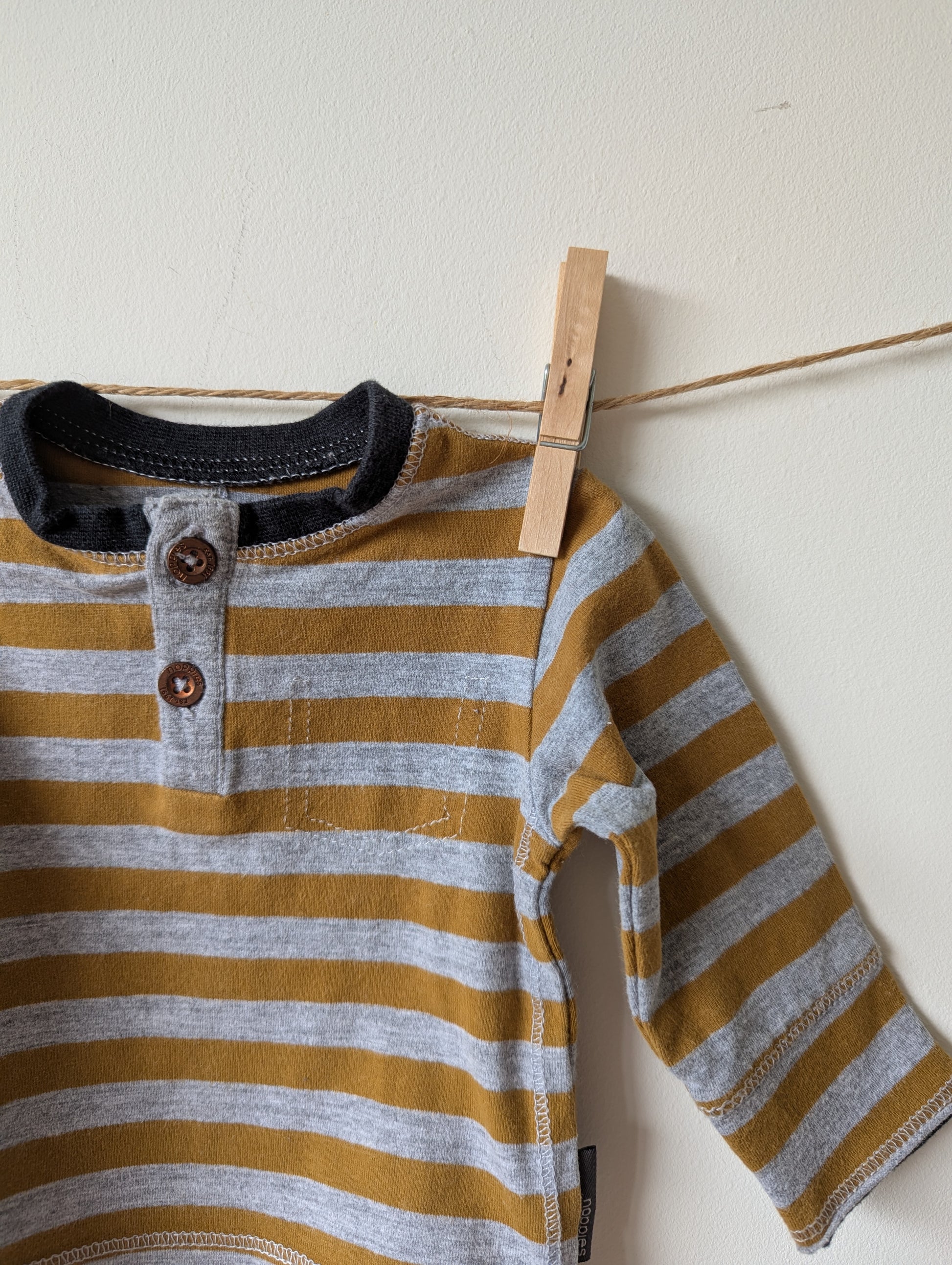 Gestreept shirt met grijs en mosterdgeel. Kraag is zwart.