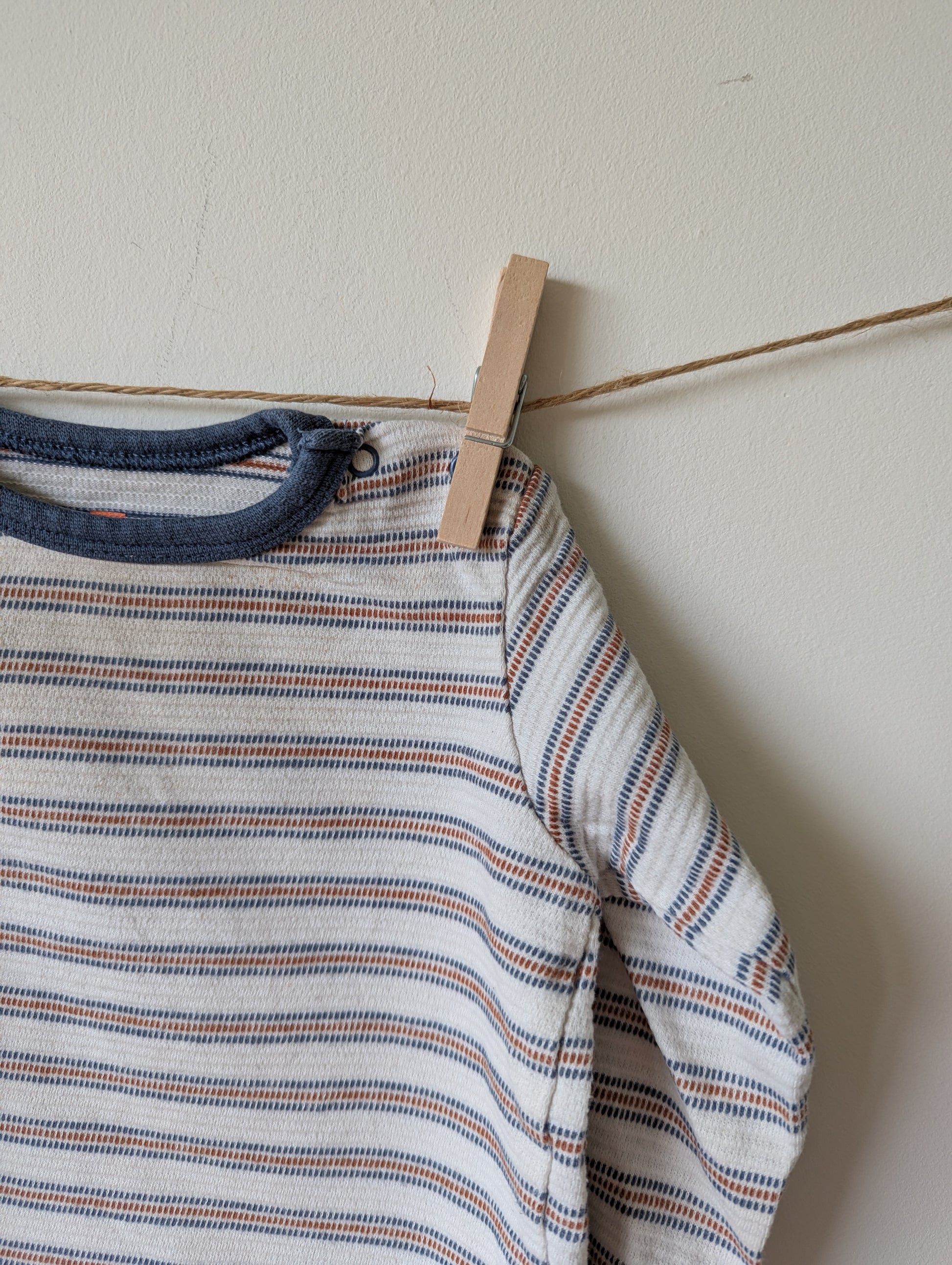 Longsleeve met streepjes. Wit shirt en strepen zijn grijs/blauw en koper. plaatje van een zonnetje aan de onderkant. Bovenin licht vlekje, zie ik nu pas dus kan niet heel opvallend zijn.