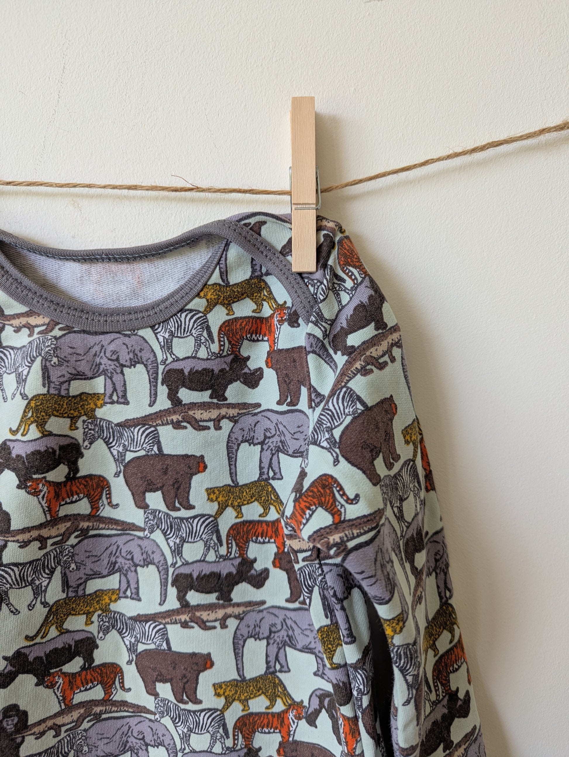 Lekker zachte longsleeve met wilde dieren. Zoals neushoorn, tijger, aap, krokodil, beer, olifant.