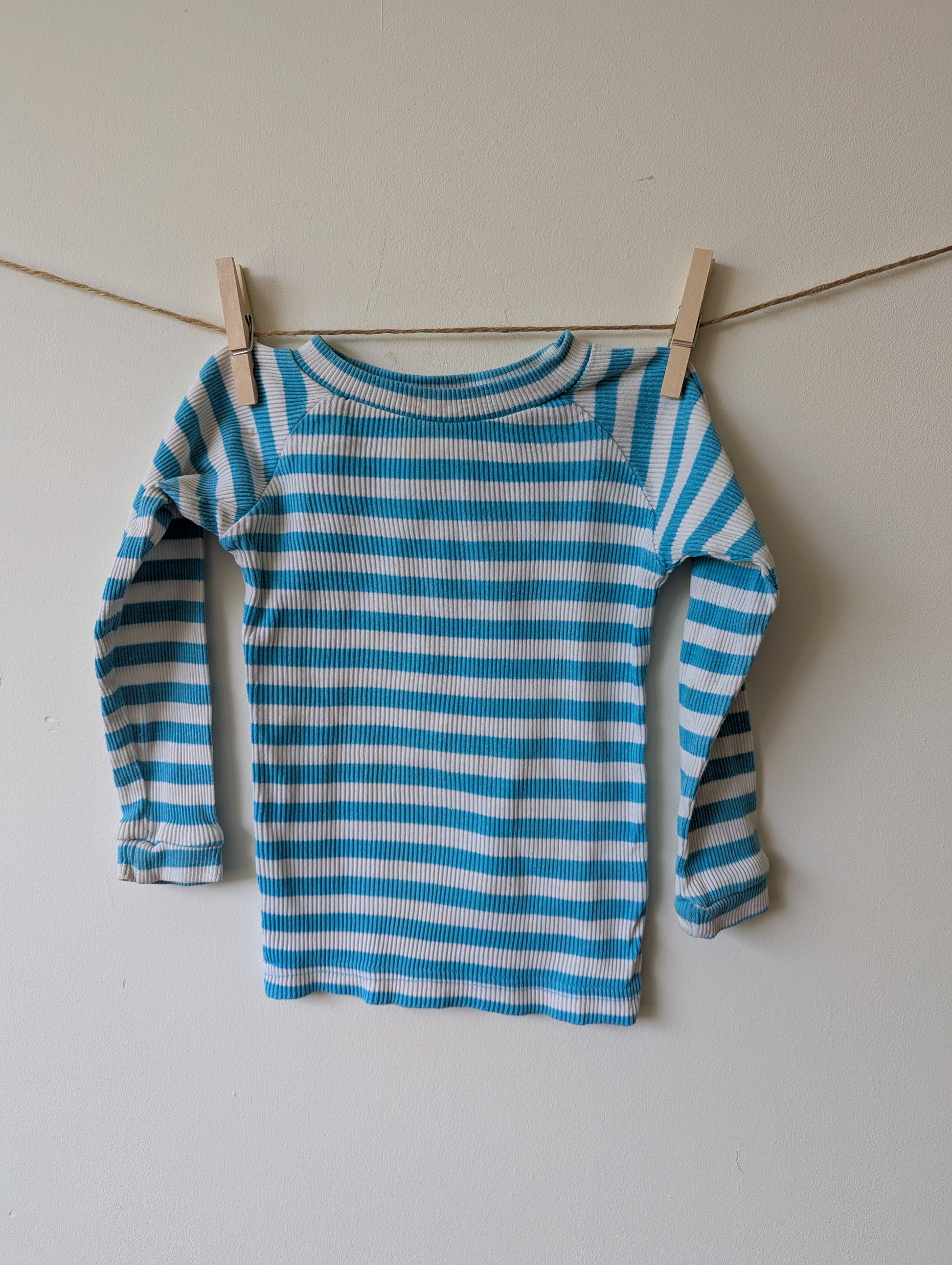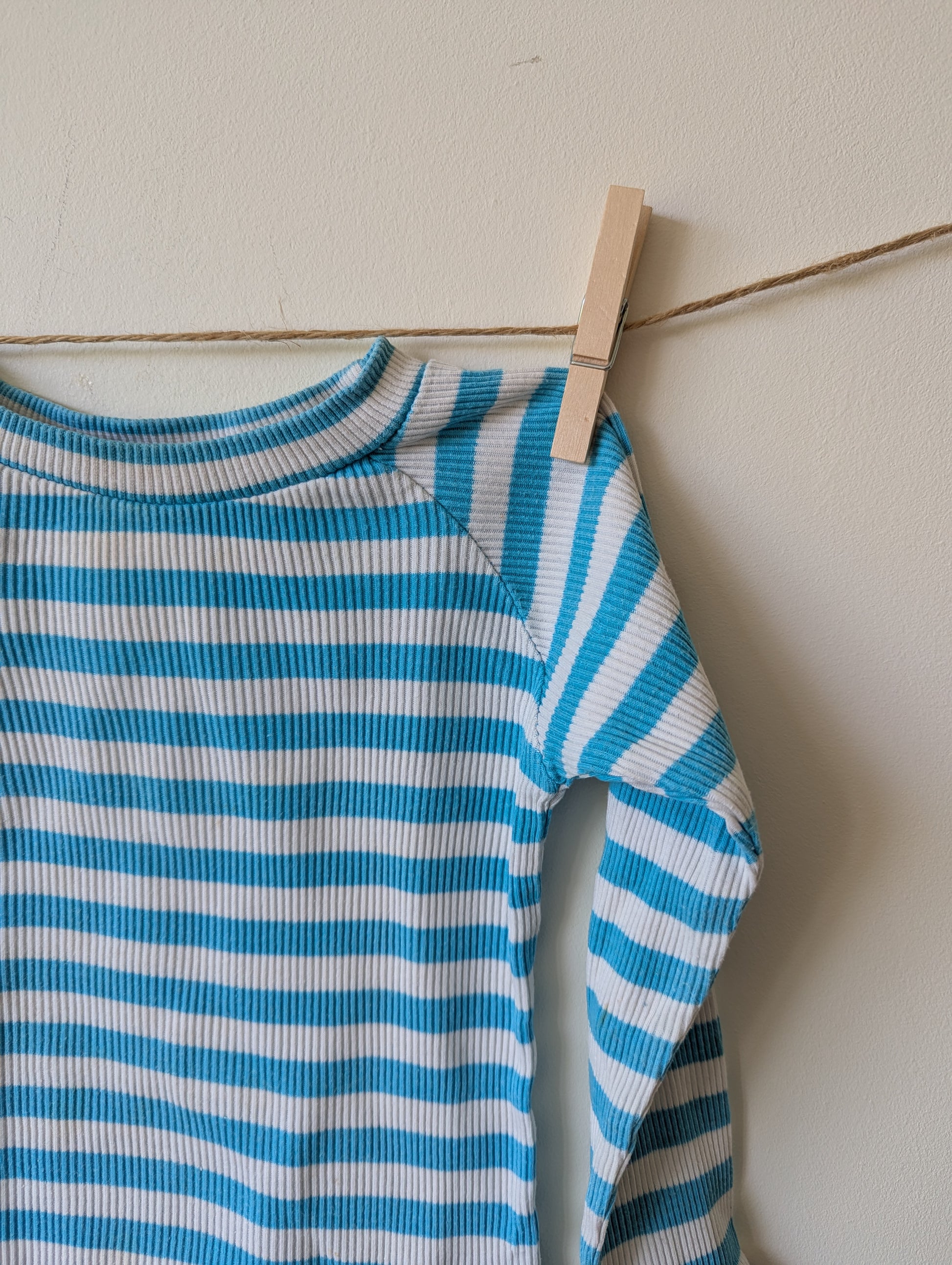Wit en (helder)blauw gestreept shirtje. Goede staat. Minivlekje op rechtermouw, denk dat dat er bij de was wel uit gaat.