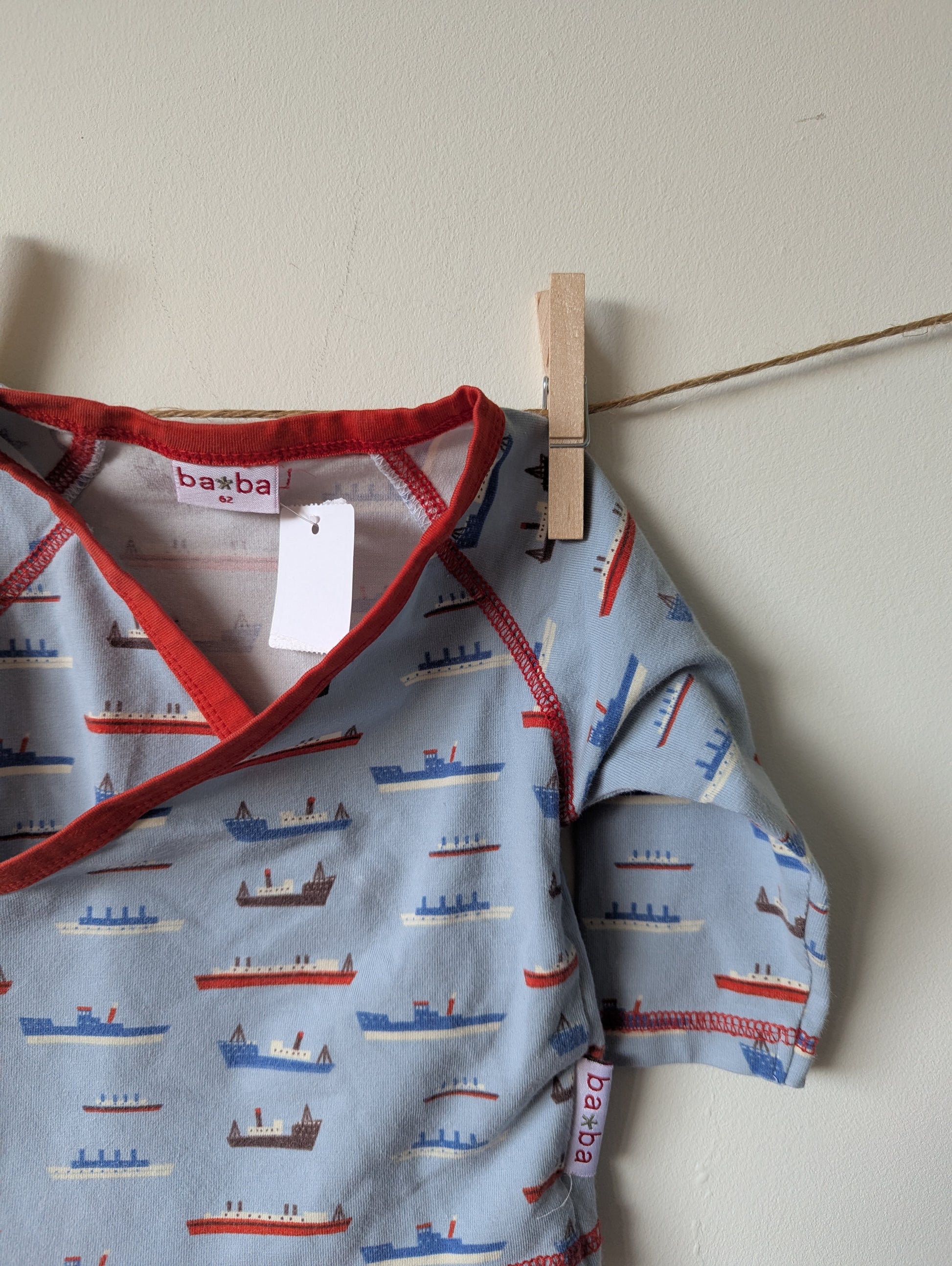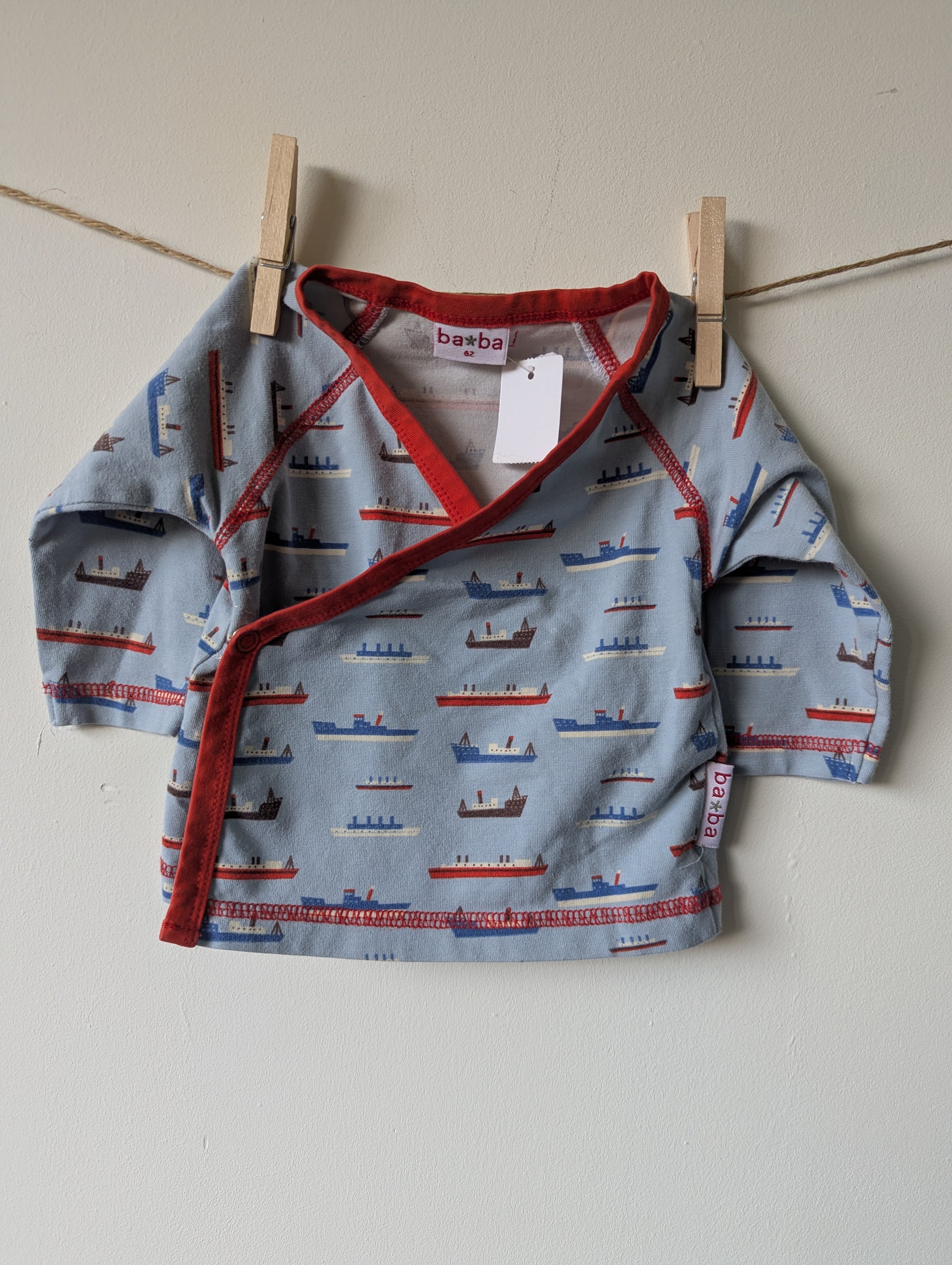Lichtblauw met rood vestje met boten