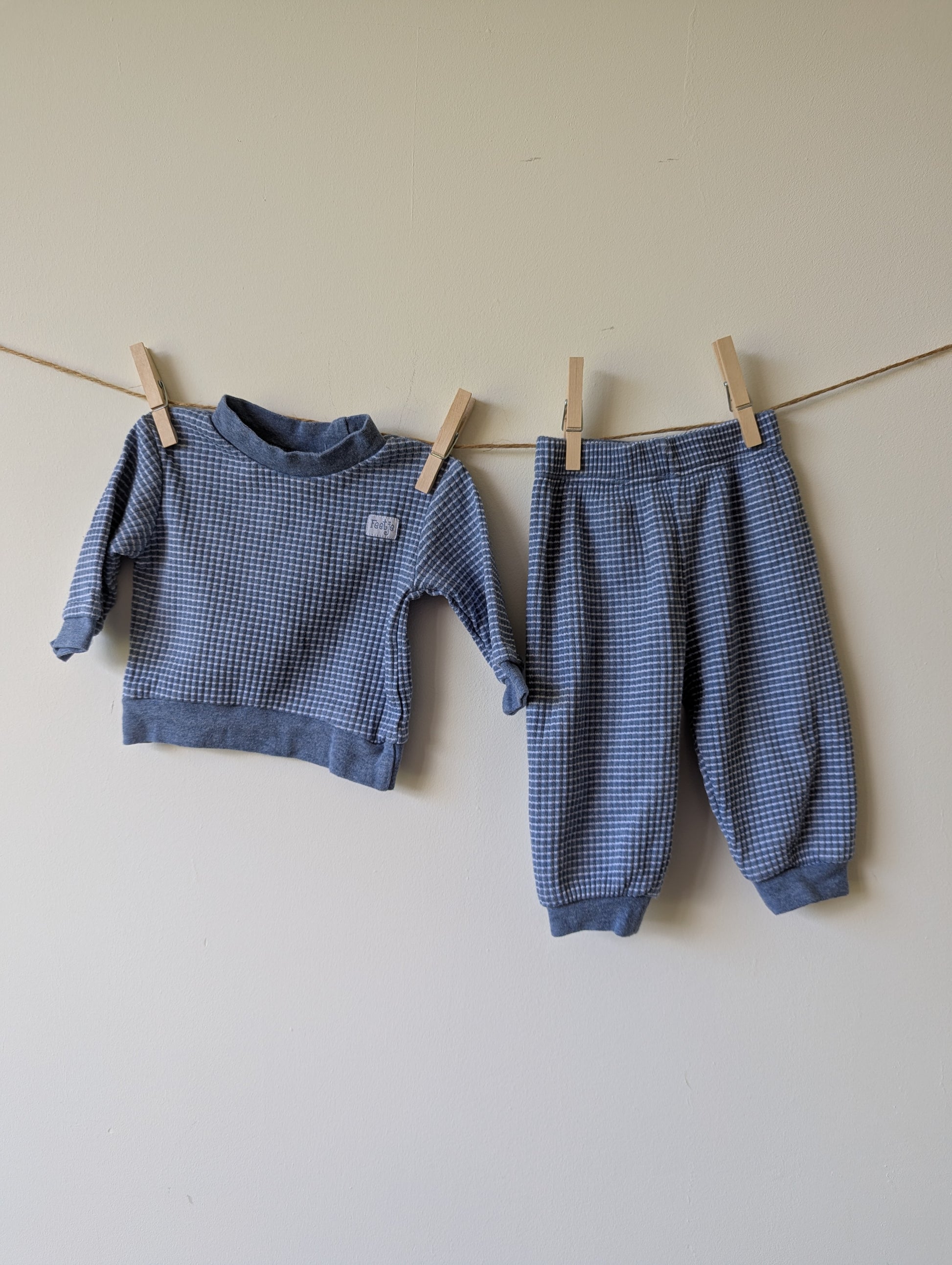 Blauw feetje pyjama met wit streepje. In goede staat.