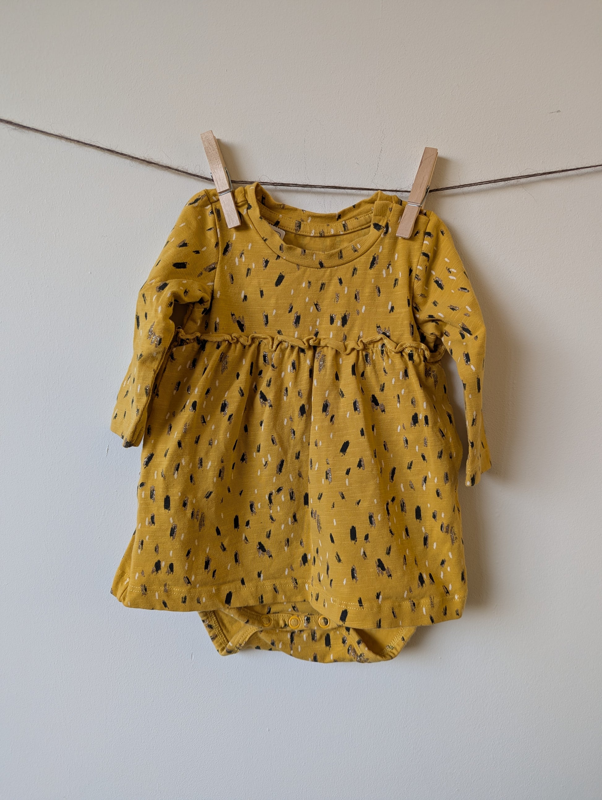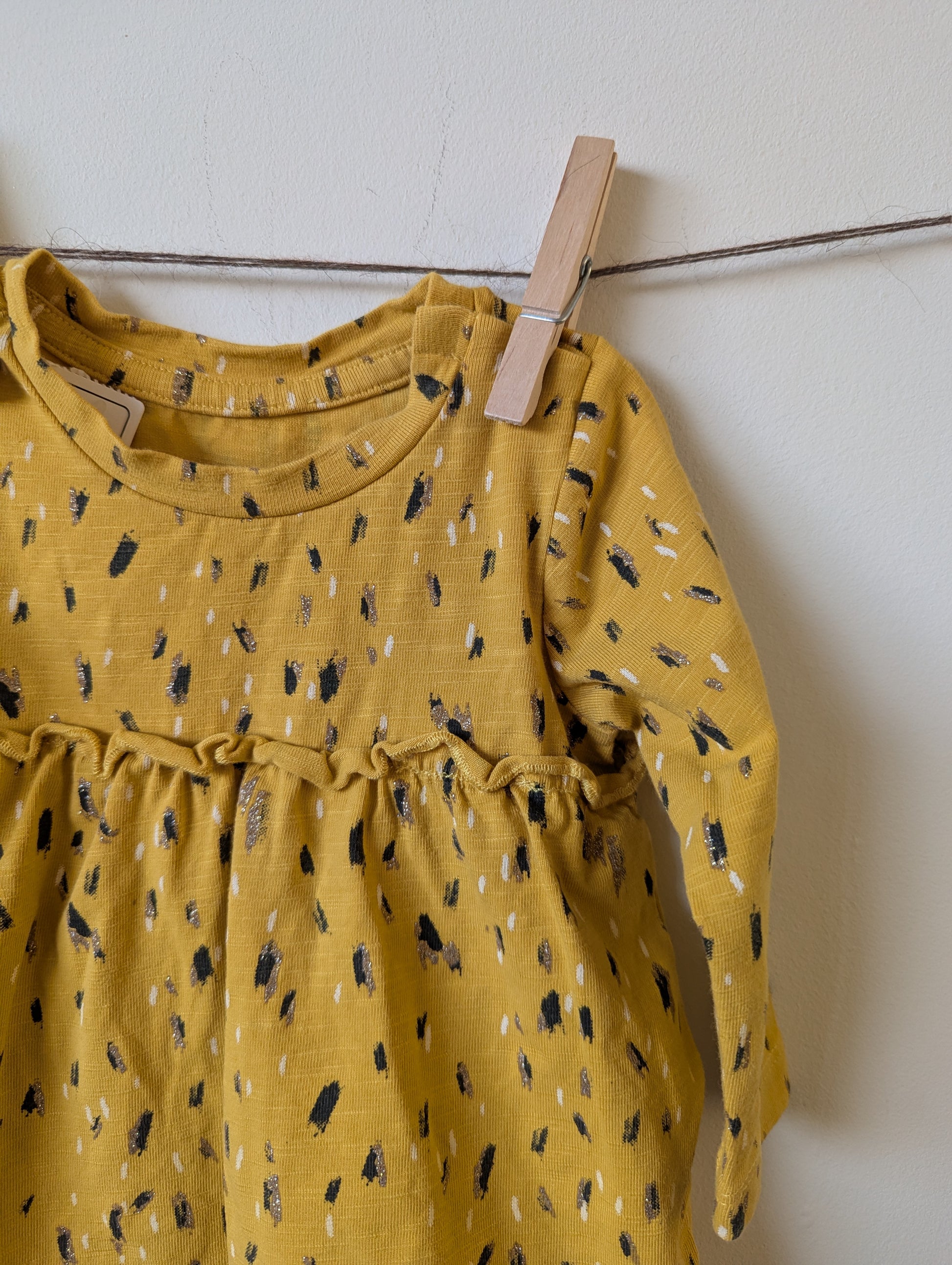 Mosterdgeel jurkje met goud glitter, zwart en witte decoratie.
