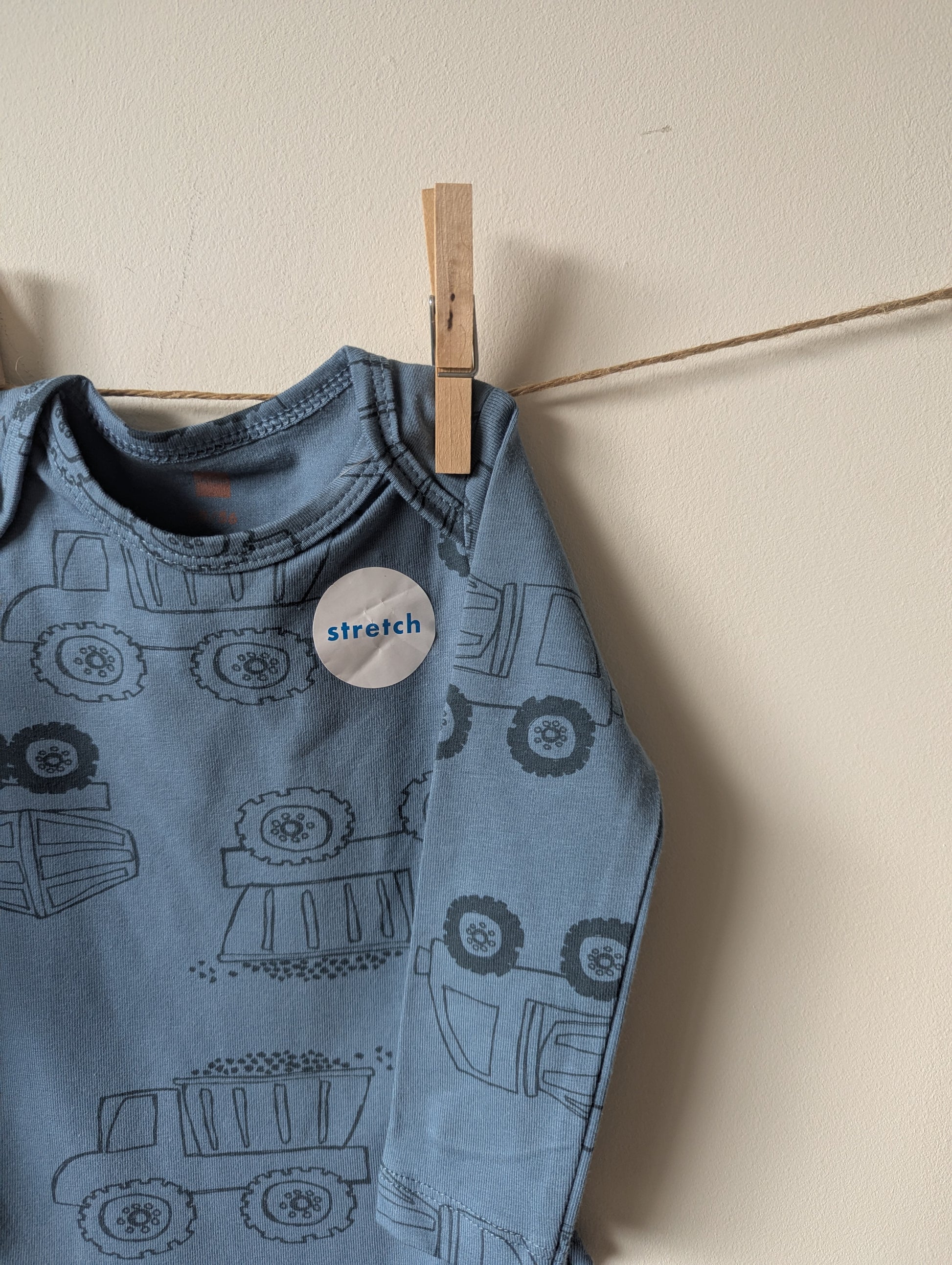 Blauwe romper met tractor, nieuw met prijskaart er nog aan