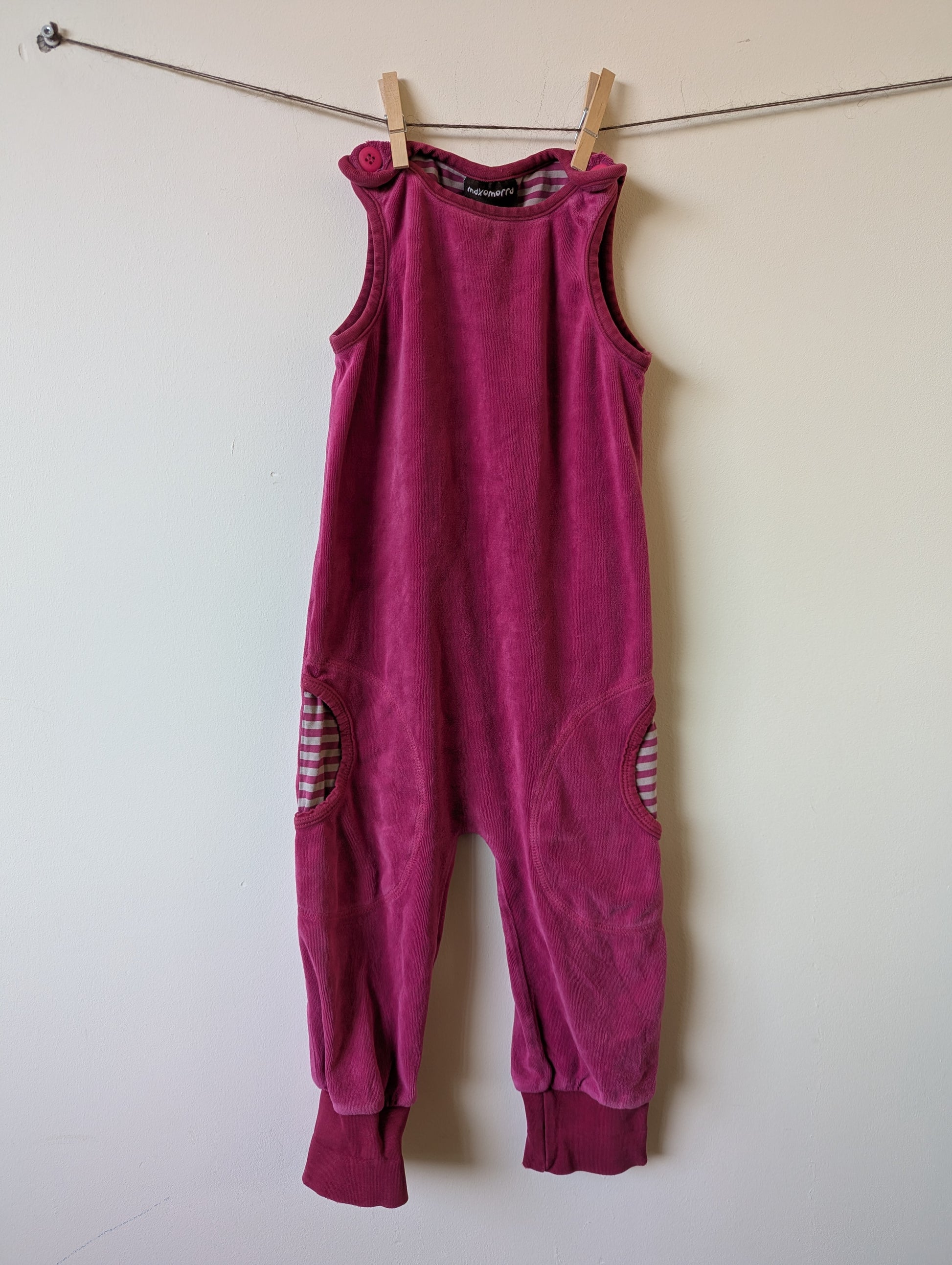 Roze fluwelen salopette. Streepjes bij de zakken. Staat is goed, je kunt wel zien dat hij al gedragen is.