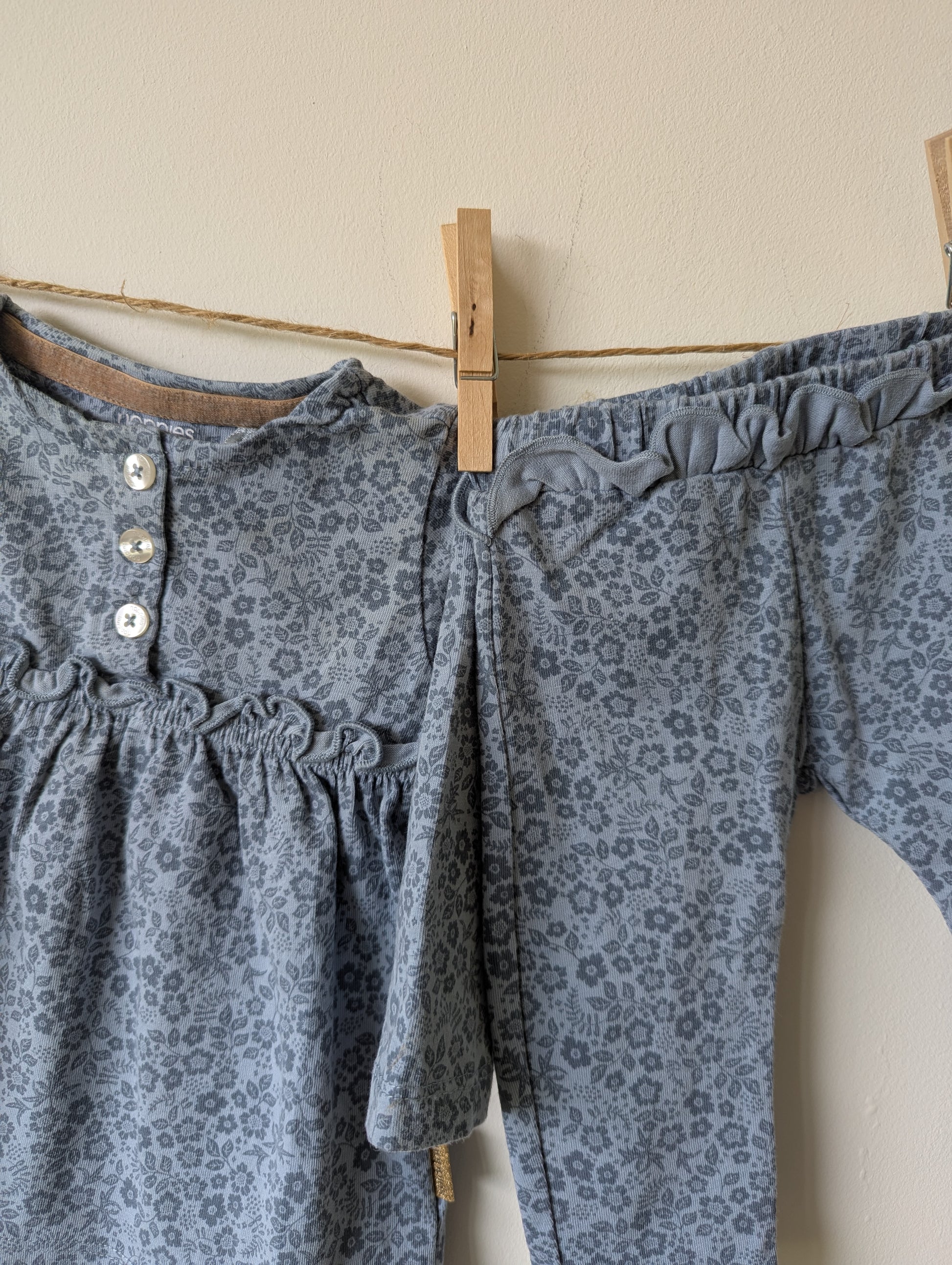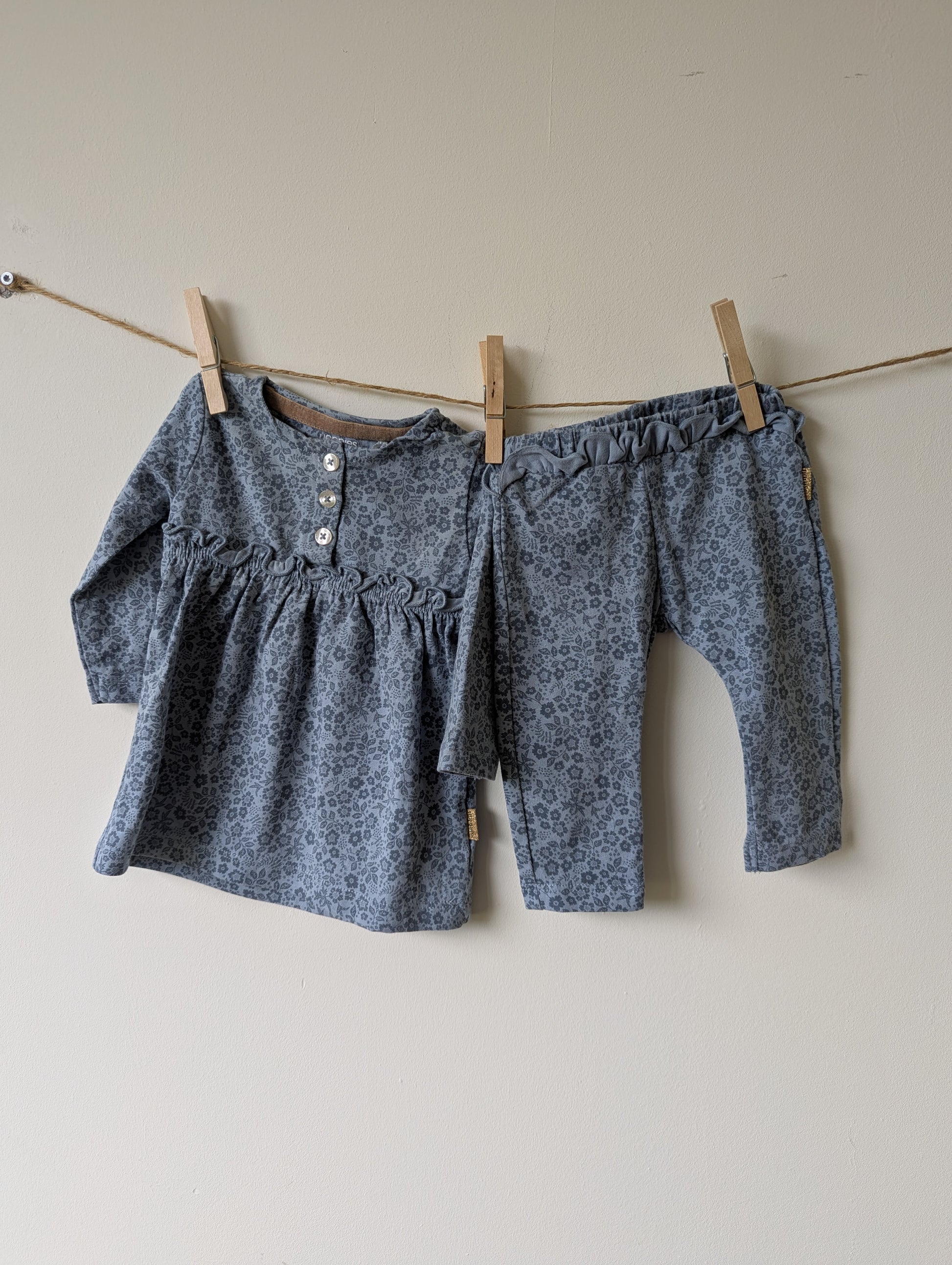 Lichtblauw tuniekje met donkerblauwe bloemetjes. Met roezeltjes en een mooi broekje. Lekker zacht!