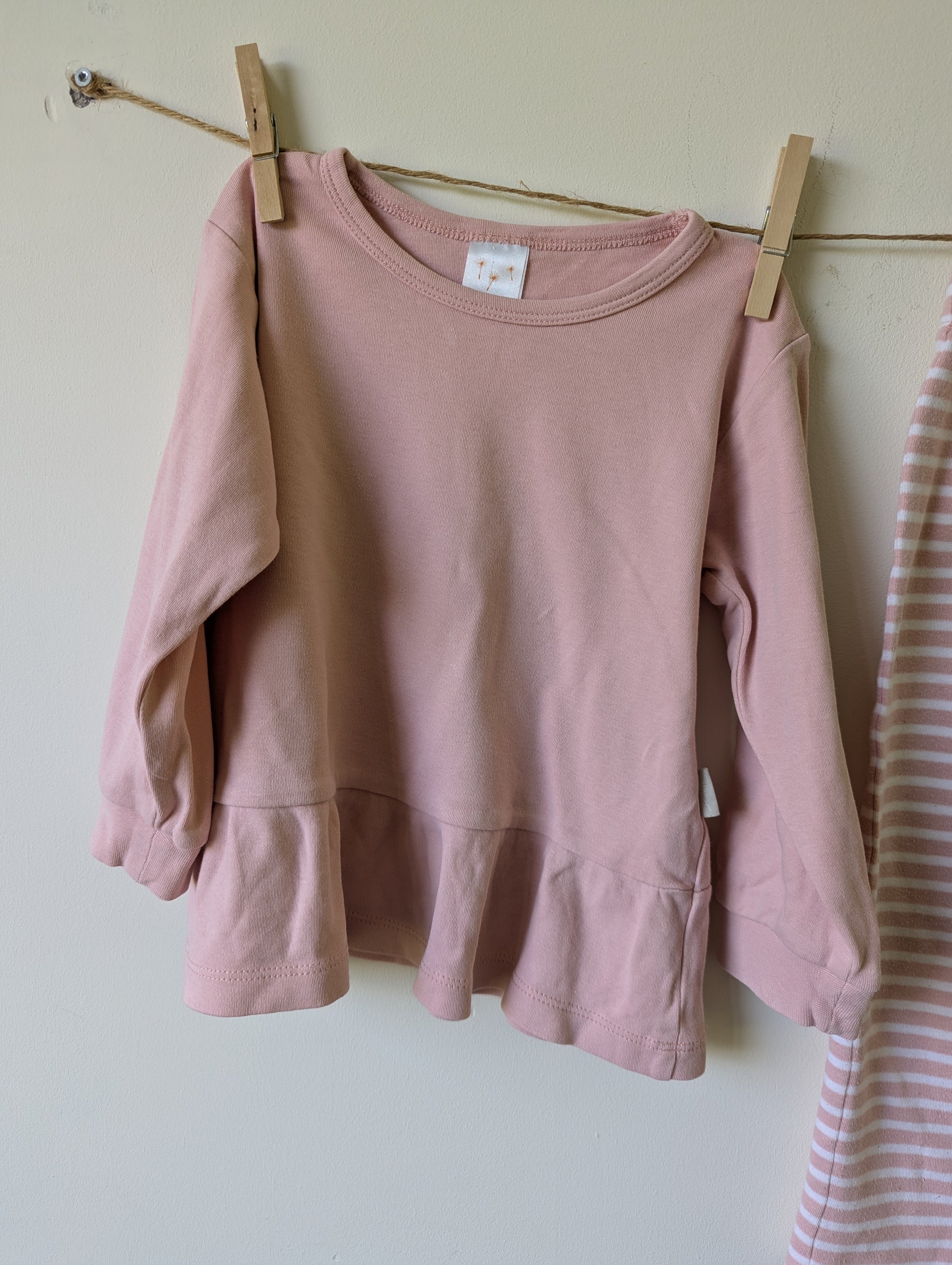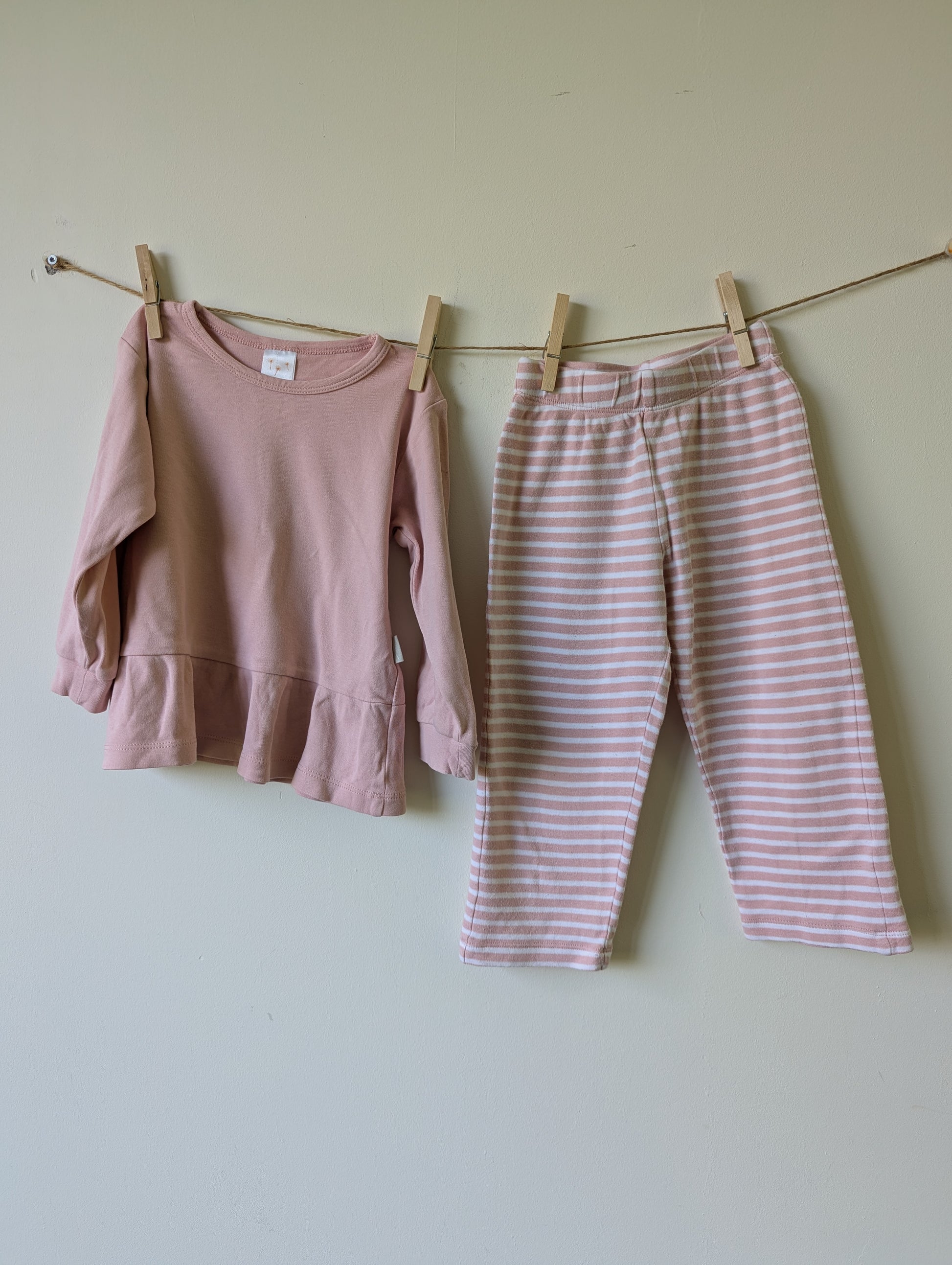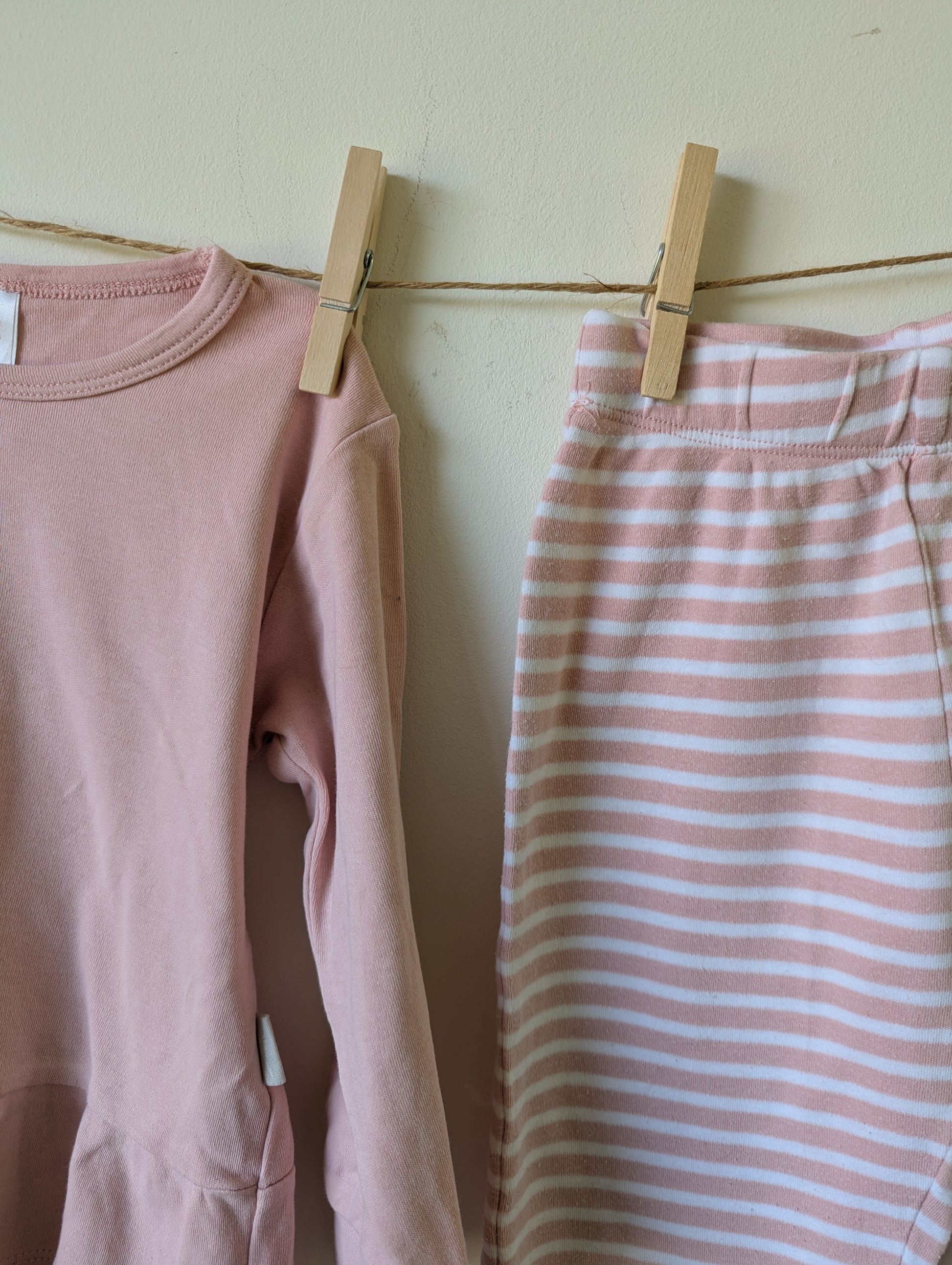 Heerlijk zacht setje. Lichtroze. Broek met roze en witte strepen.