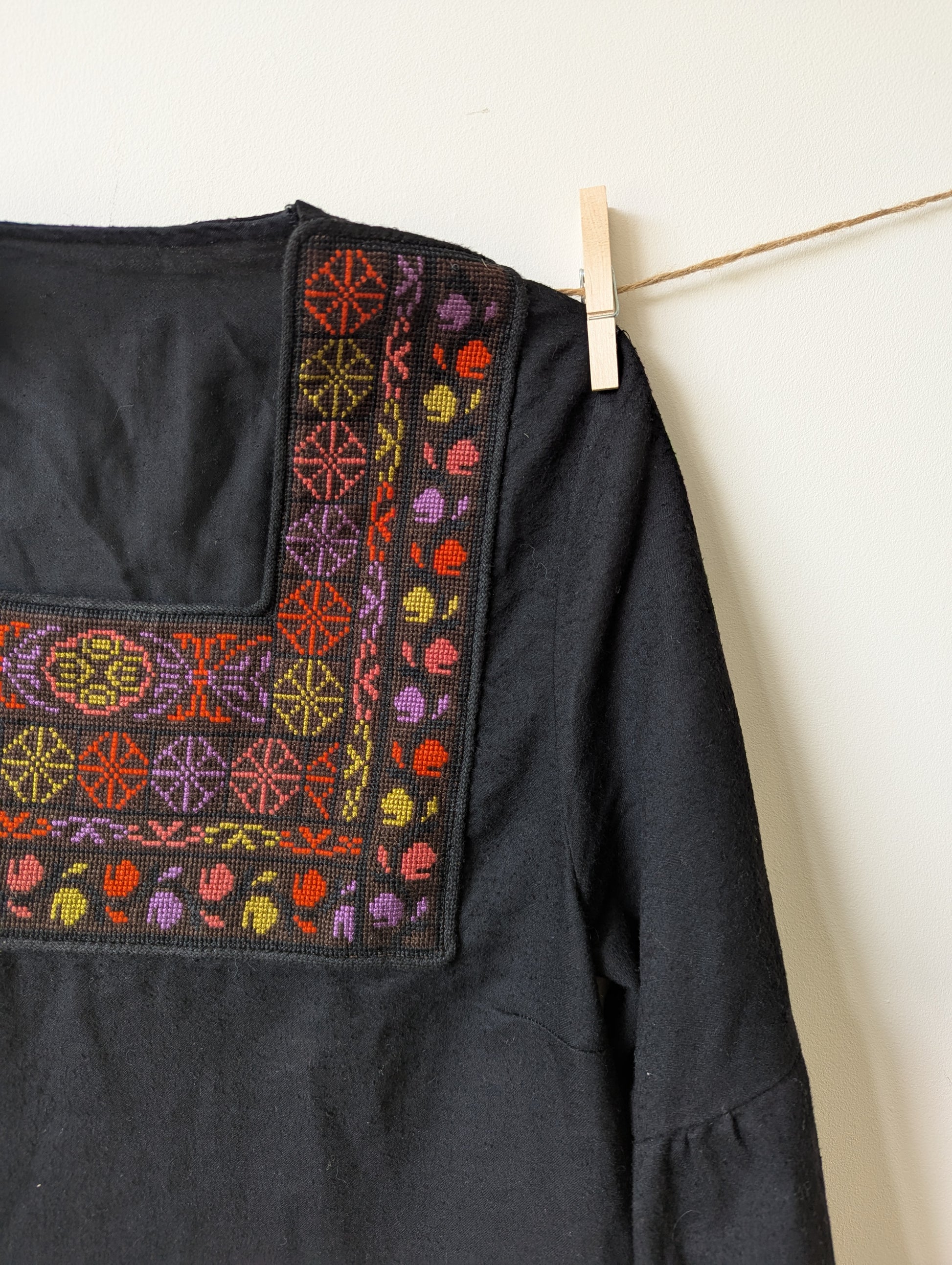 Mooi zwart shirt met uitlopende mouwen. Geborduurde hals.