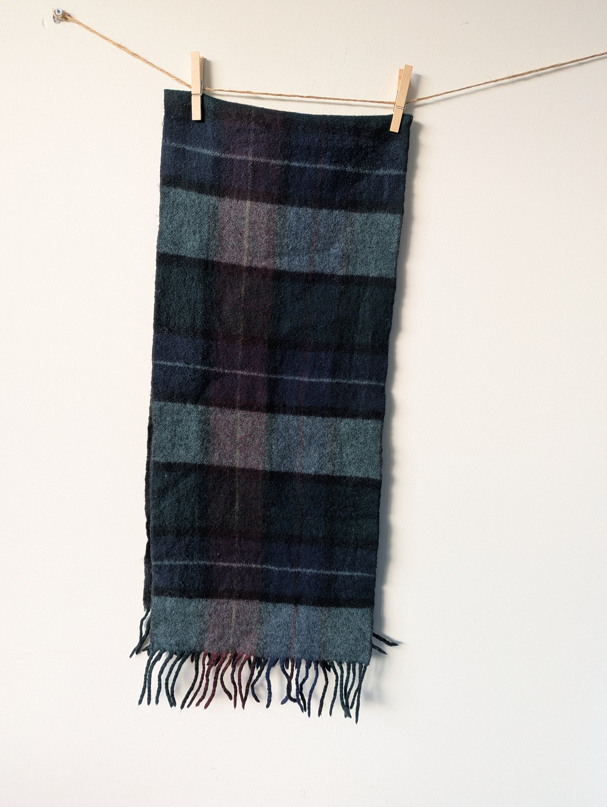 Mooie geruite wollen sjaal. Binnenkant zwart buitenkant donkergroen,marineblauw, bordeaux rood en min/turqoise achtig.