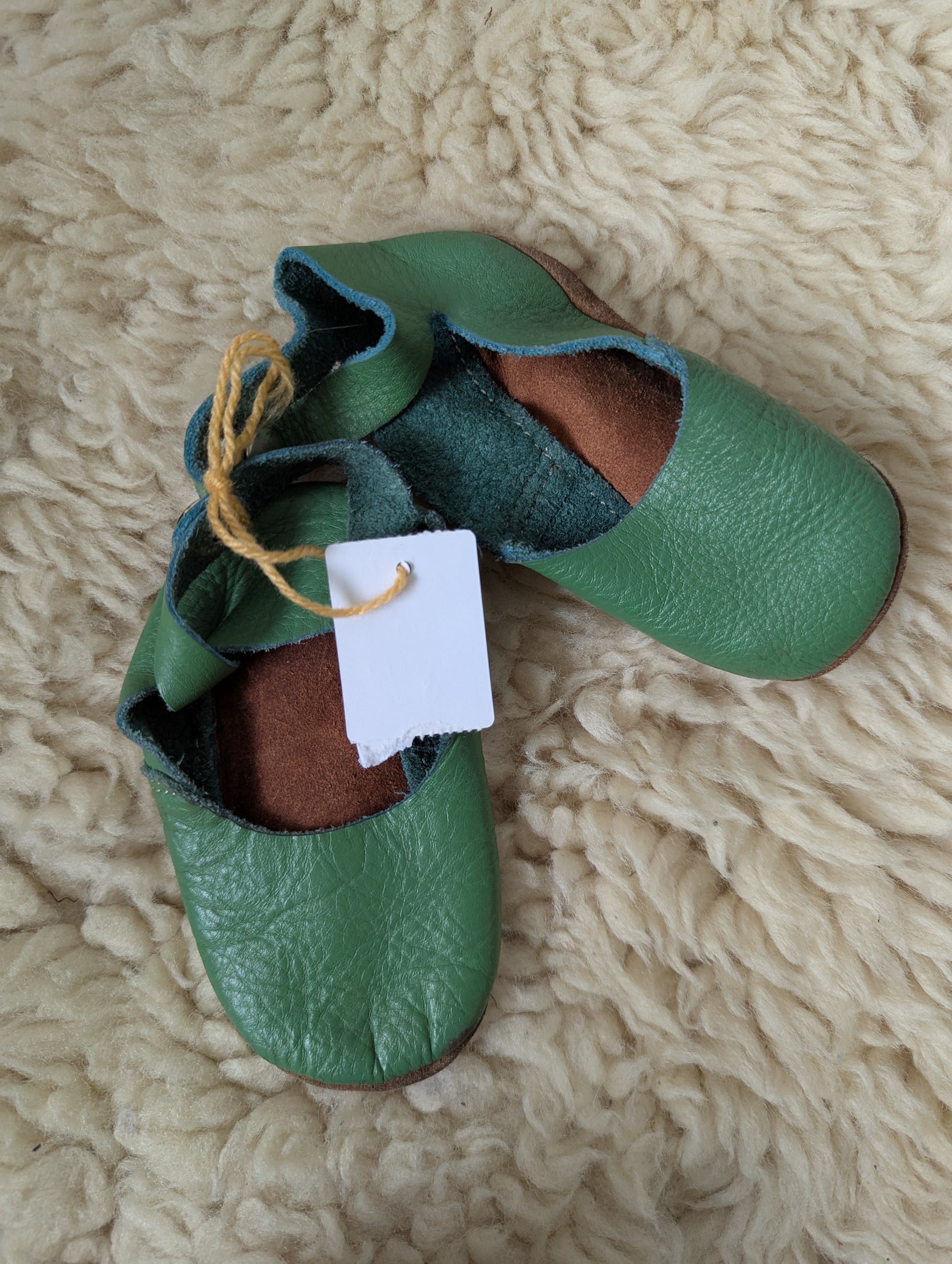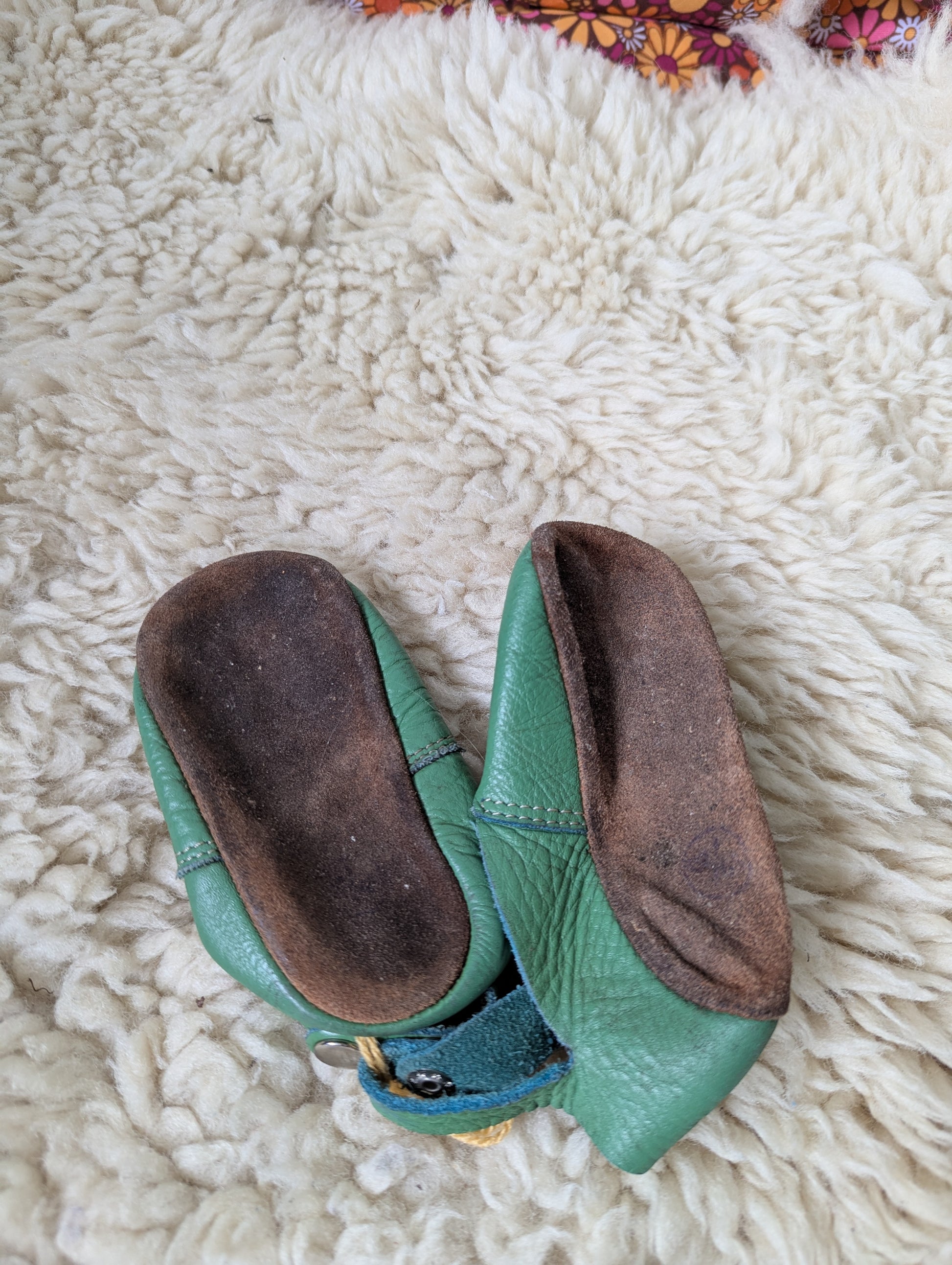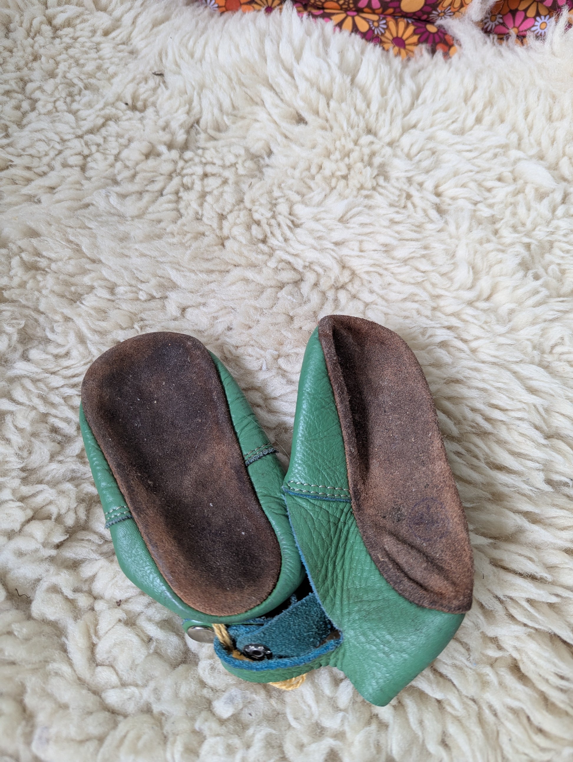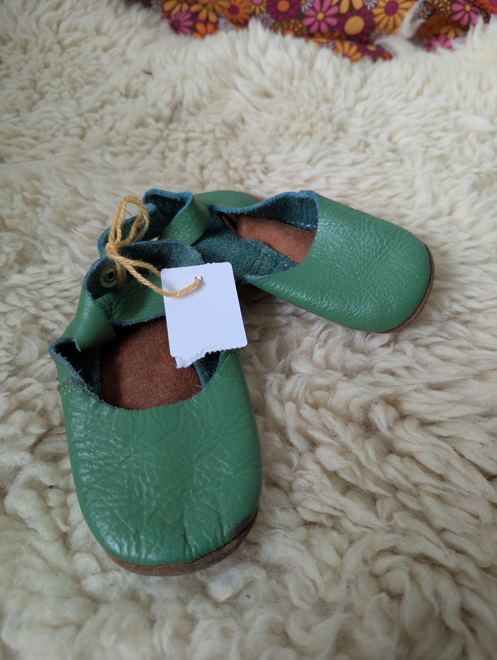 Mooie groene leren slofjes met sluiting om enkel. lichte gebruikssporen