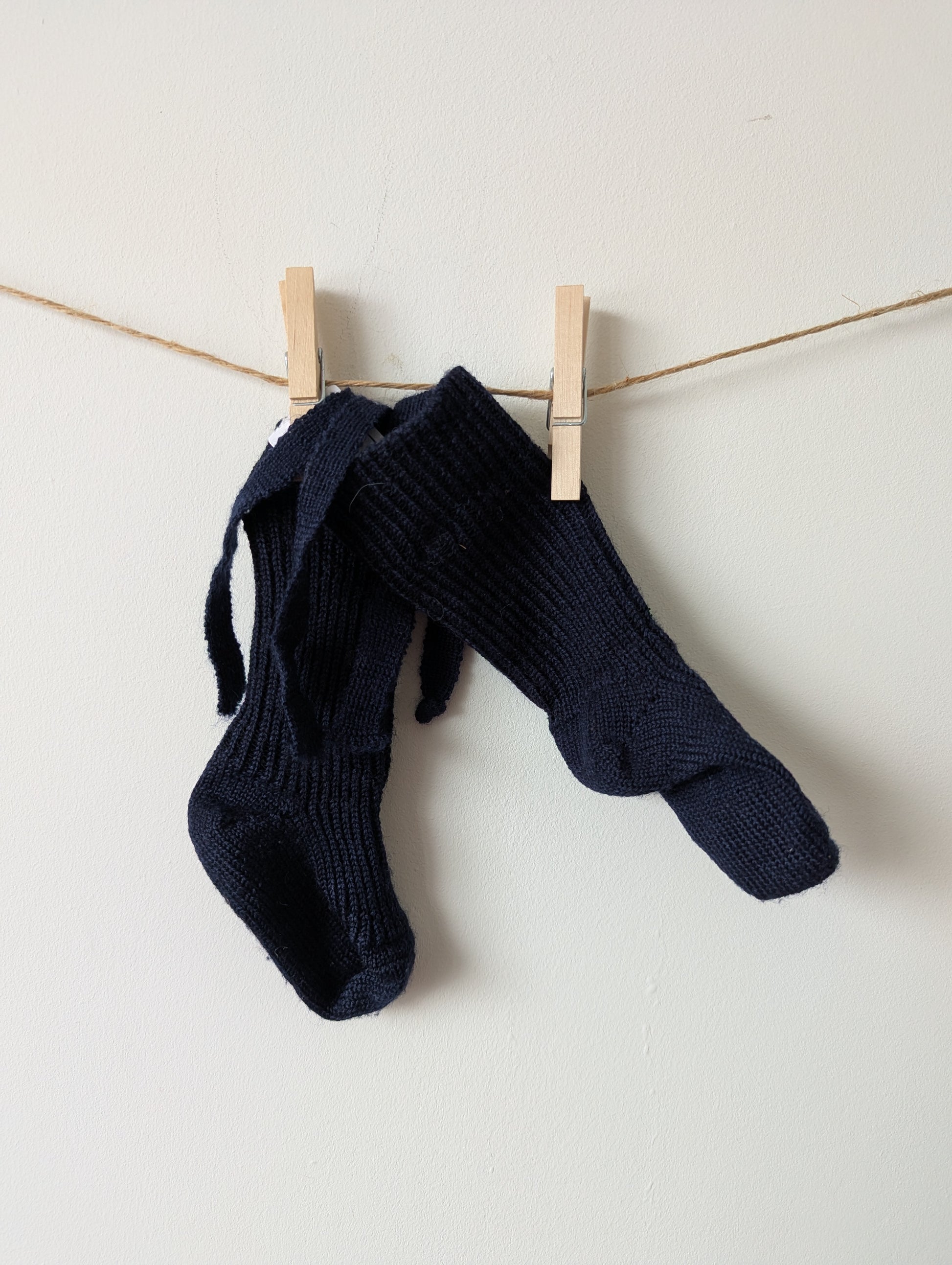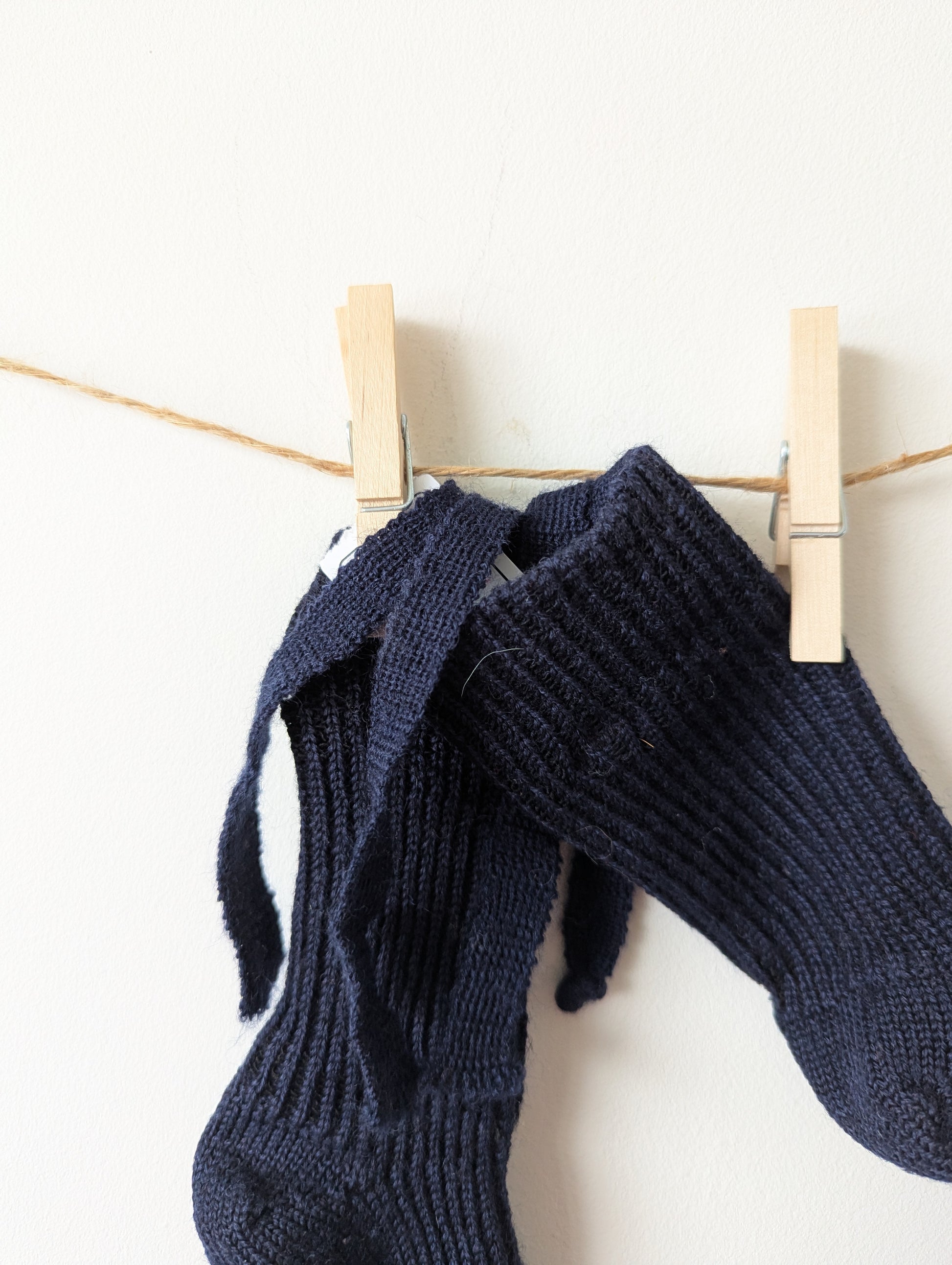 Marineblauwe sokken met strikjes. Ideaal omdat de sokjes vaak uitgaan bij de kleintjes.