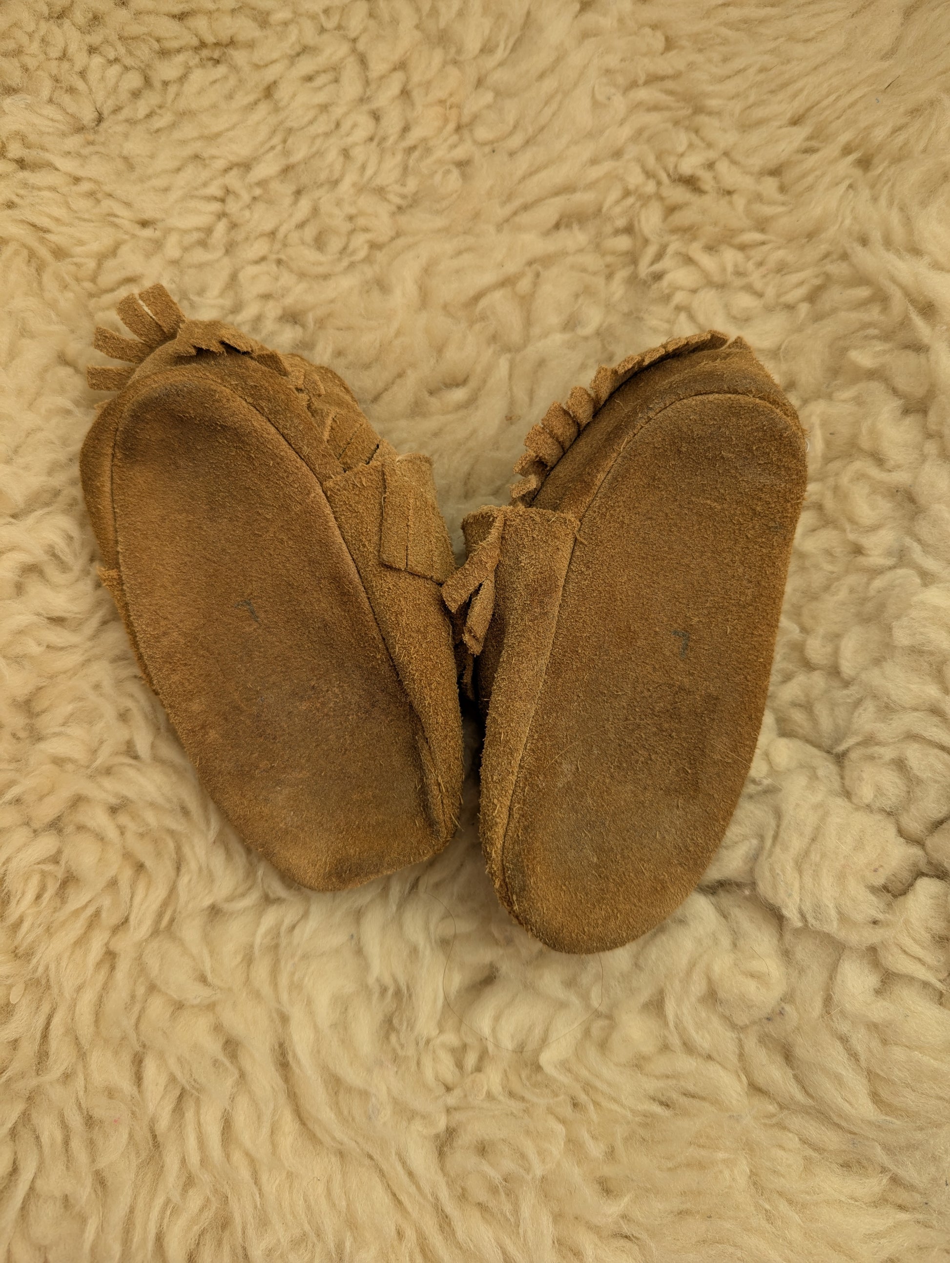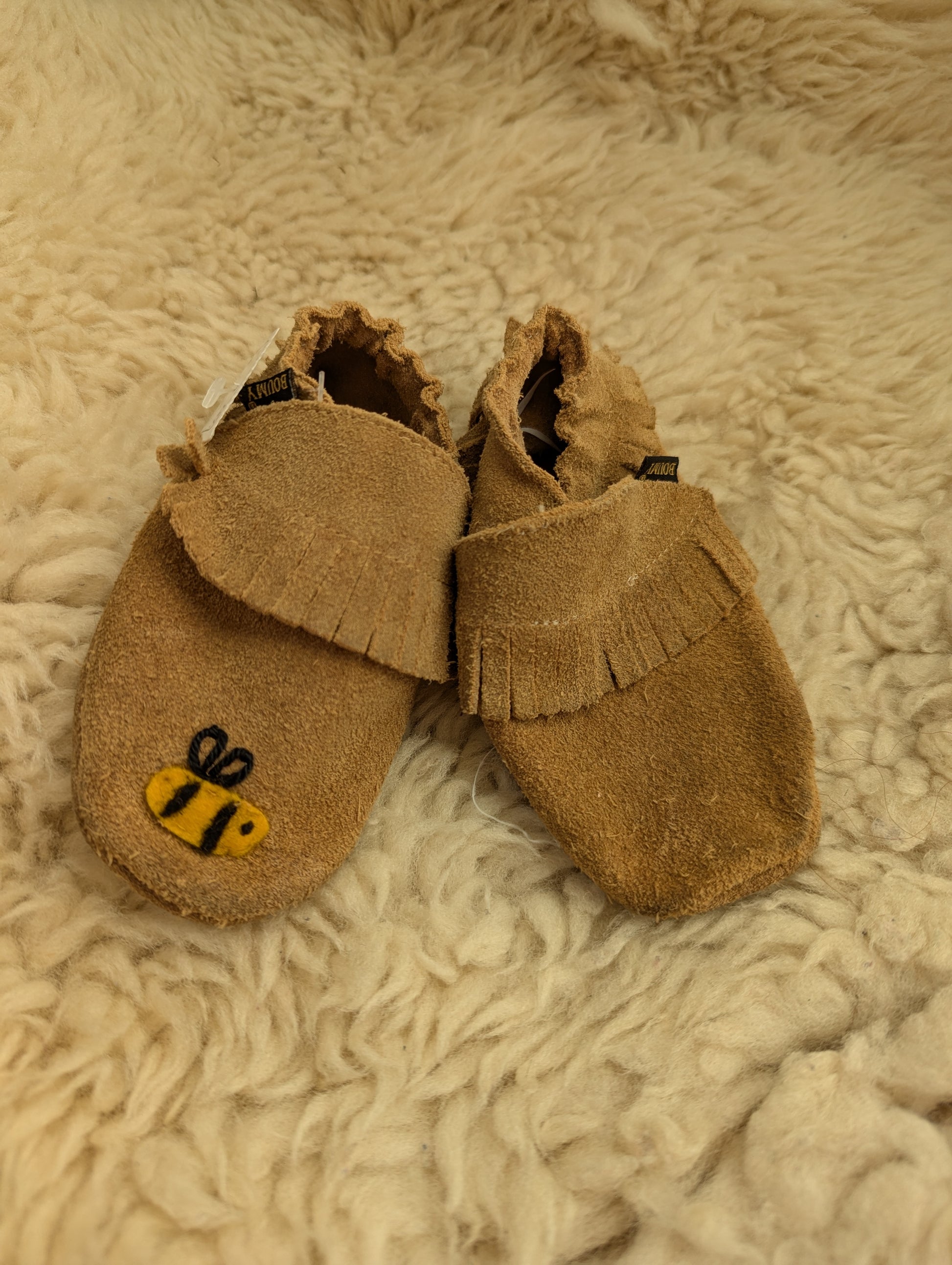 Suède slofjes met franje. Er zat een gaatje in de voorkant daar is een bijtje op genaaid.