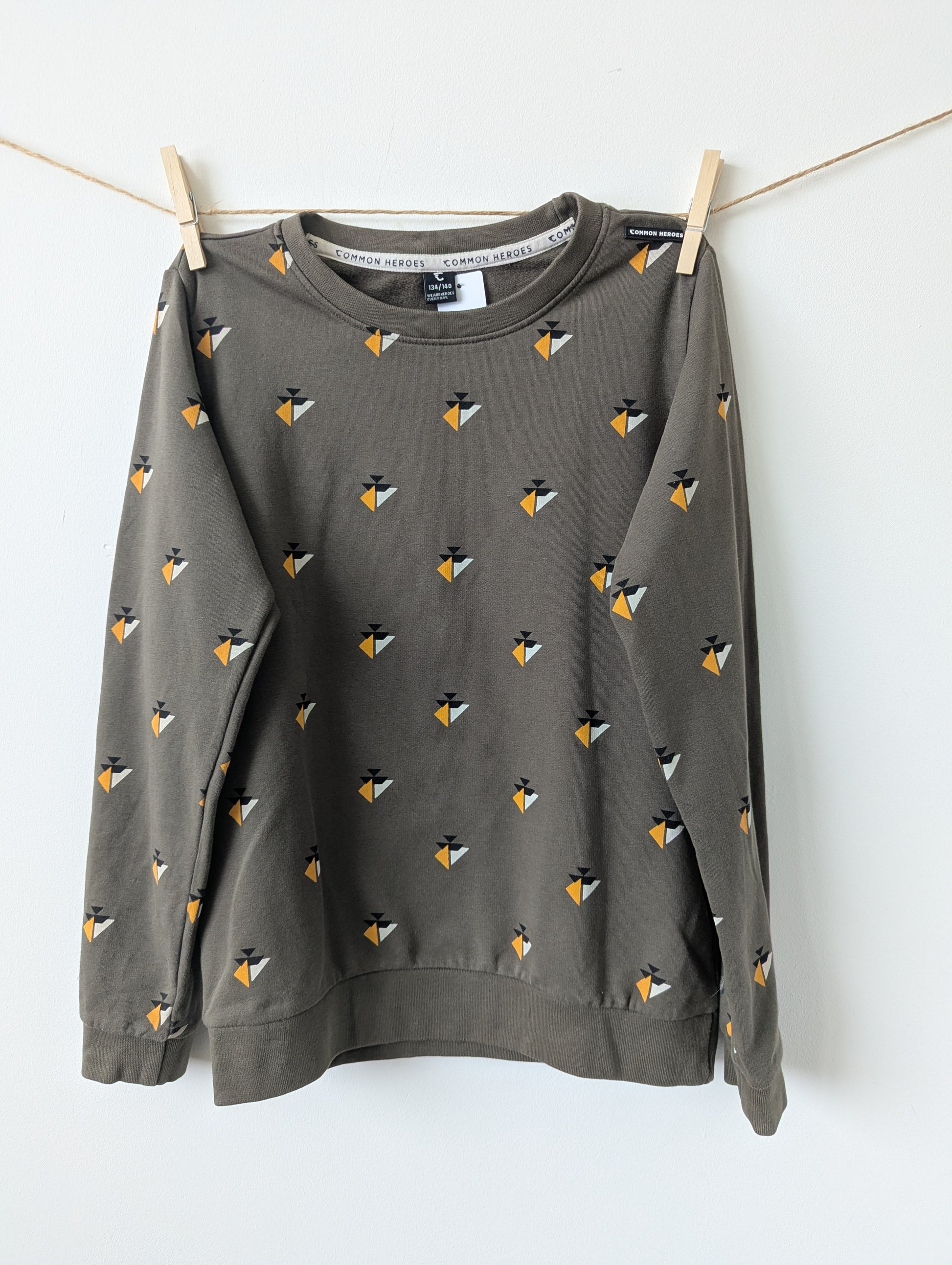 Khakigrijze trui met oranje zwart witte vormpjes. In heel goede staat.