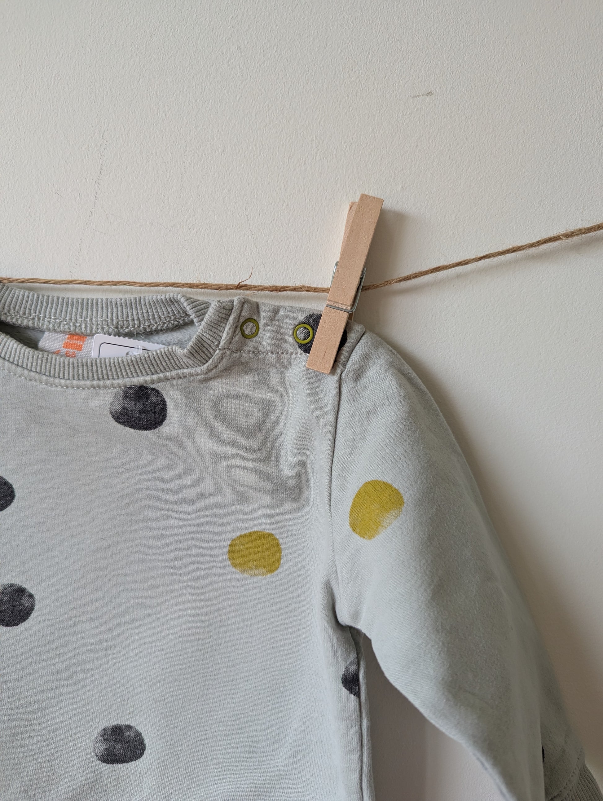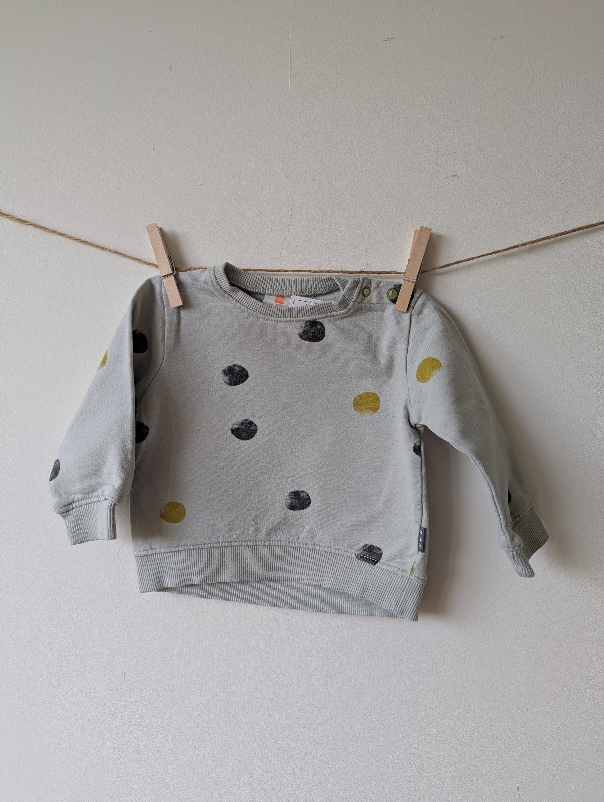 lichtblauw/groene sweater met stoppen in zwart en mosterdgeel.