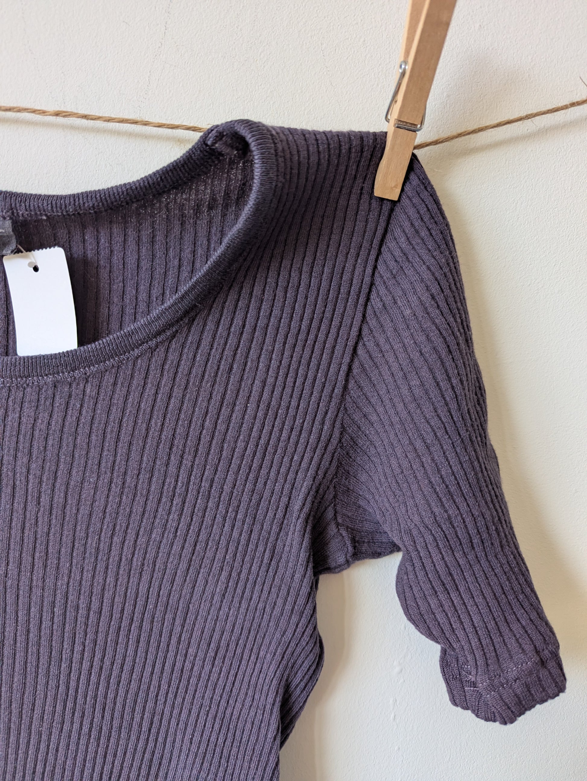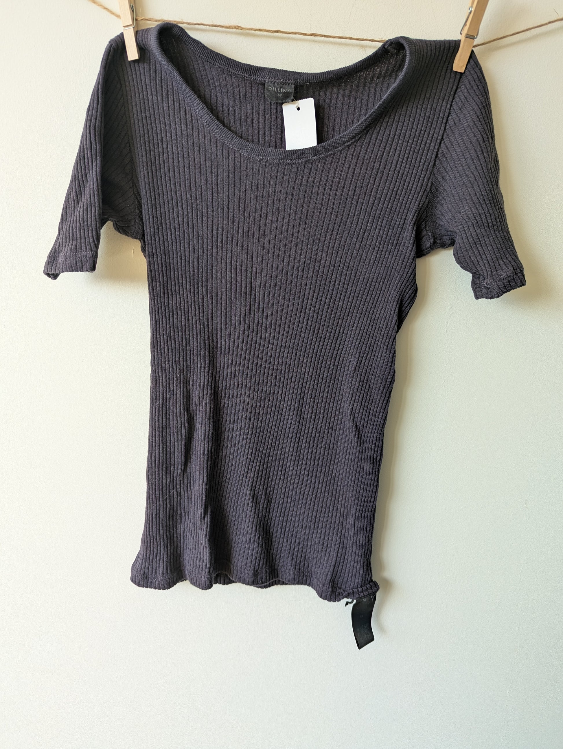 Paars ribbel shirt. Was een maat 38, heb nagemeten met de tabel van dilling is nu een maat 36. Je ziet niet dat hij gekrompen is.