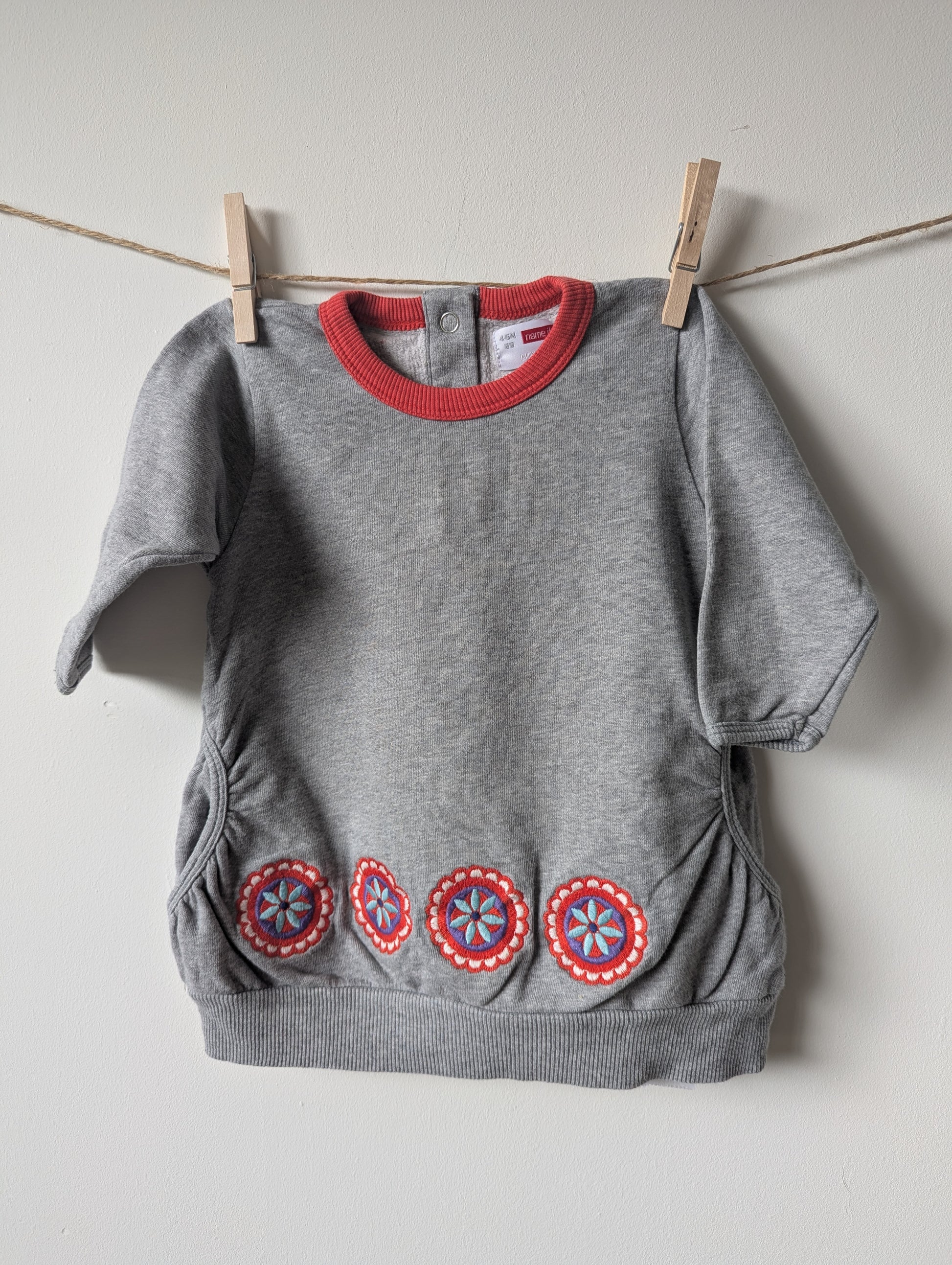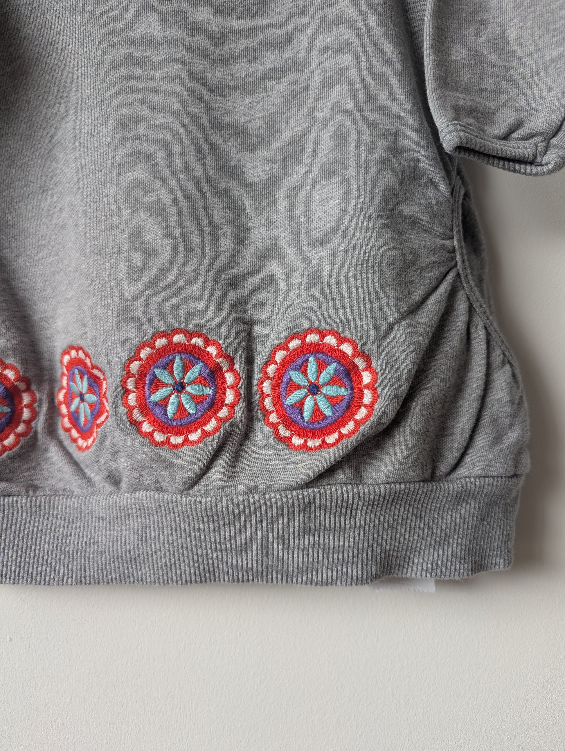 Grijze sweaterachtige jurk met leuke bloemen onderaan