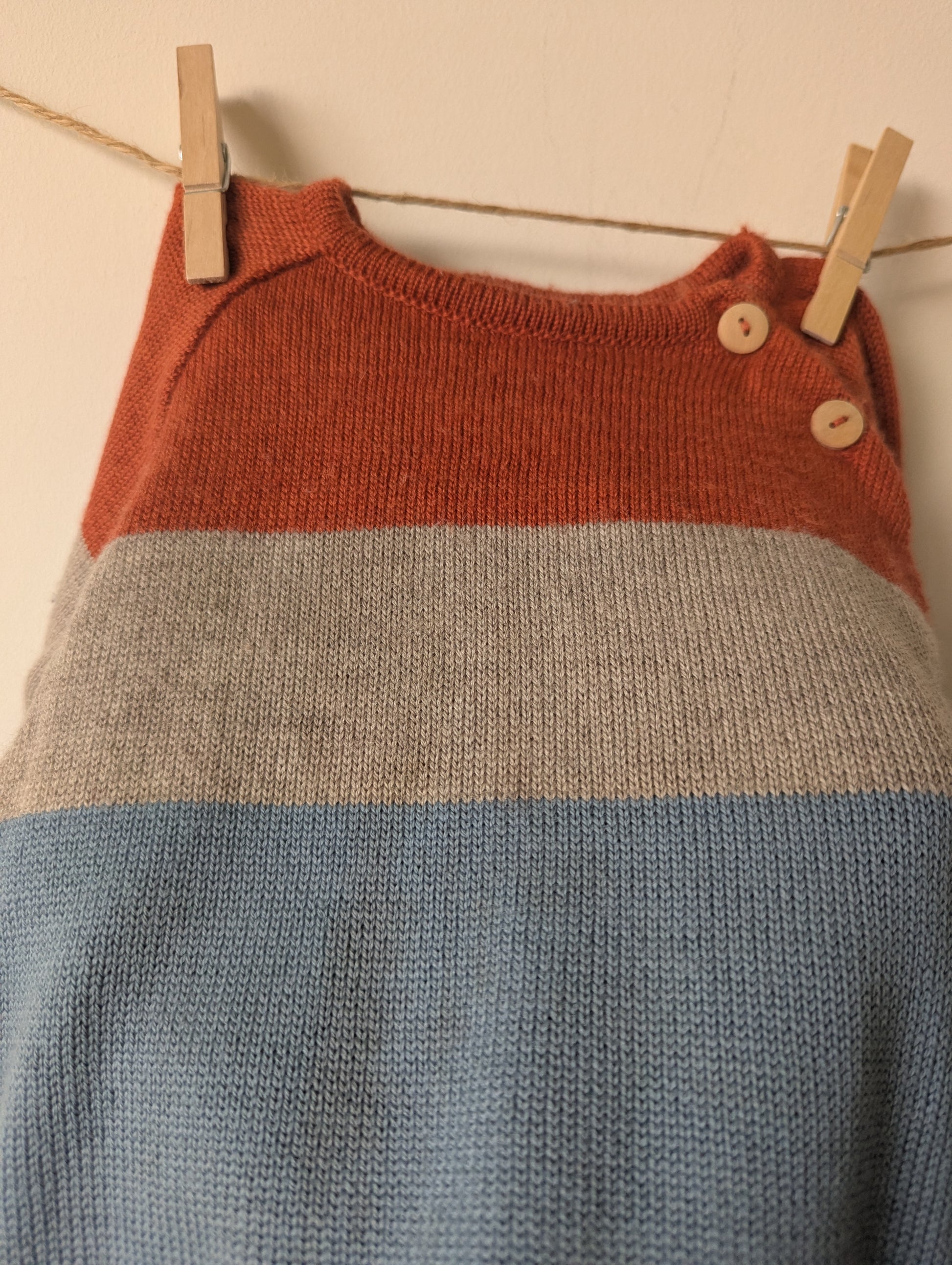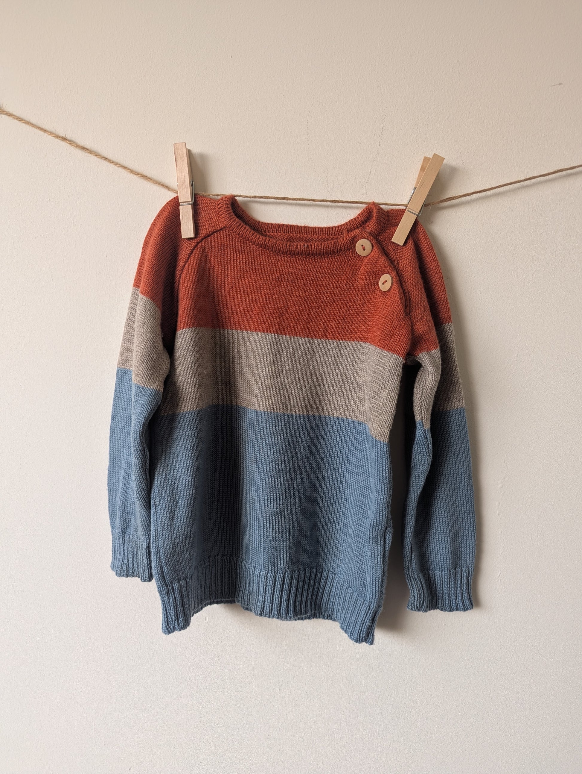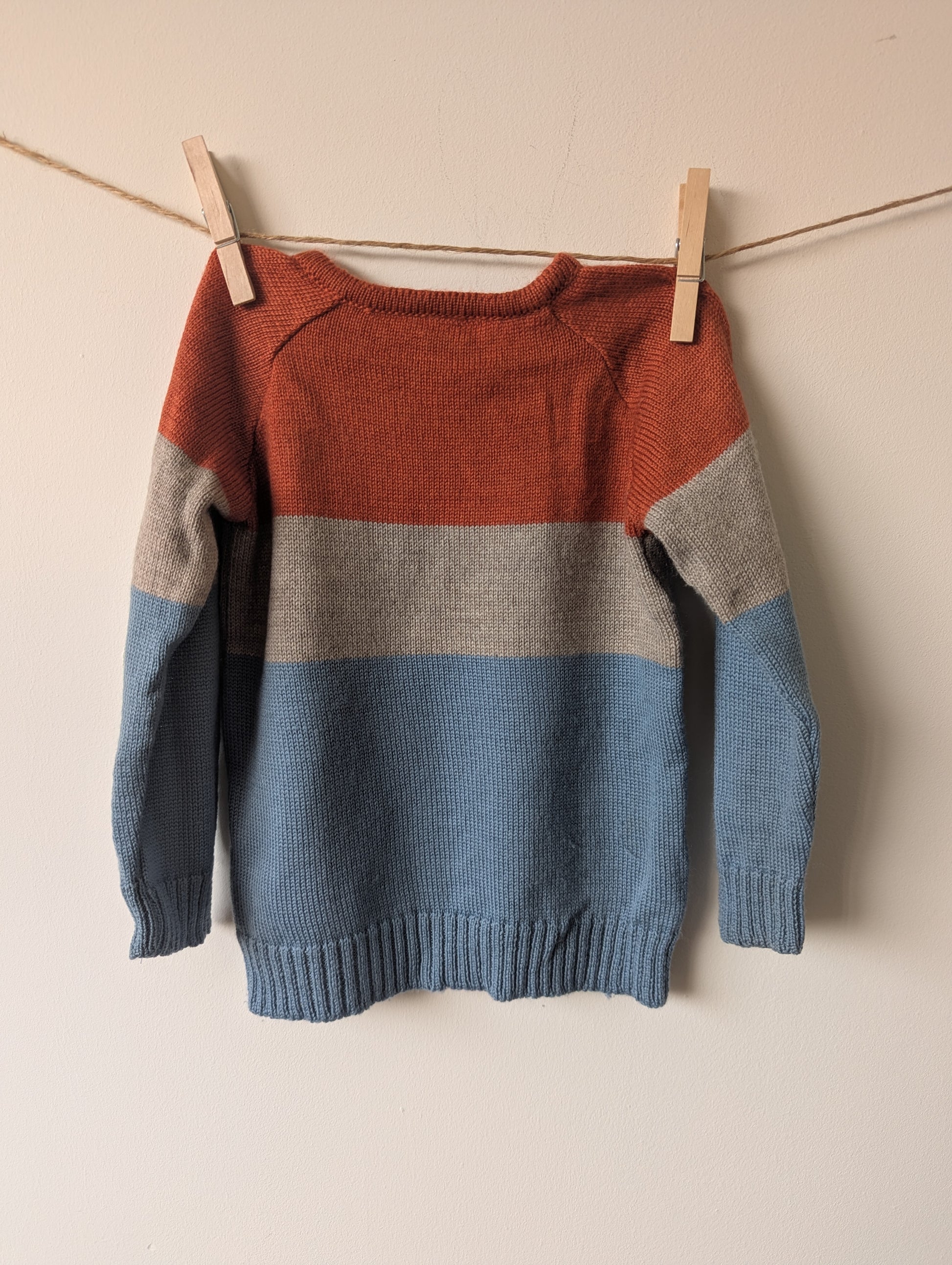 Trui in oranje grijs en blauw. Heerlijk zacht, maar let op er zit een vlek aan de voorkant. Ik heb hem 1 keer in de was gedaan en een groot deel was er uit, dus ik denk met nog wat liefde en een wasbeurt dat het zo kan dat alles eruit gaat :)