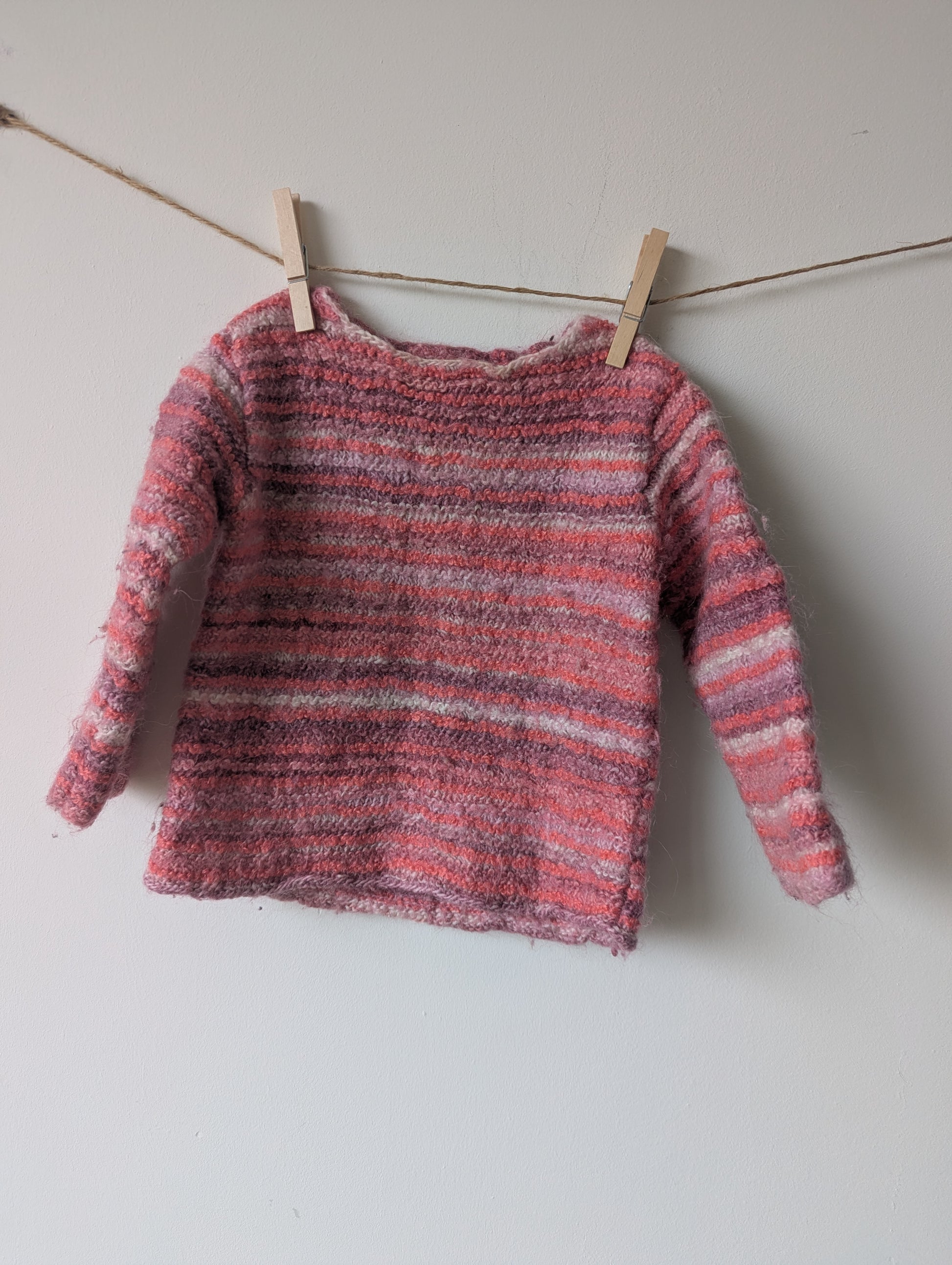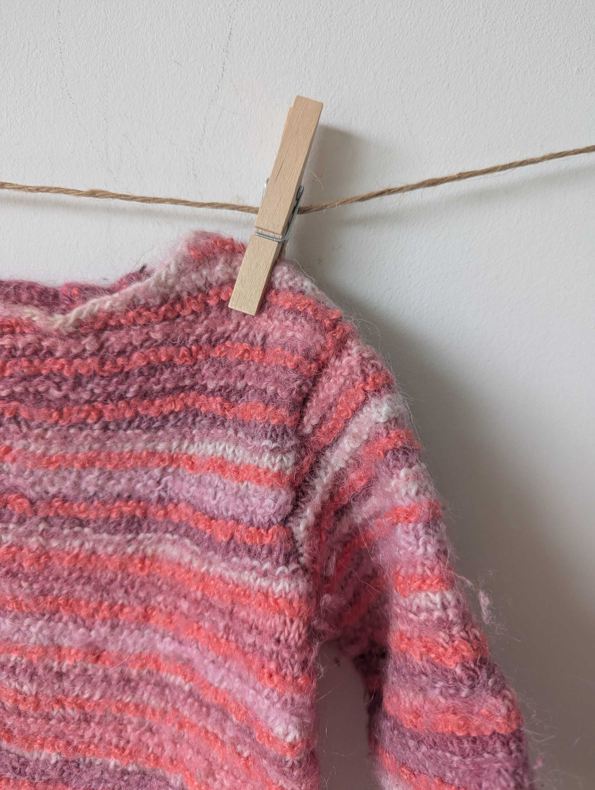 Gebreide trui in roze wit en lila. Stof is onbekend, maar er zit sowieso een groot deel wol in of helemaal wol.