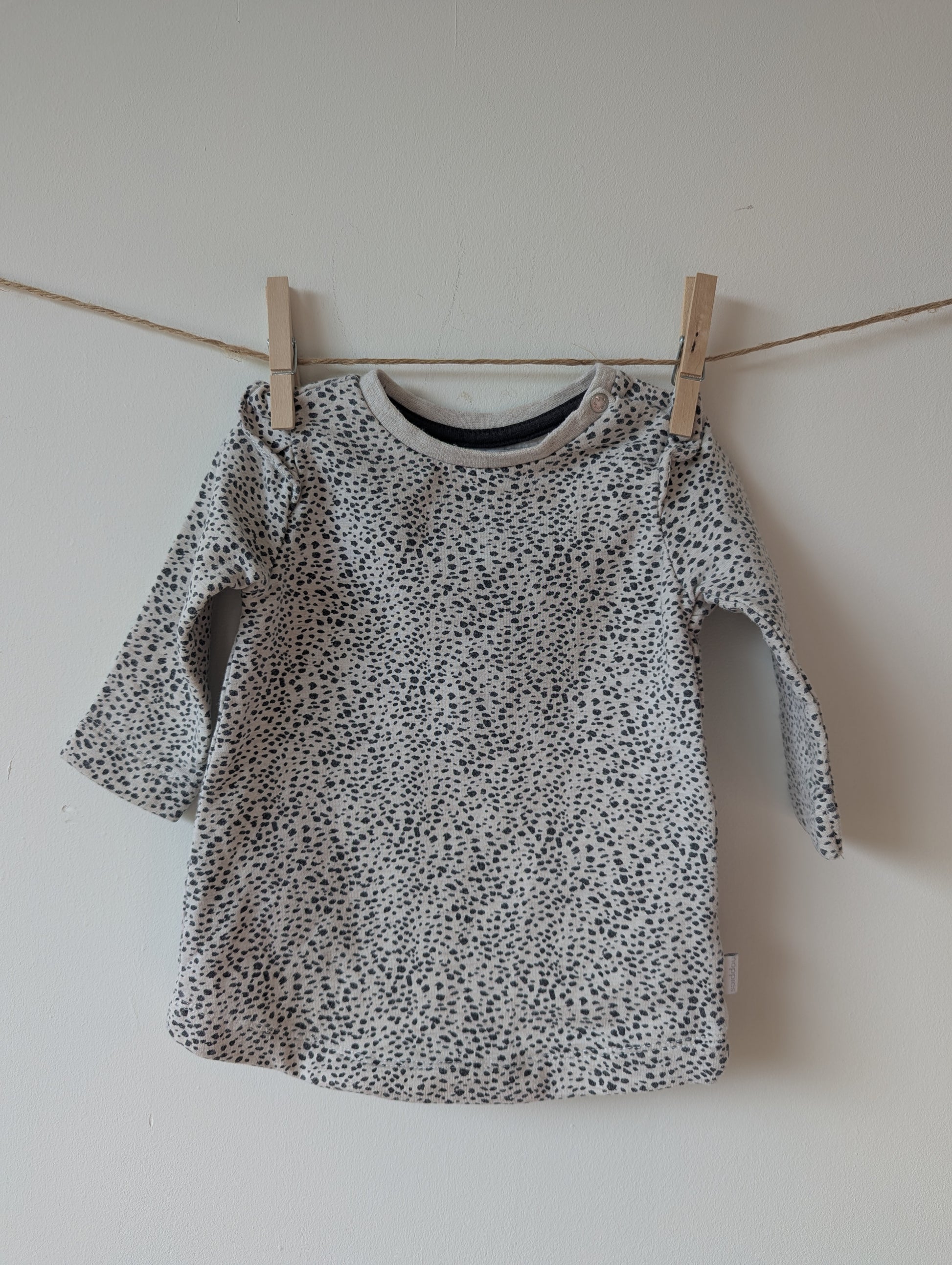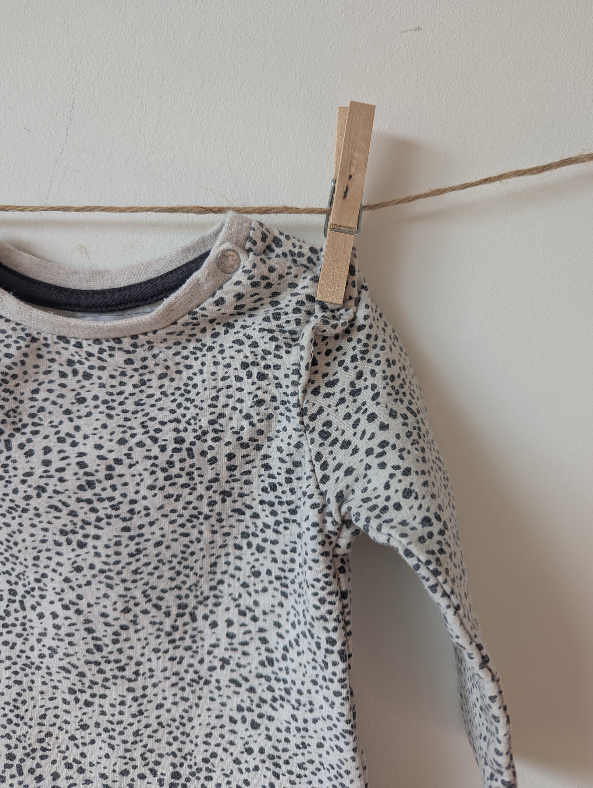 wit truitje met zwarte spikkels roezeltjes bij de mouwen