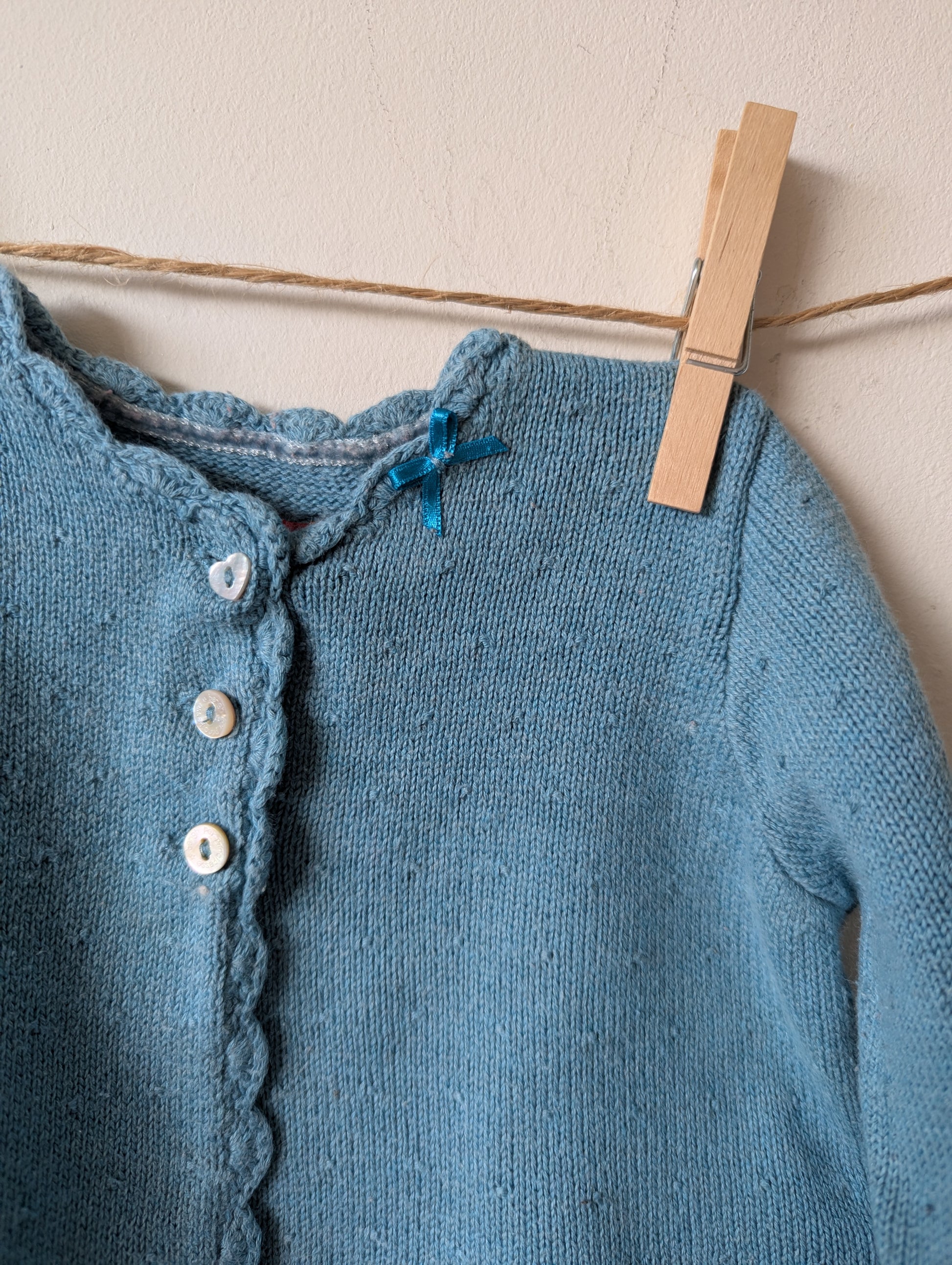 Blauw vestje met werkje erin gebreid. Bij deze zie je dat een ander kindje hem al aangehad heeft, wat vaker gewassen. Nog wel in goede staat