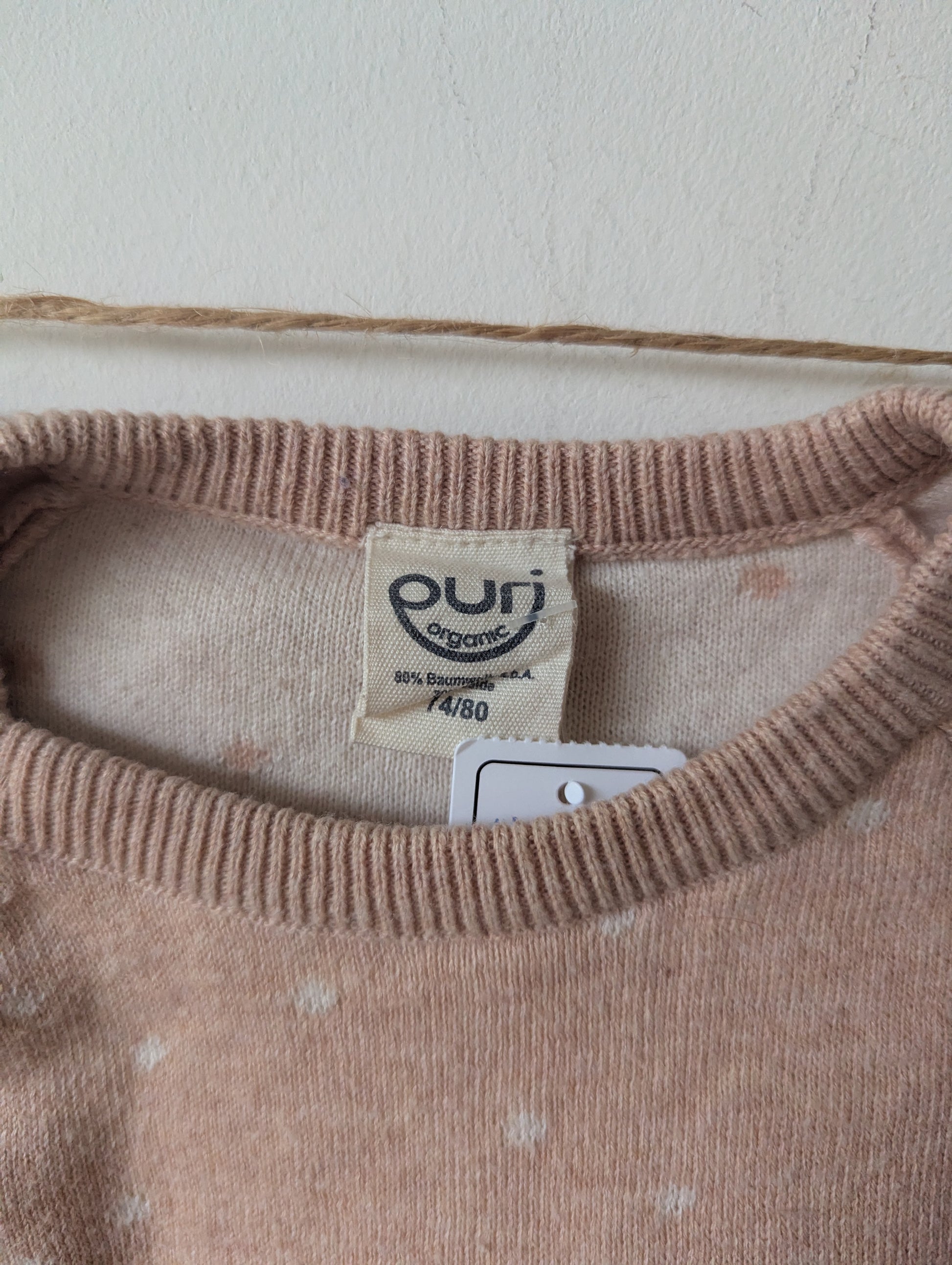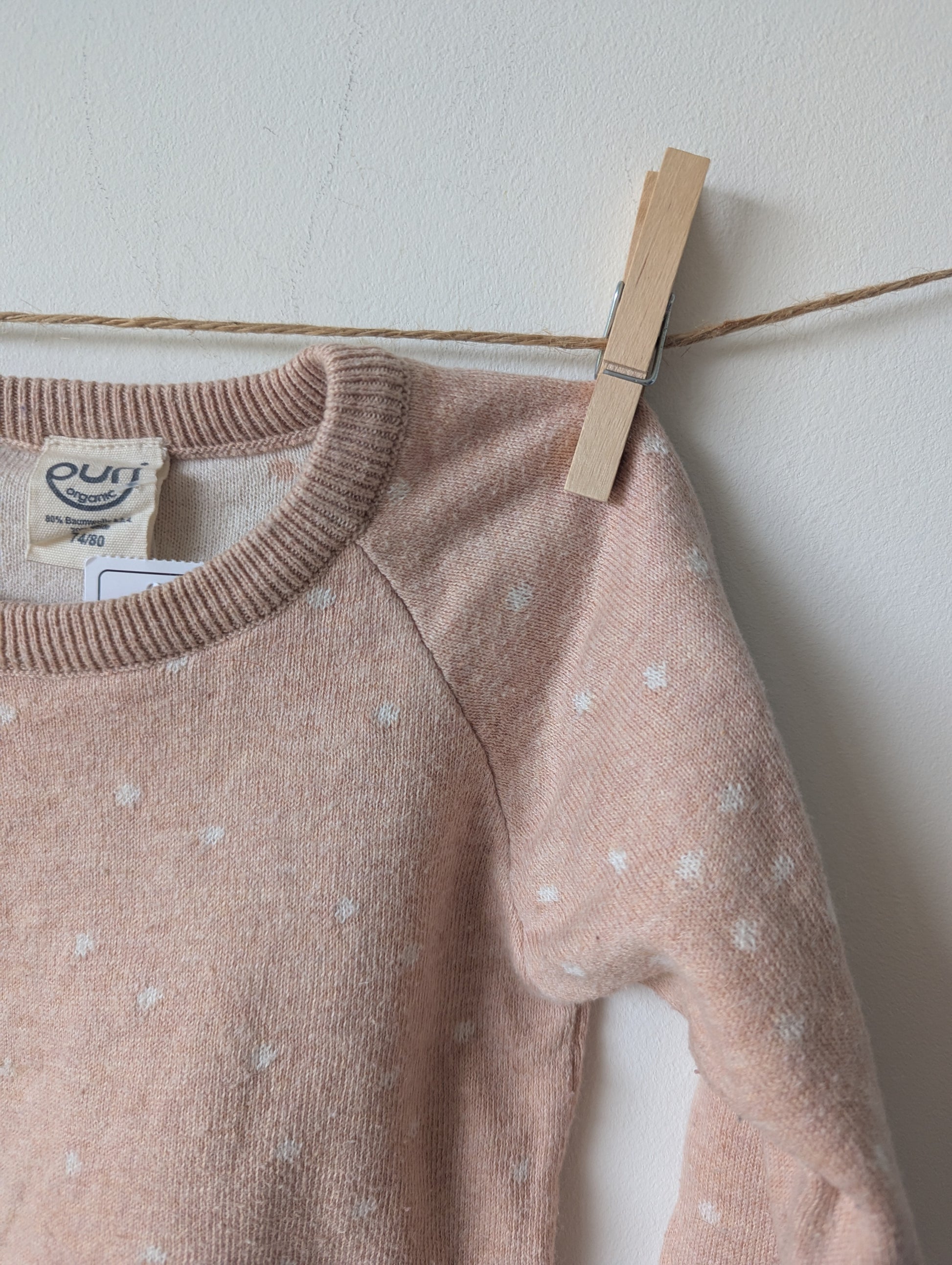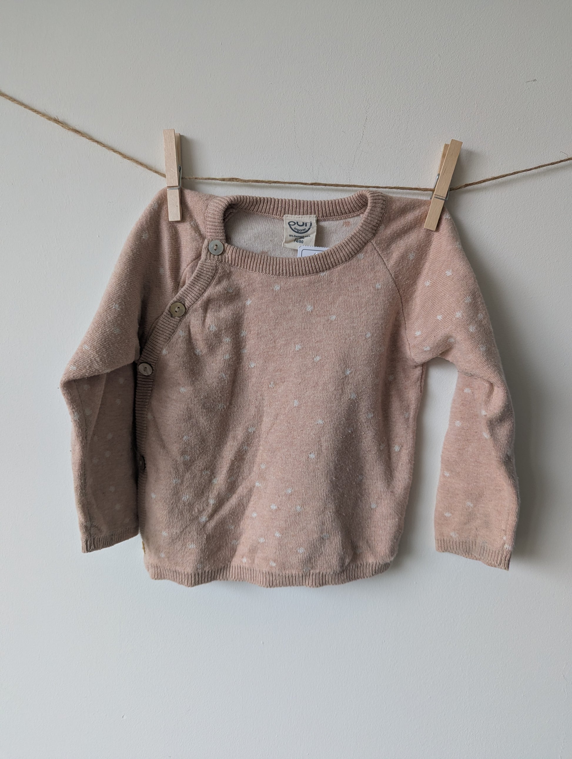 Zacht vest met parelmoer knoopjes. Er zitten wat vlekjes in op de voorkant zie foto, zijn geen donkere vlekken dus valt niet enorm op. Je ziet ze wel!