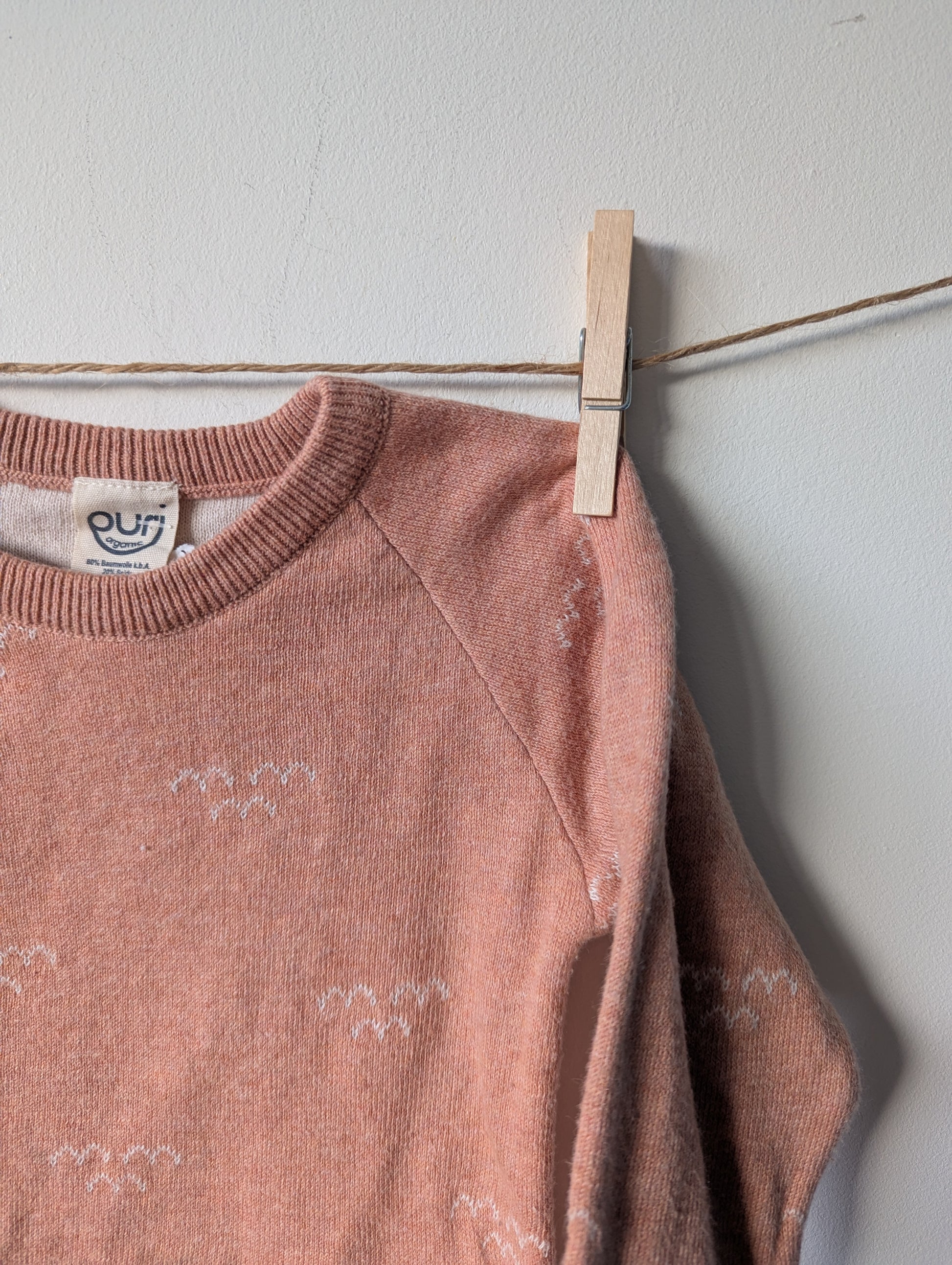 Zacht vest met parelmoer knoopjes. paar vlekjes, ik zie ze zonder zonlicht niet. Maar heb het wel op t labeltje gezet dus ze zitten erin... maar waar? Zie foto.