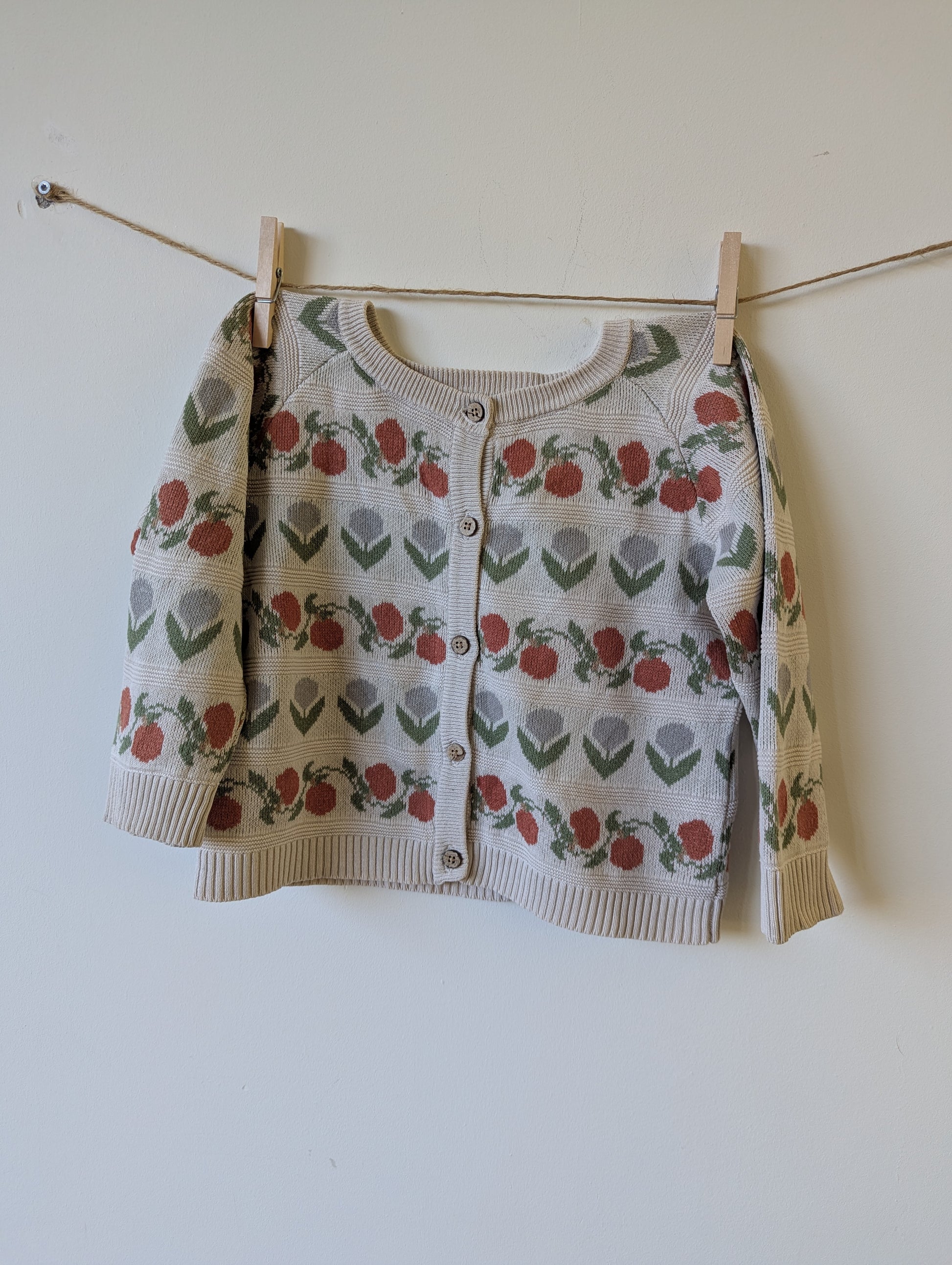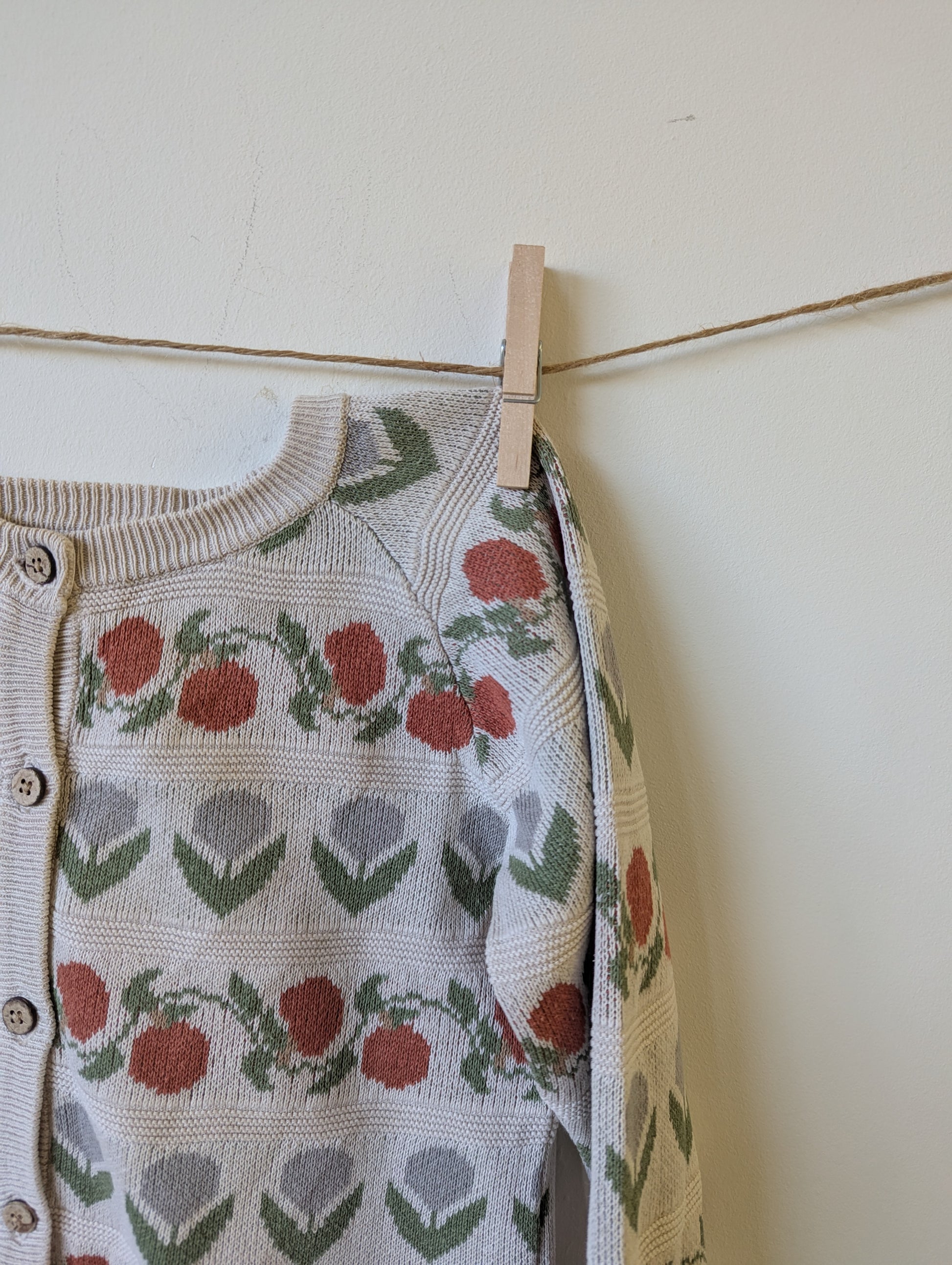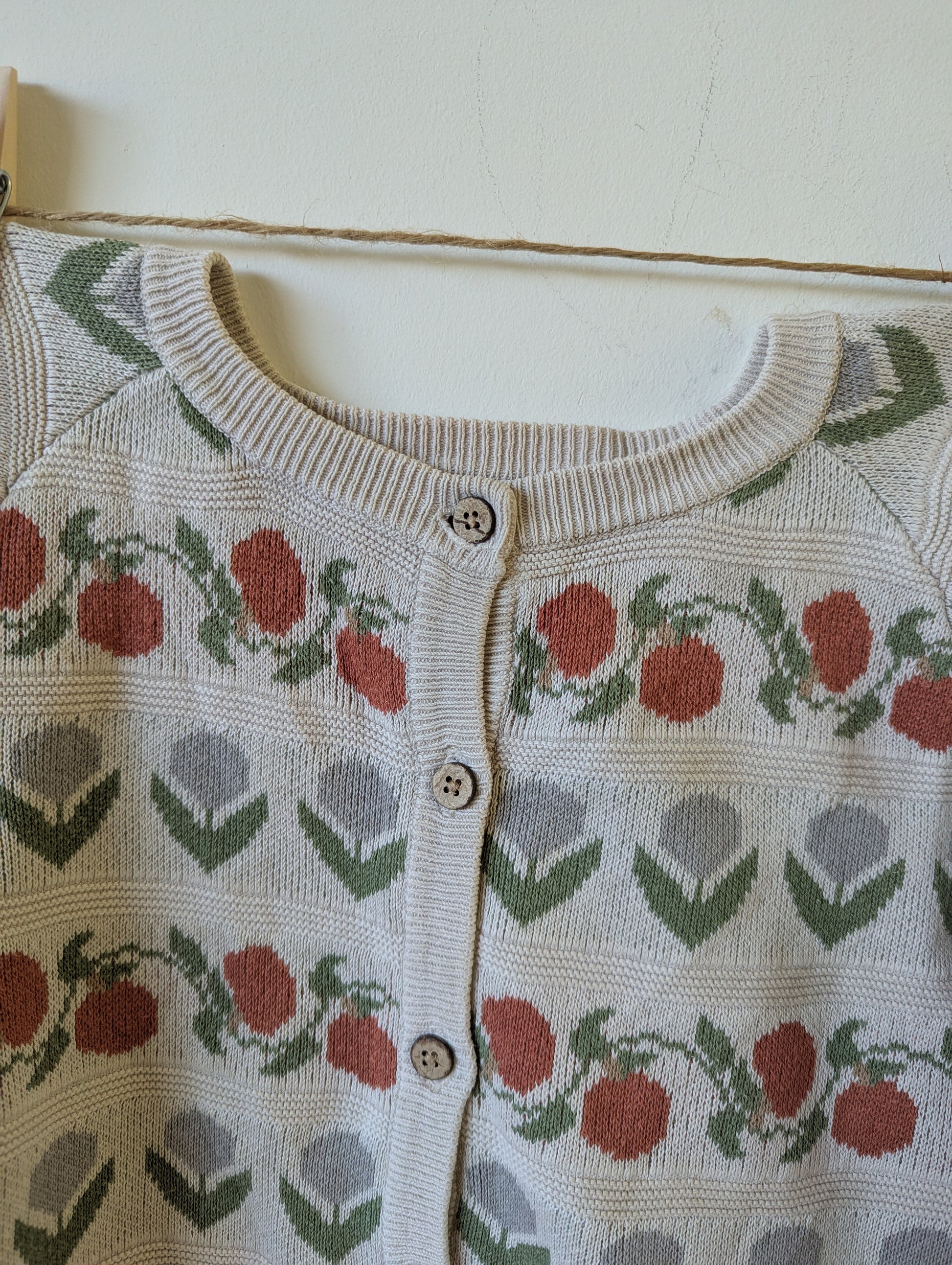 Prachtig katoenen vestje van lil'atelier. Met bloemetjes en appeltjes. knoopjes van kokosnoot. Als mijn kinderen er niet te groot voor waren had ik hem zeker zelf gekocht.
