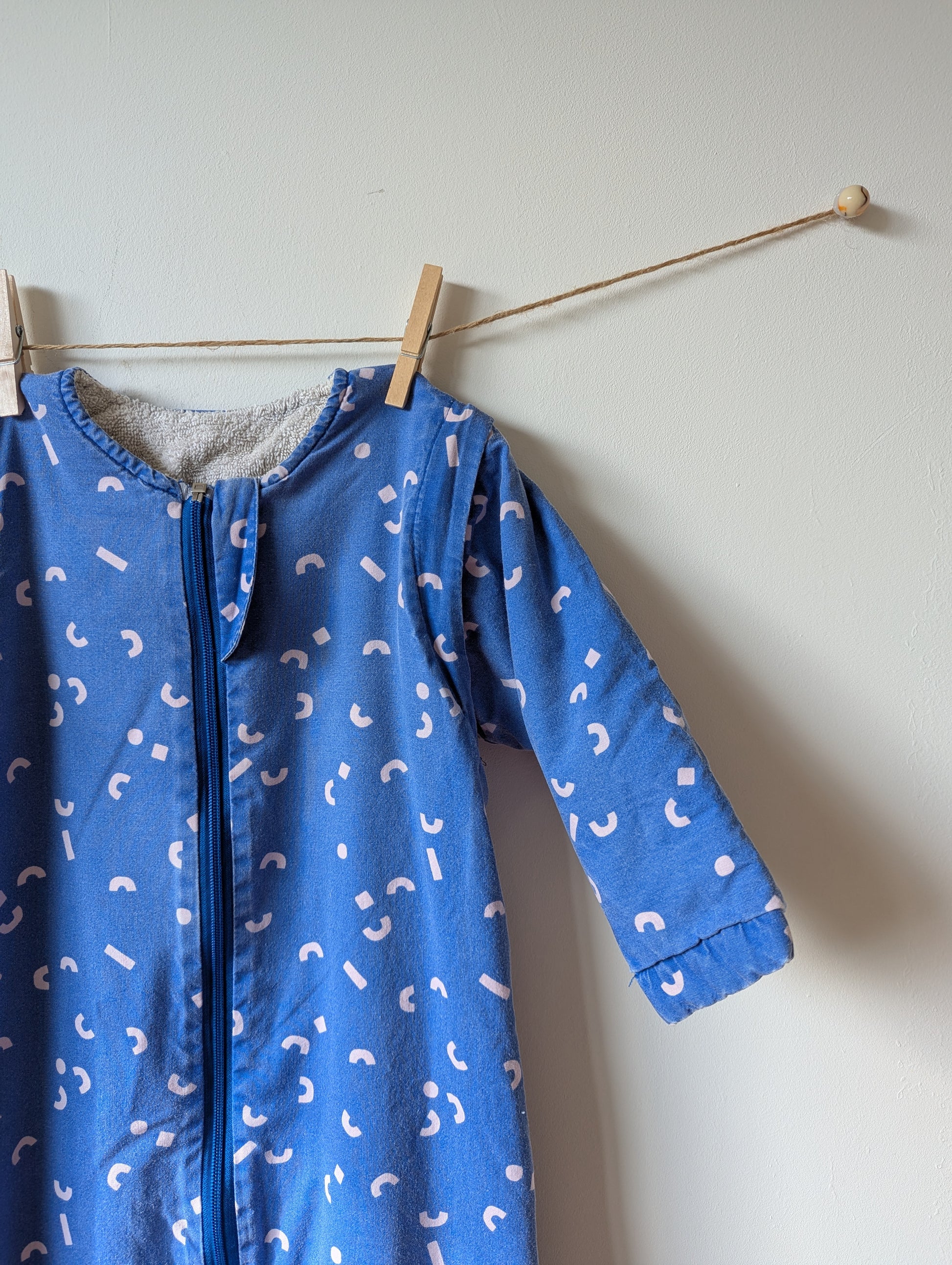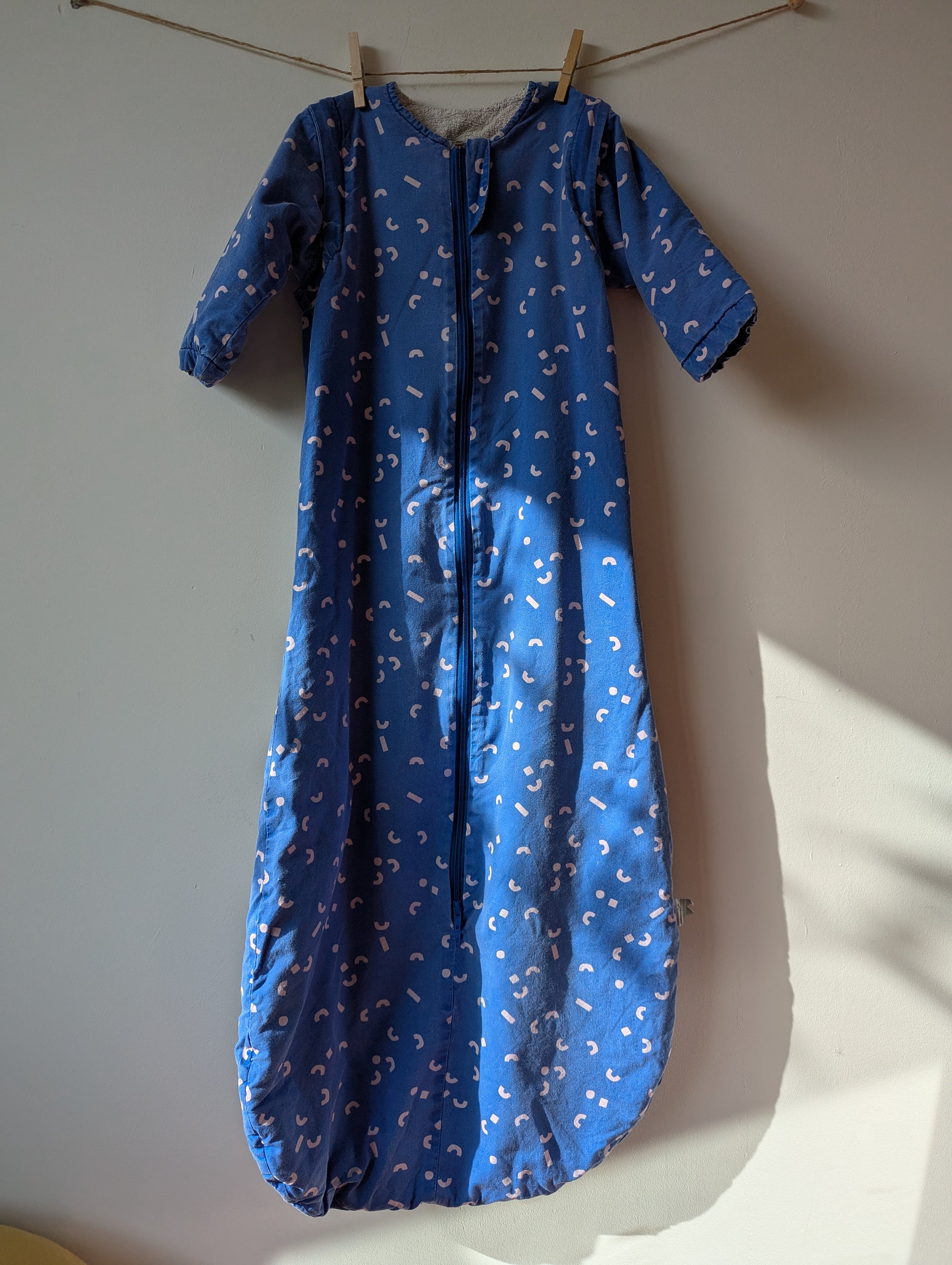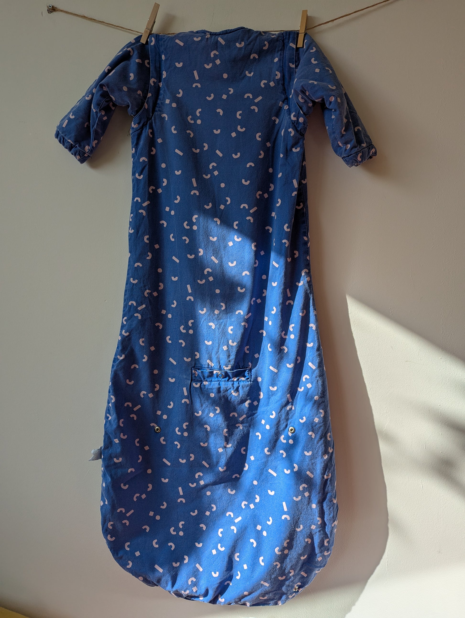 Slaapzak van het merk Trixie. De slaapzak is 108 cm lang maar heeft drukknopen waardoor je m al kunt gebruiken vanaf maat 80 denk ik!