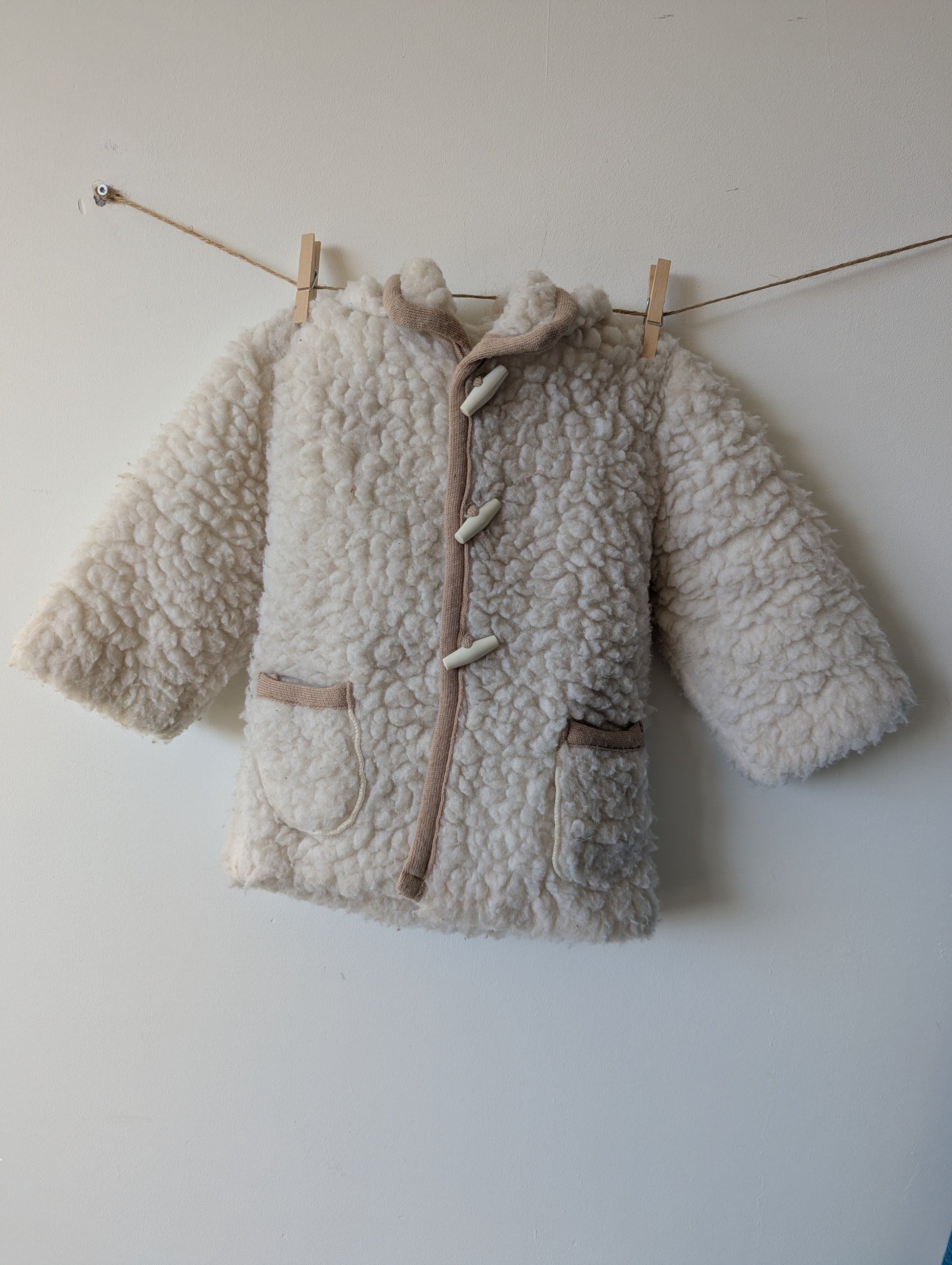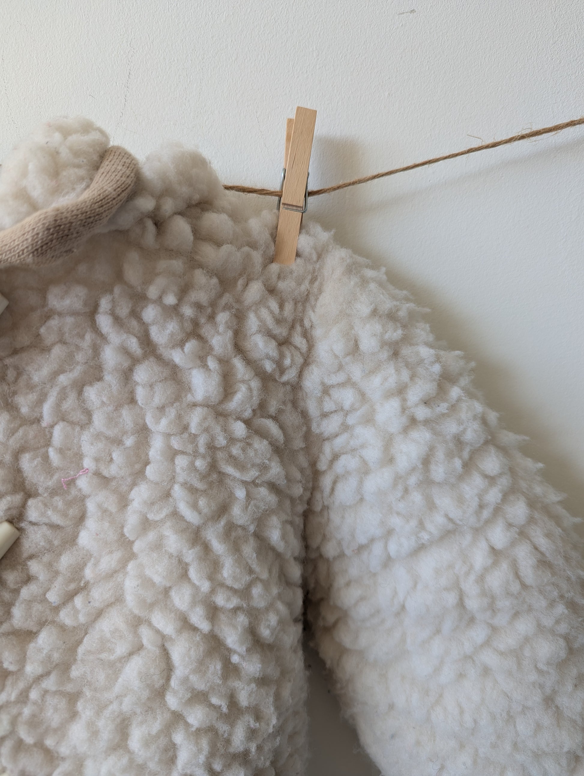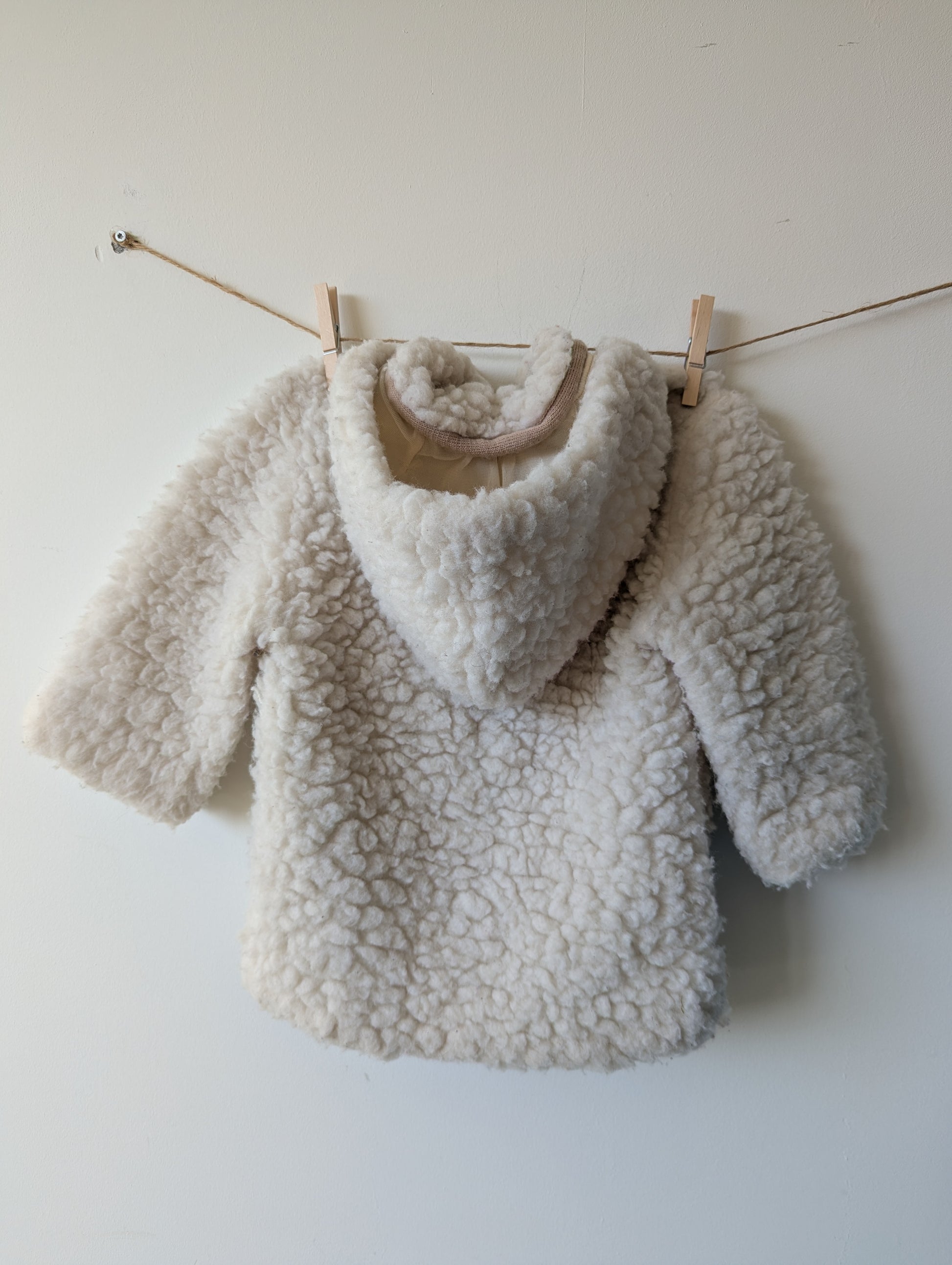 Mooi wollen jasje, lekker dik. Stofje aan de binnenkant is denk ik polyester. In de winter moet er wel nog veel onder of regenjasje ofzo over.