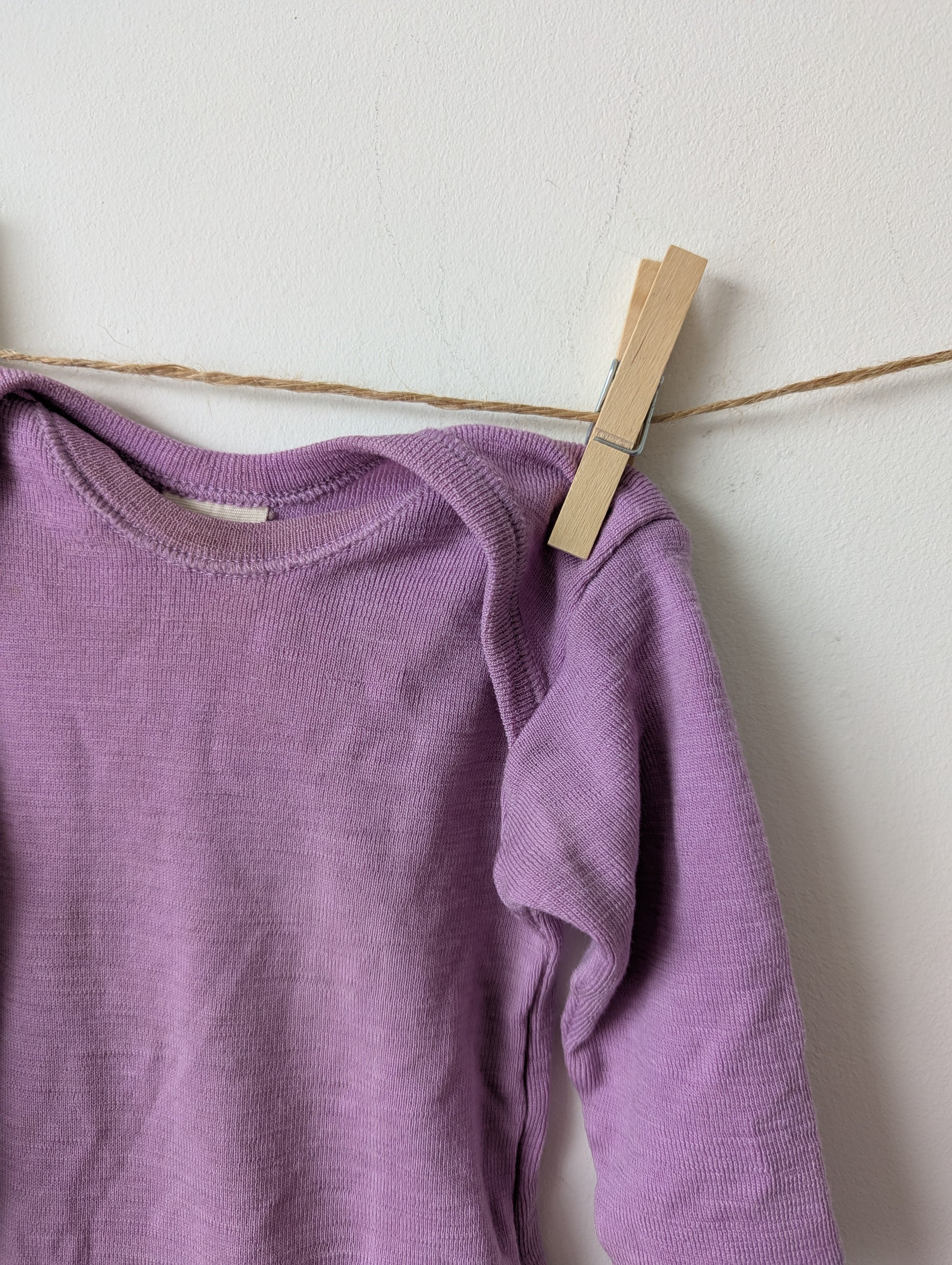 roze paarsachtige romper van wol. De stof is nog mooi wel een vlek bij de hals.