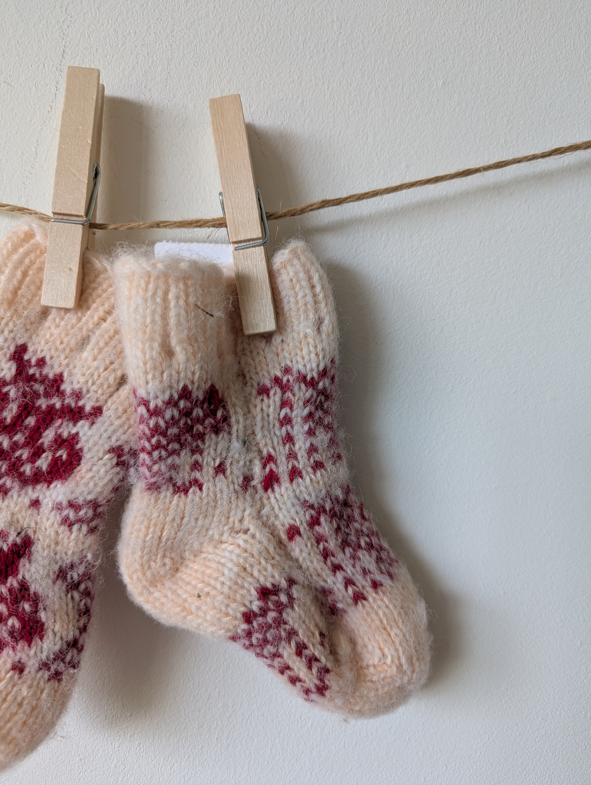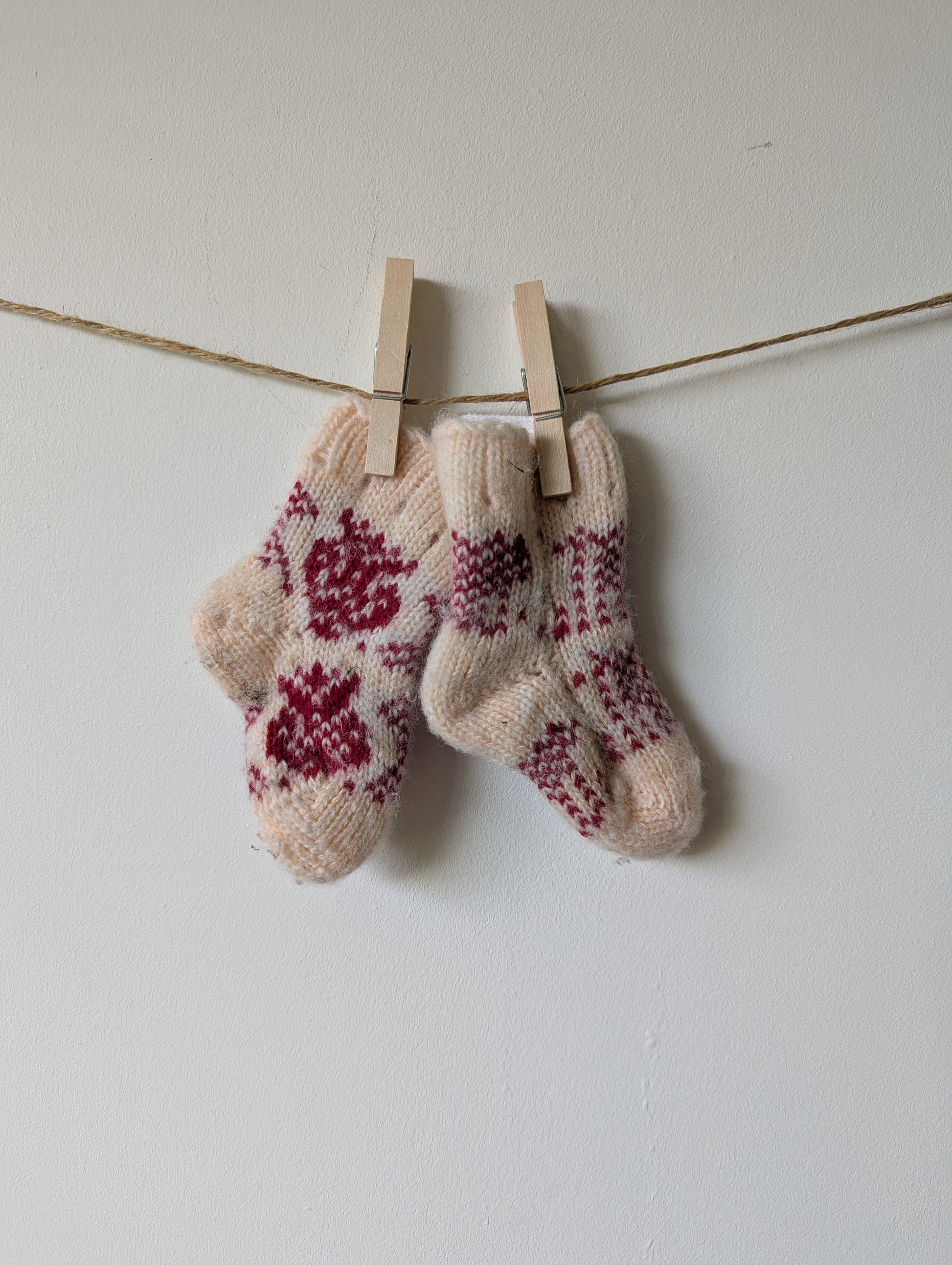 Witte wollen sokken met rood patroontje van een aardbei, zo leuk!