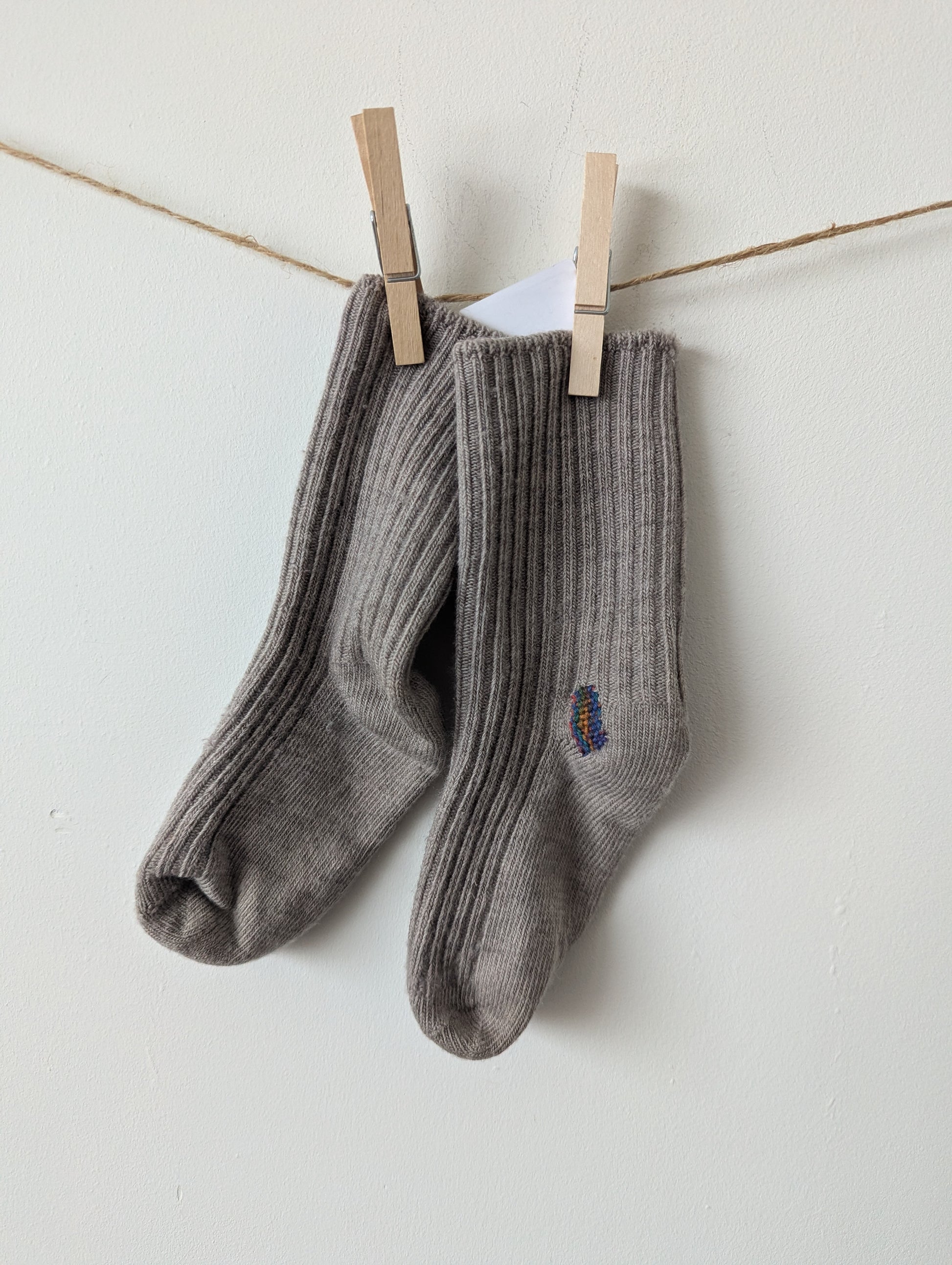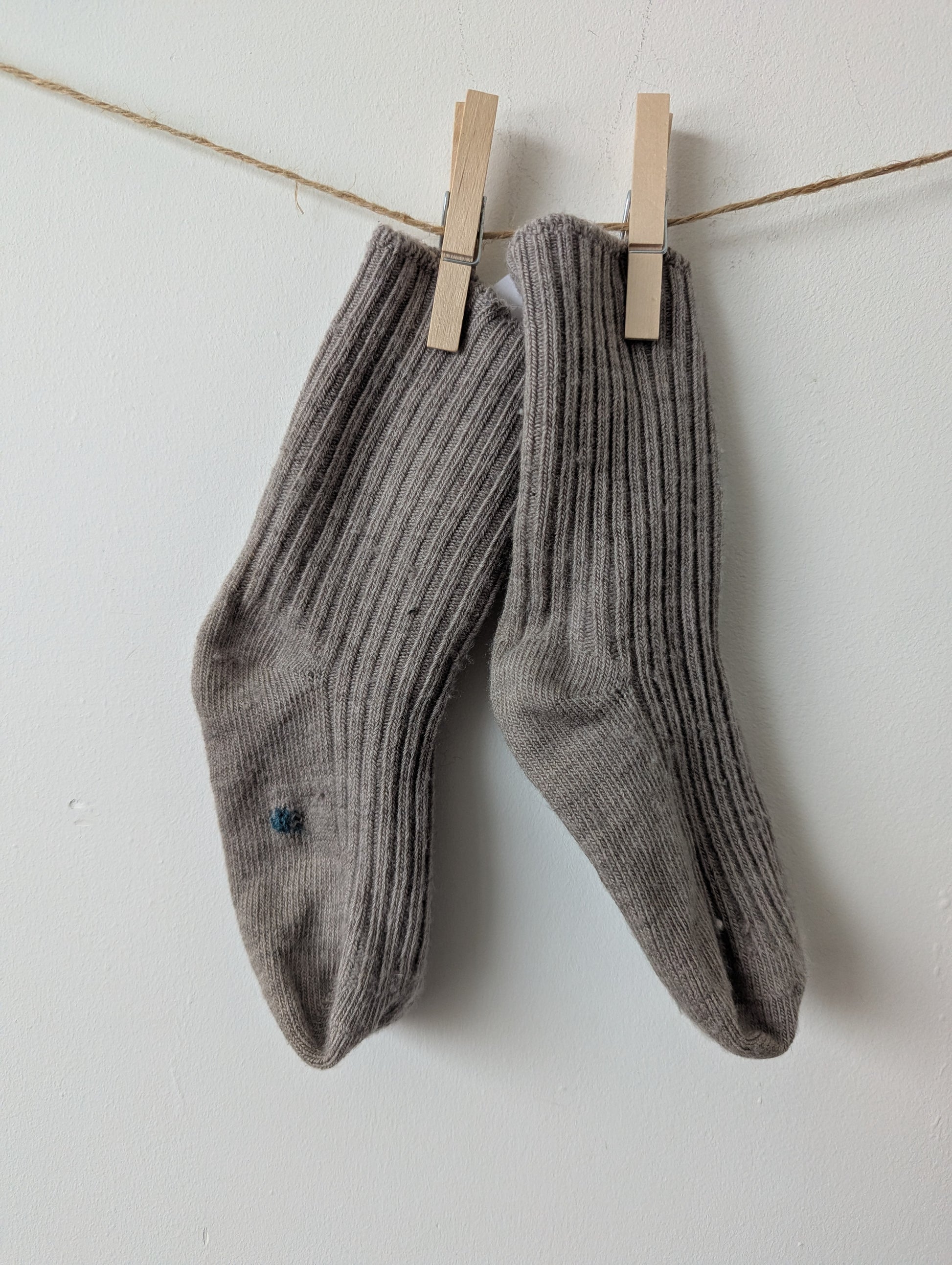 Zandkleurige sokken, zaten twee gaten in zijn gemaakt dmv gekleurd garen. Zie foto's
